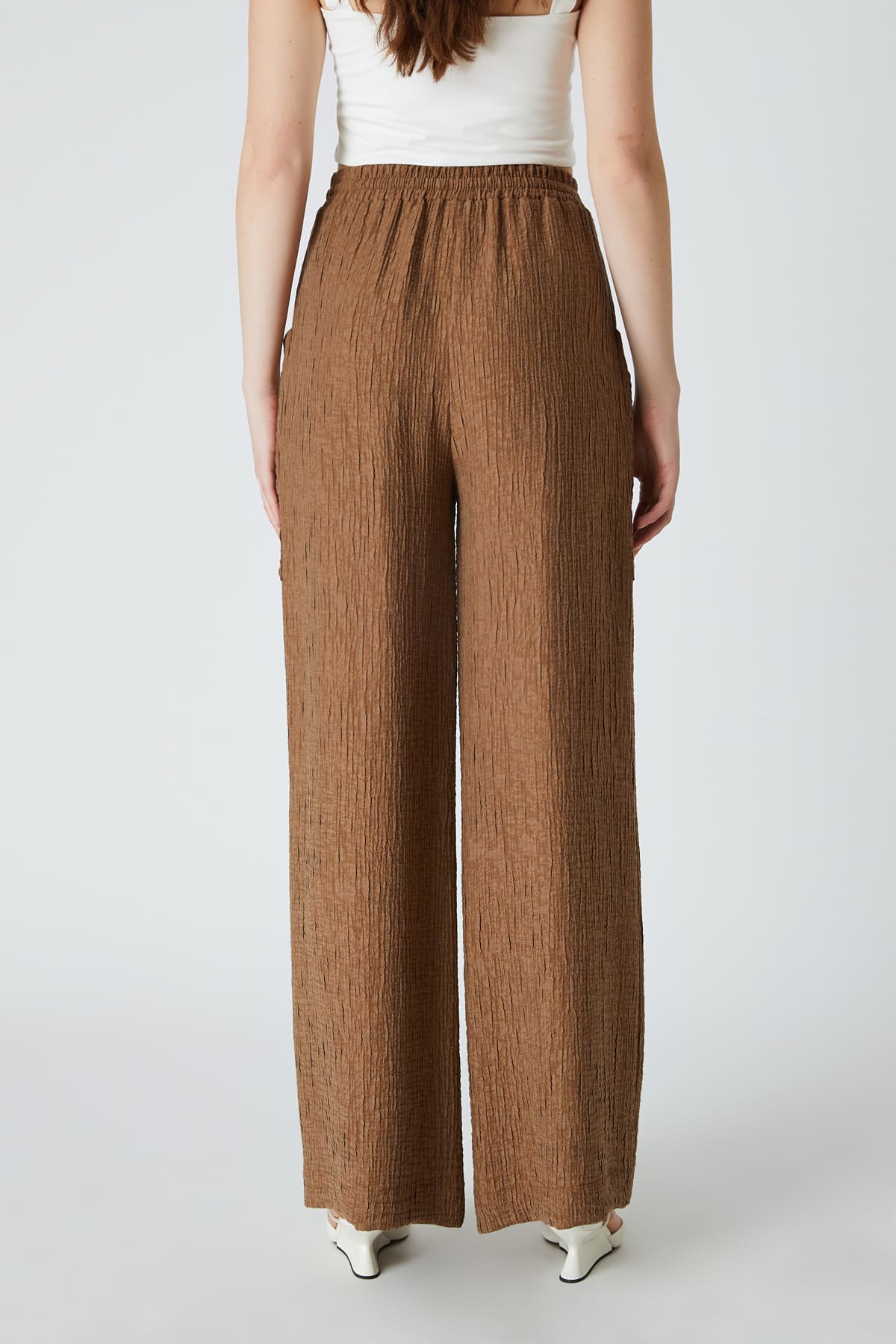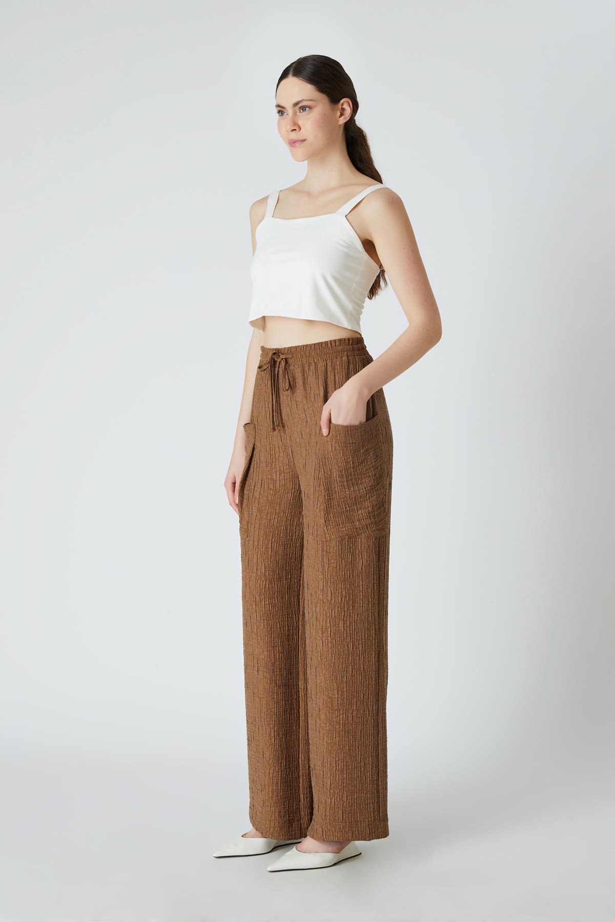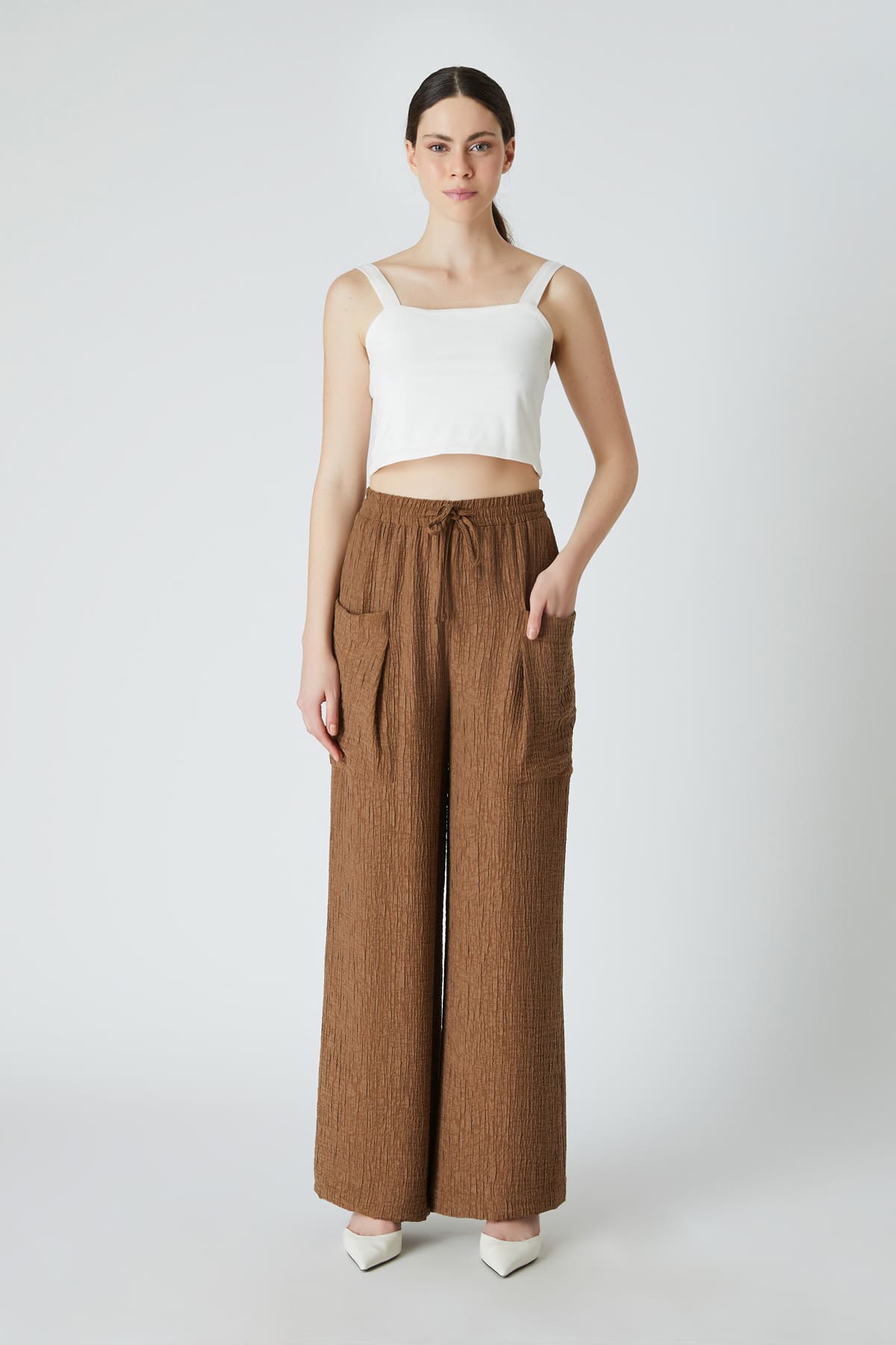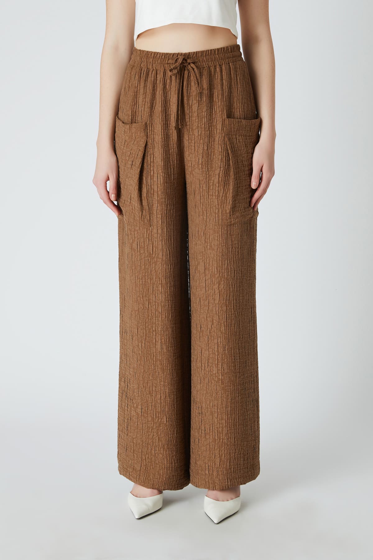 ÜRÜN BİLGİSİ:Viskon karışımlı kırınkıl kumaş,beli içten lastikli,büyük cep detaylı,önü bağcıklı,geniş paça pantolon.