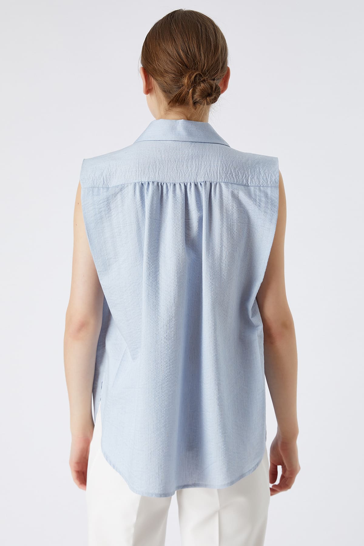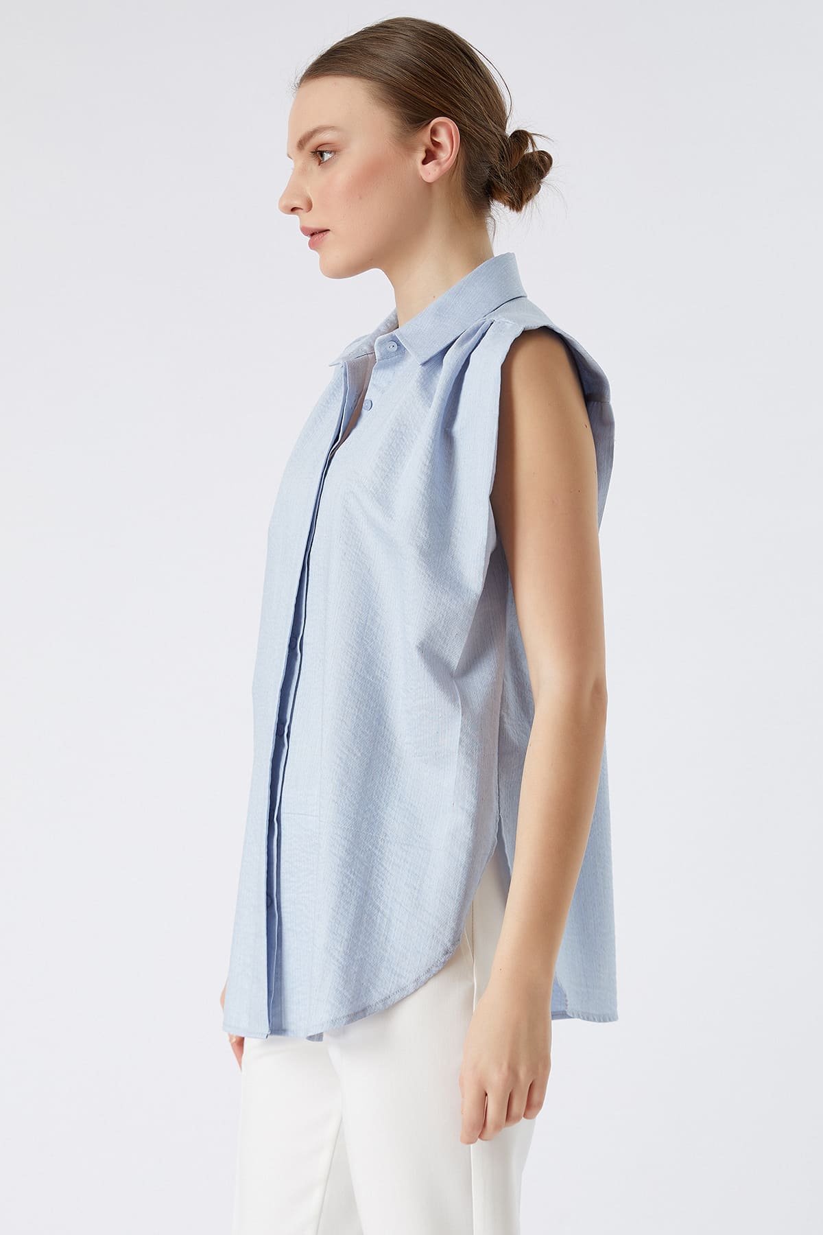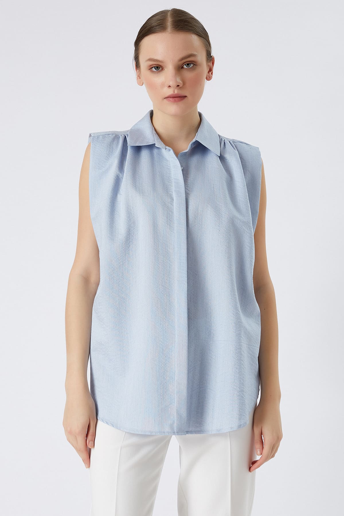 ÜRÜN BİLGİSİ:Dokulu pamuk ve viskon karışımlı kumaş,gizli patlı,kol ve yanı katlama detaylı,rahat form gömlek