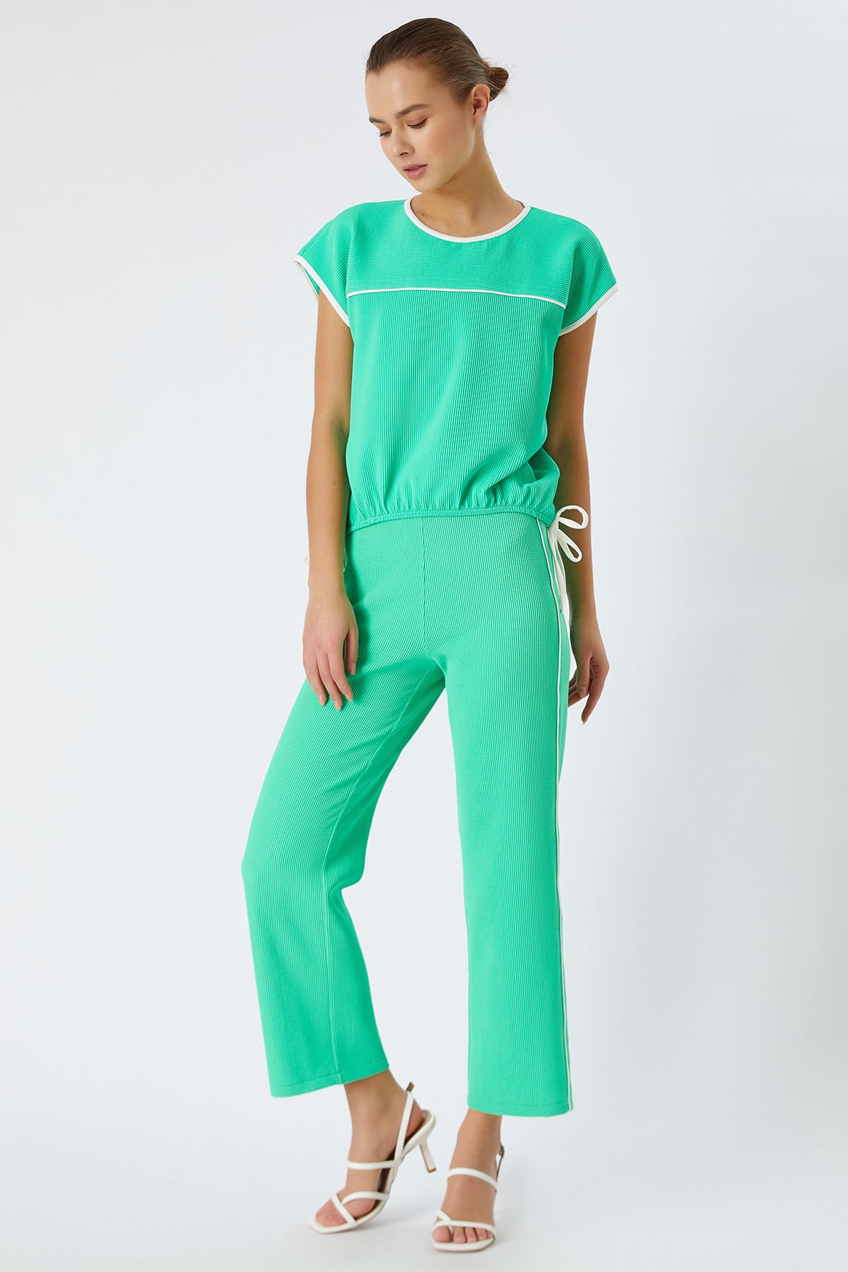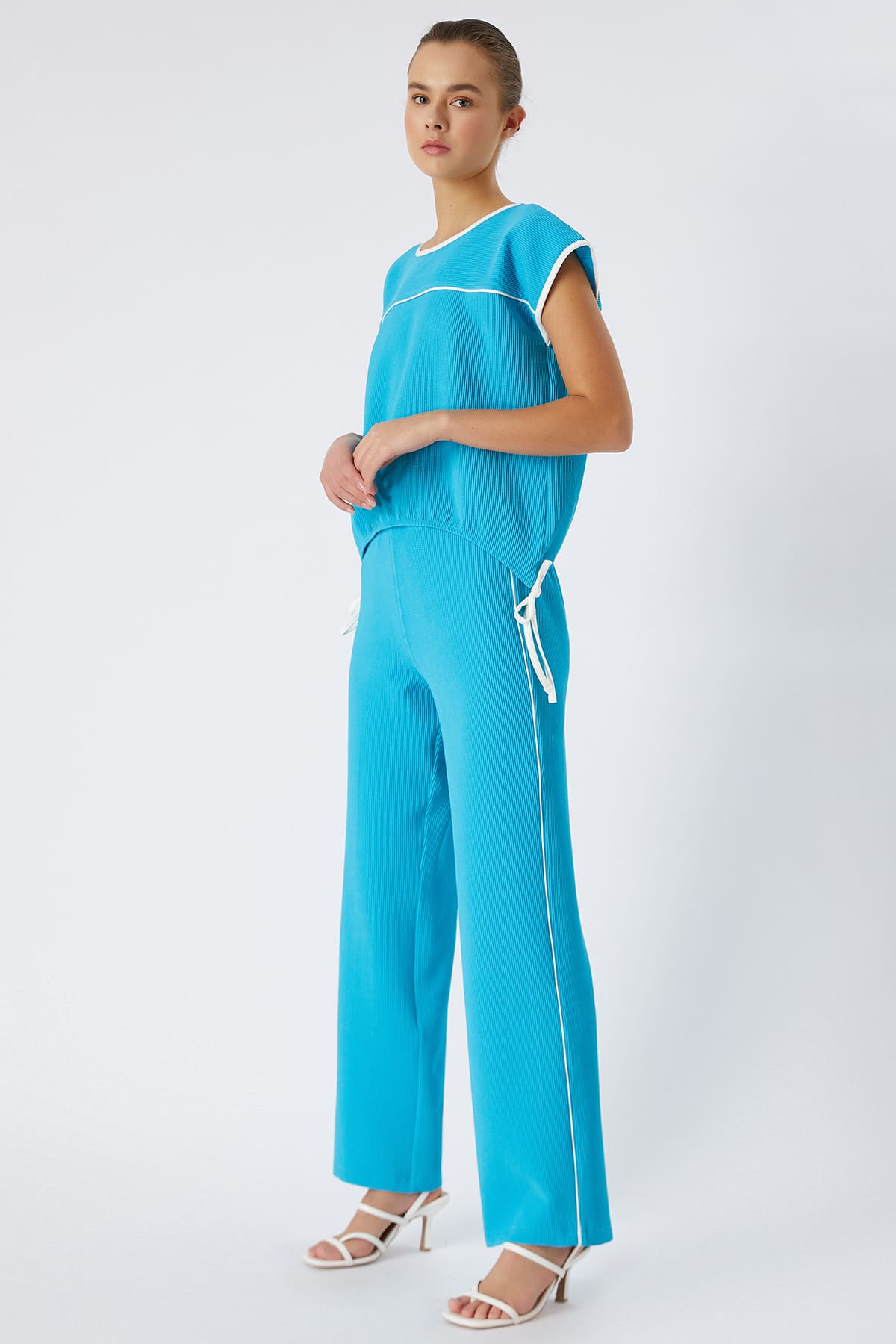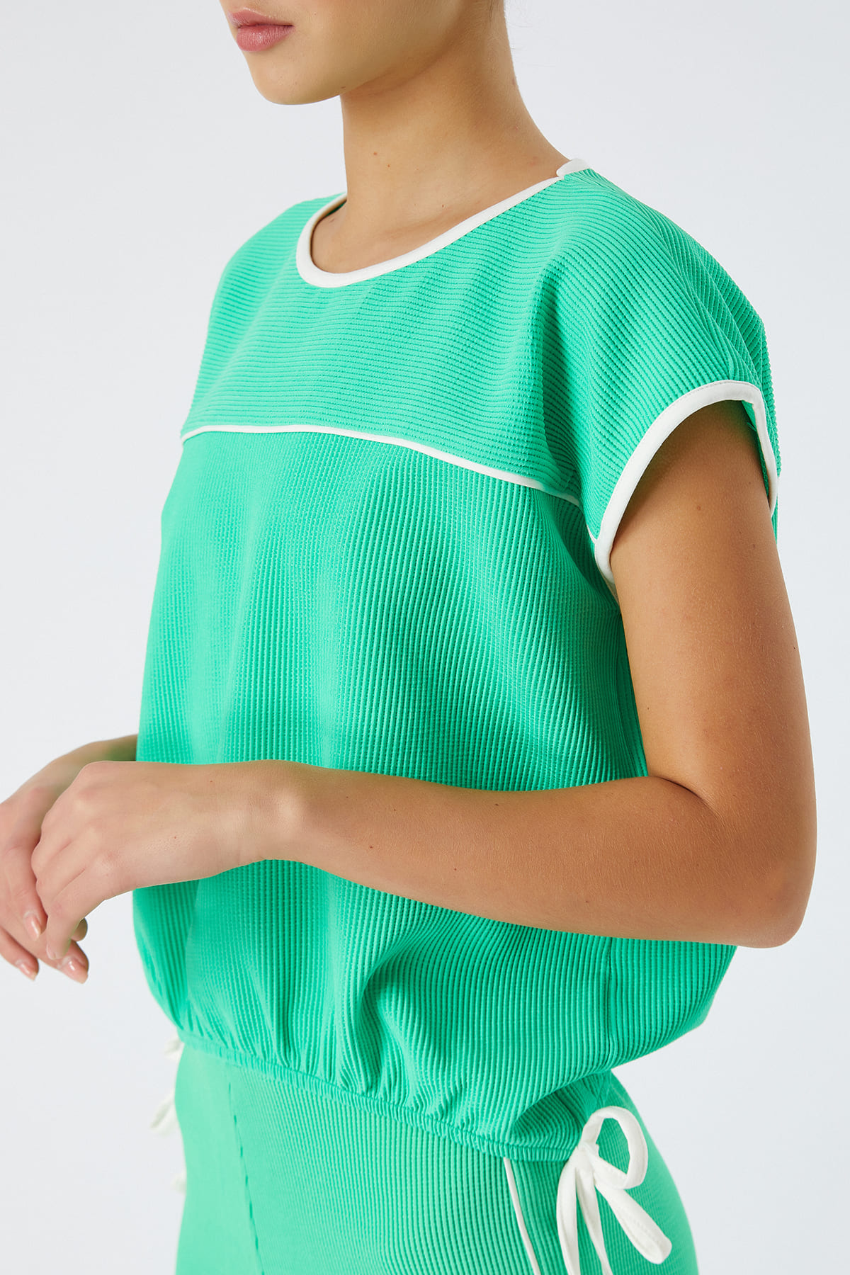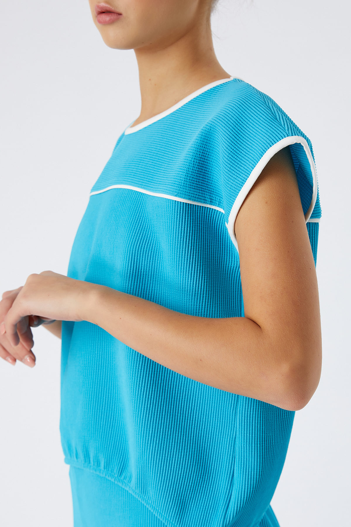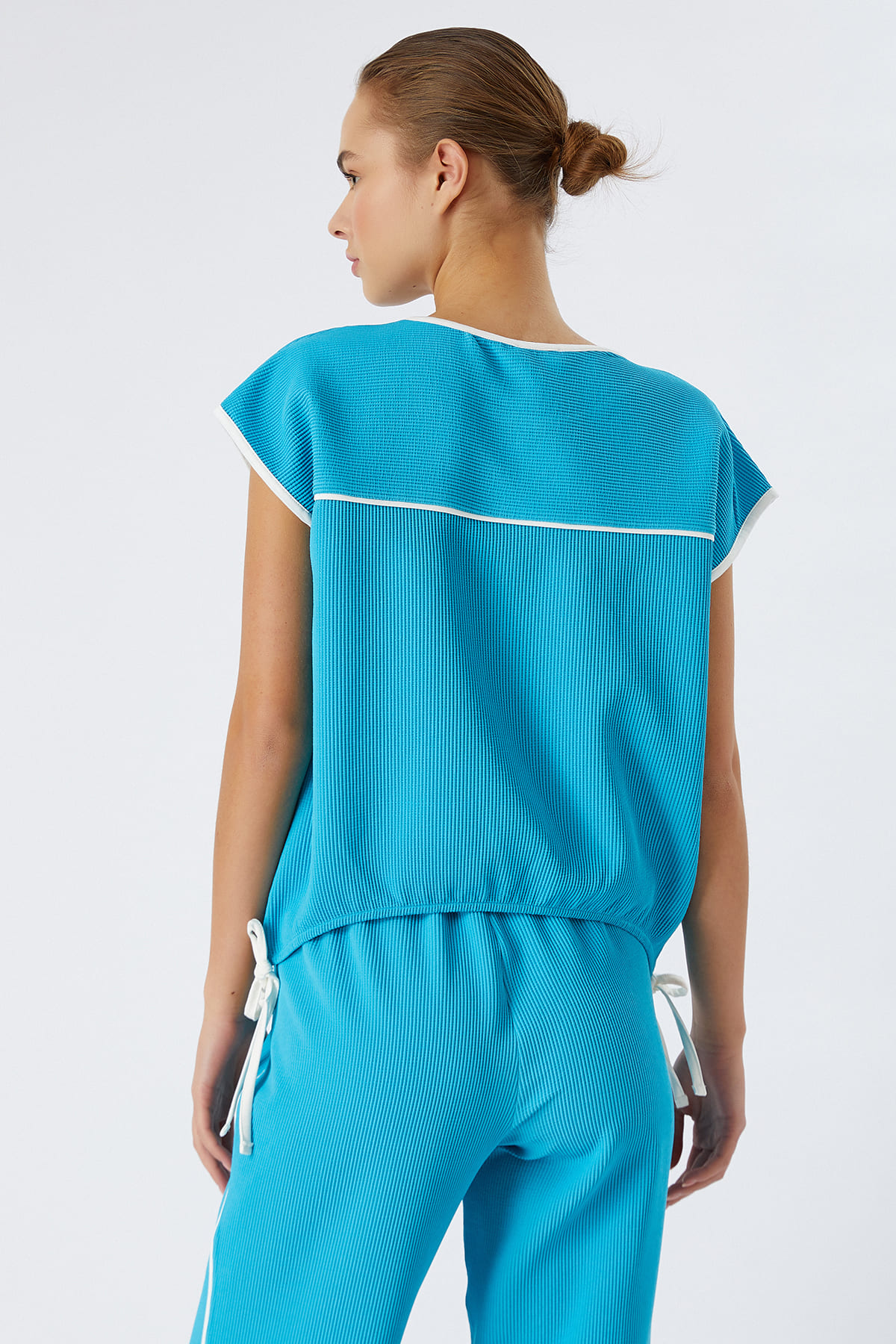ÜRÜN BİLGİSİ:Kaşkorse dokulu örme kumaş,hafif düşük kollu,farklı renkte biye geçişli,etek uçları bağcıklı,spor form bluz