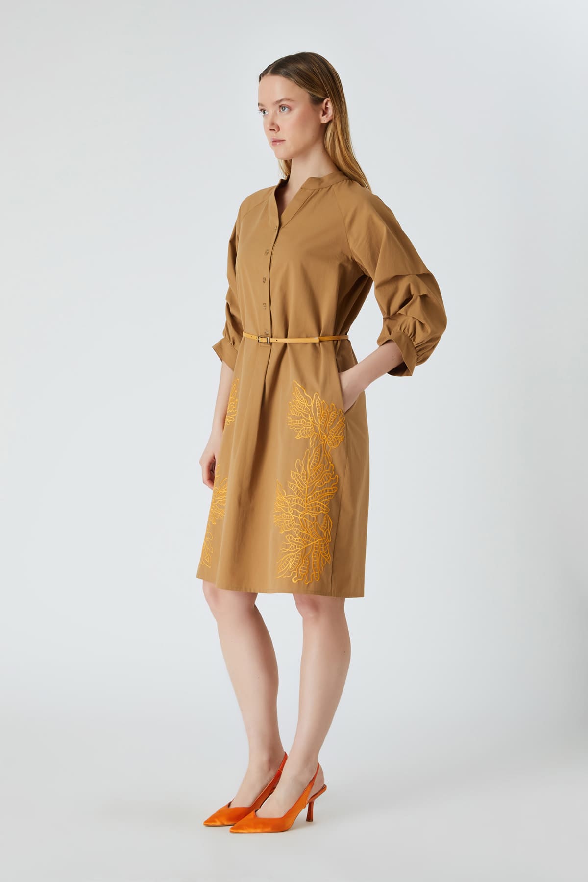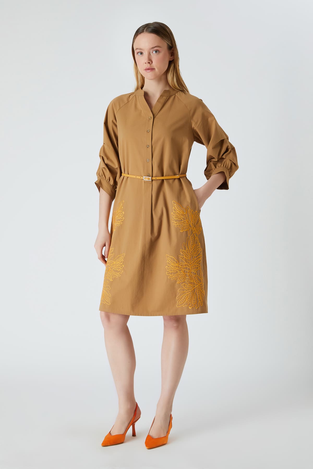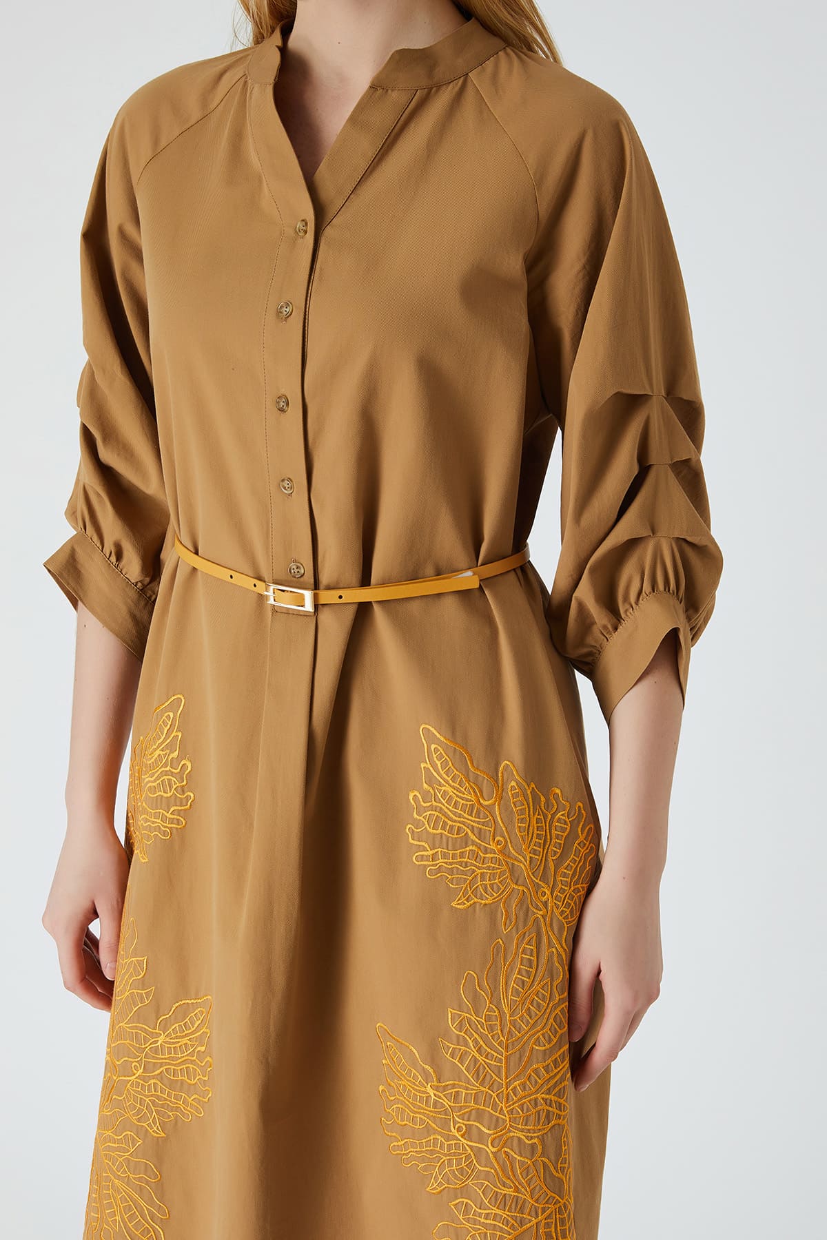 ÜRÜN BİLGİSİ:Pamuklu kumaş,açık hakim yakalı,reglan kollu,düğme kapamalı,kontrast renkte nakışlı,kemerli,kol ortası dikiş katlamalı,