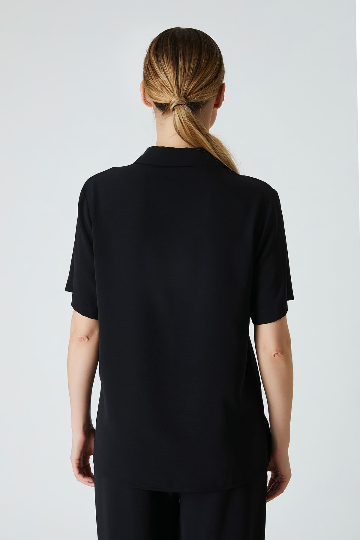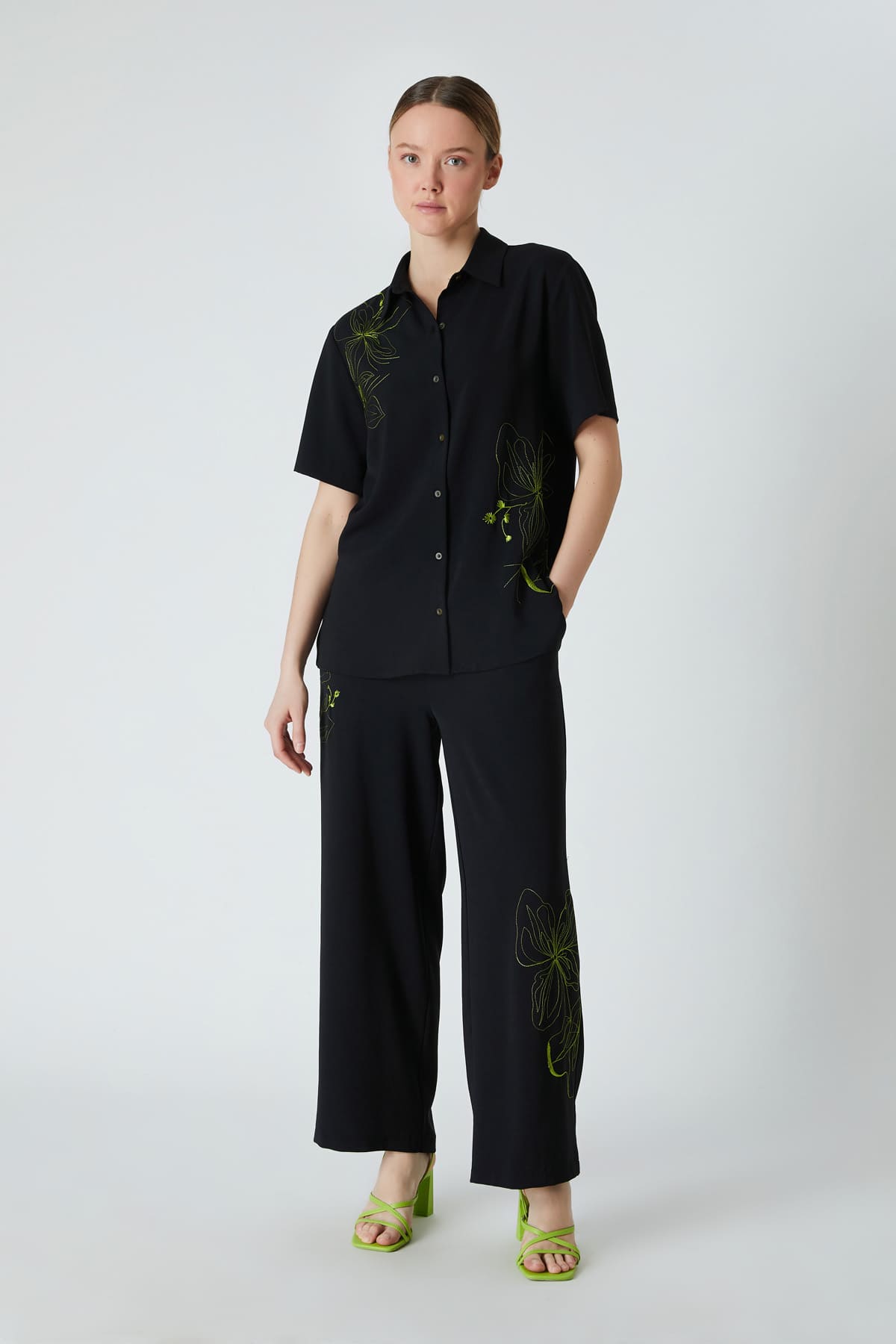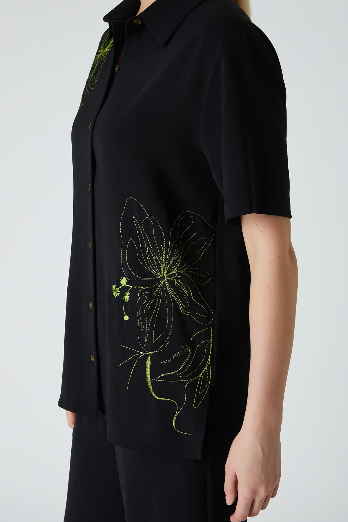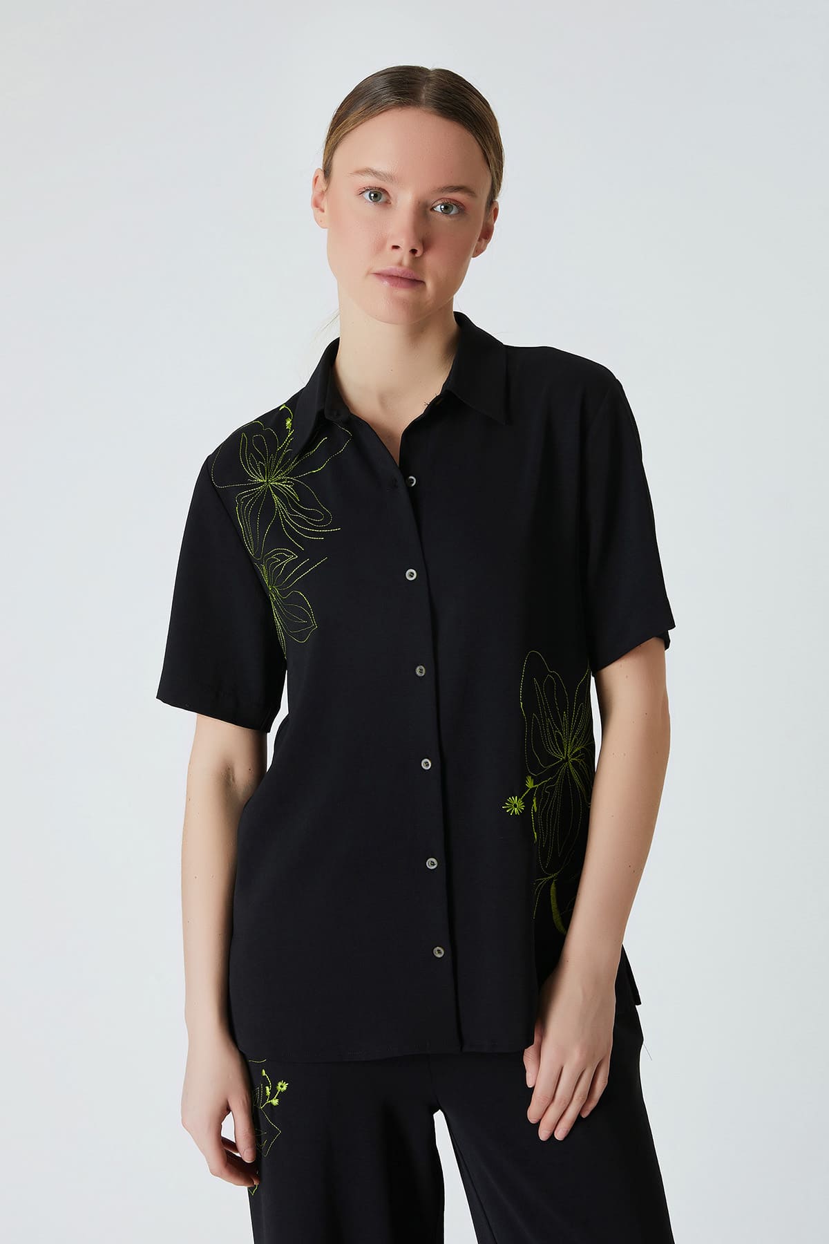 ÜRÜN BİLGİSİ:Dökümlü kumaş,yakalı,yarım kol,düğme kapamalı,kontrast nakışlı,yanı yırtmaç detaylı,düz form gömlek.