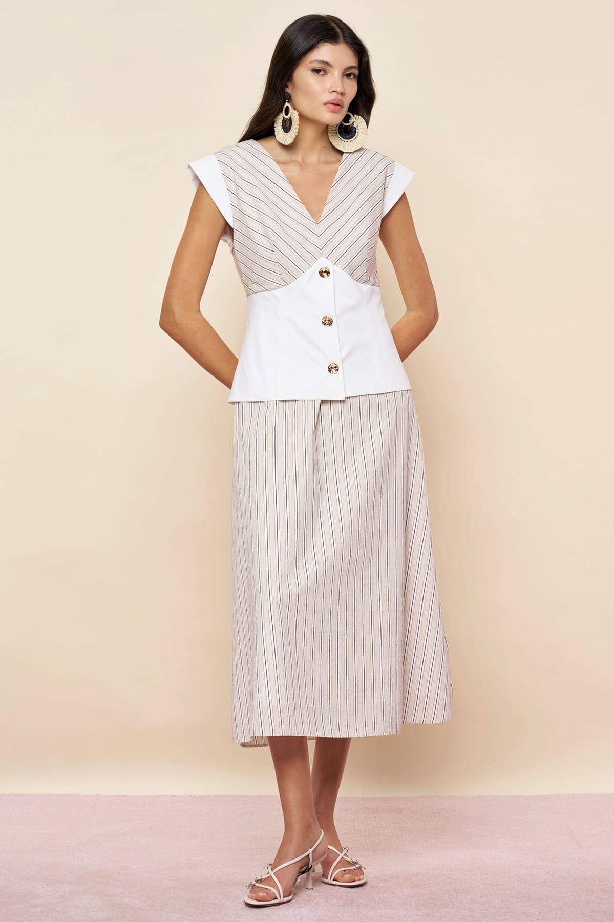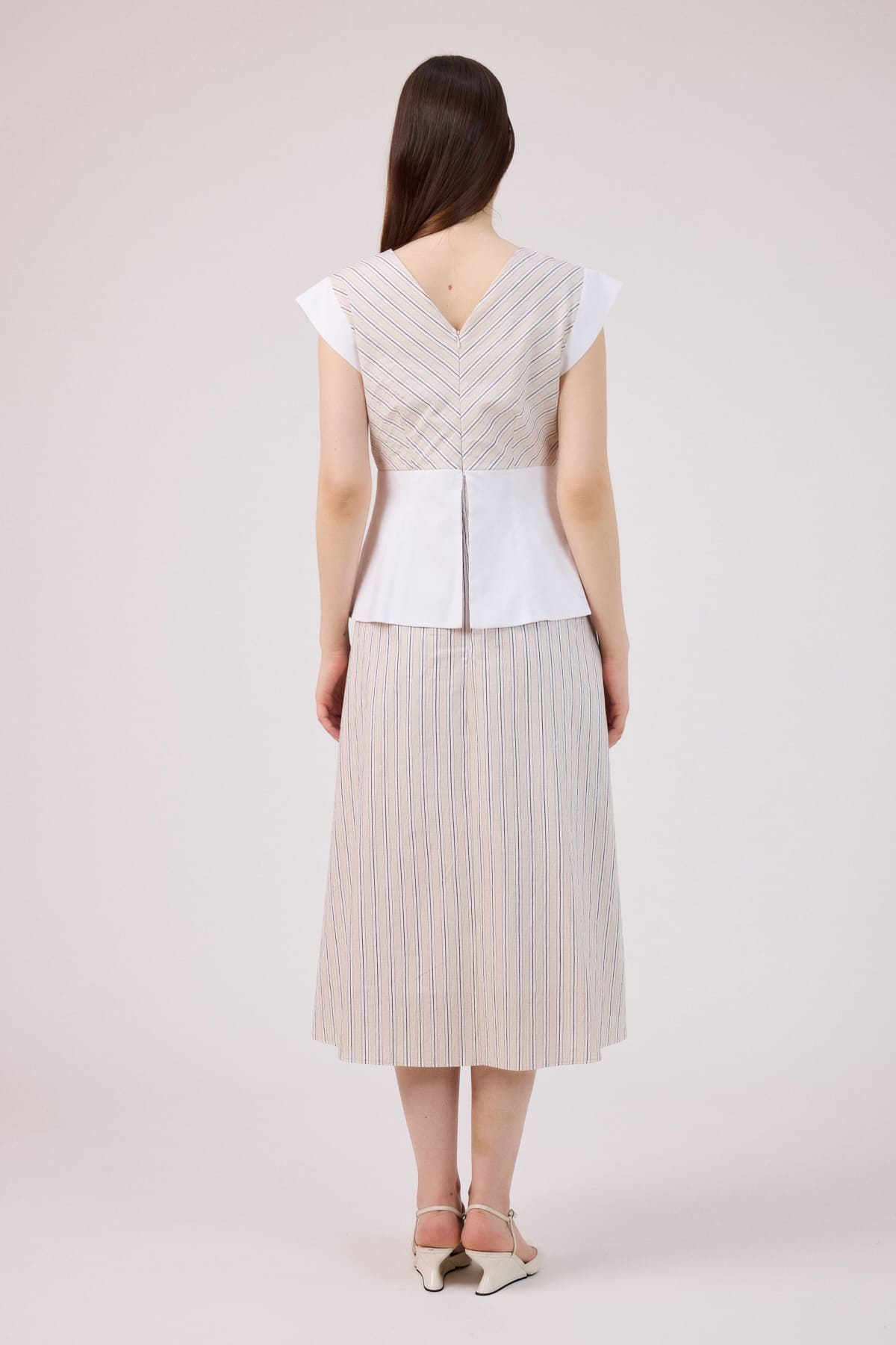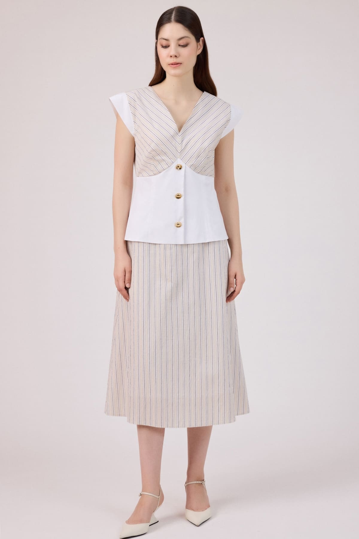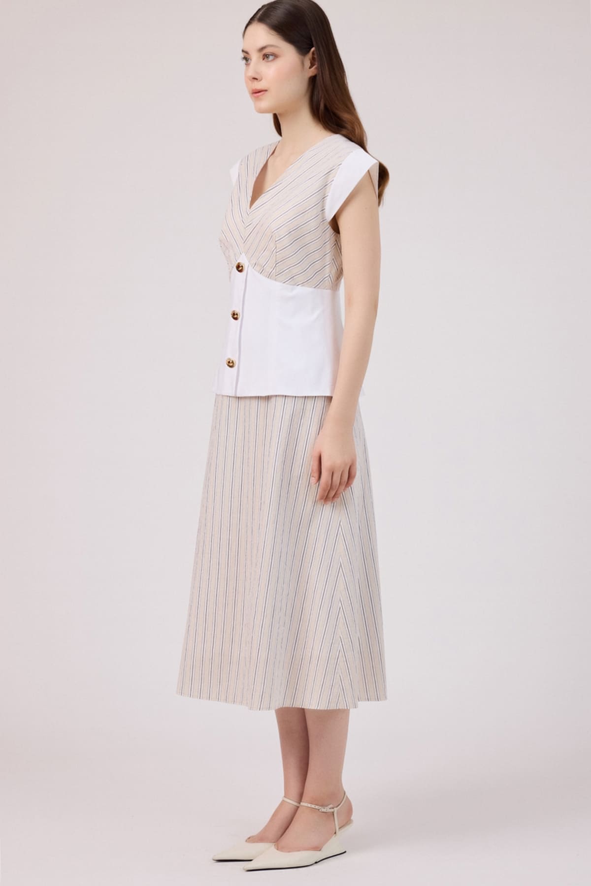 ÜRÜN BİLGİSİ:Uyumlu renkte ince çizgili poplin kumaş,hafif düşük kolu bantlı,korsajı düz poplin kumaş geçişli,süs altın düğmeli,astarlı elbise