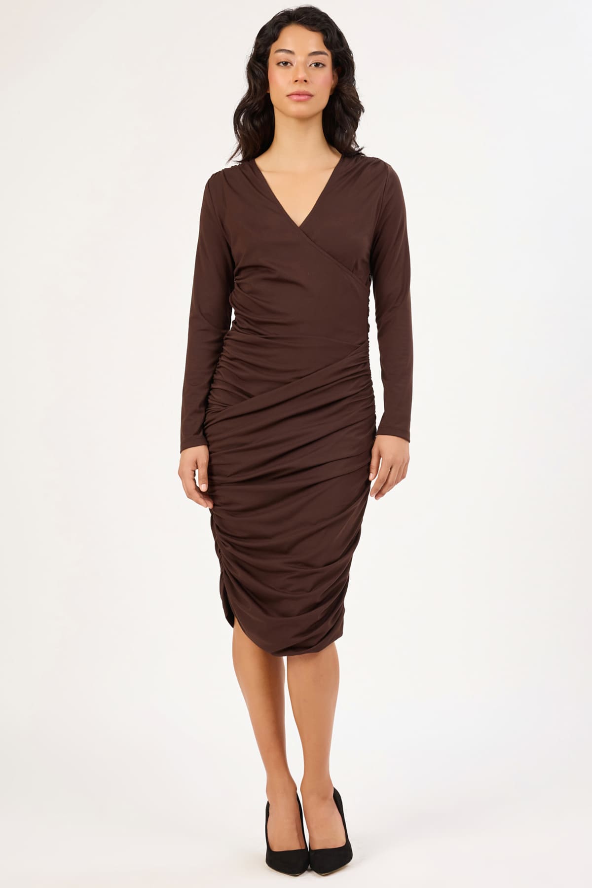 ÜRÜN BİLGİSİ:Doğal iplikli viskon karışımlı soft dokulu örme kumaş,kruvaze yakalı,yanlarıbüzgü detaylı uzun kollu örme elbise