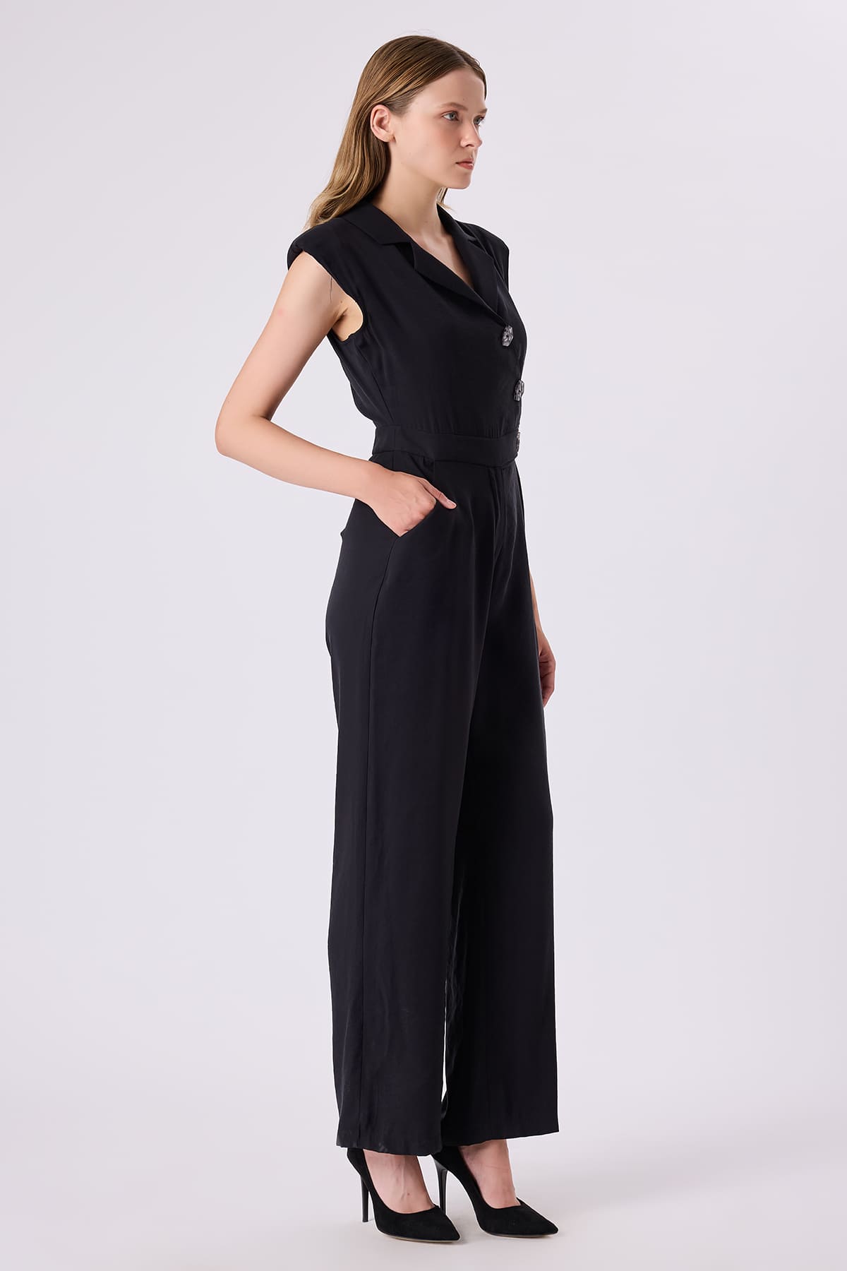 ÜRÜN BİLGİSİ:Dökümlü kumaş,kruvaze yakalı,kolsuz,yan cepli,fermuarlı,vatkalı,asimetrik düğmeli,düz paça rahat tulum.