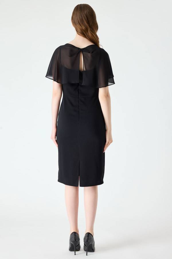 ÜRÜN BİLGİSİ:Yumuşak dokulu dökümlü kumaş,yuvarlak yakalı,kolları şifon detaylı,belden bağlamalı,astarlı şık elbise.