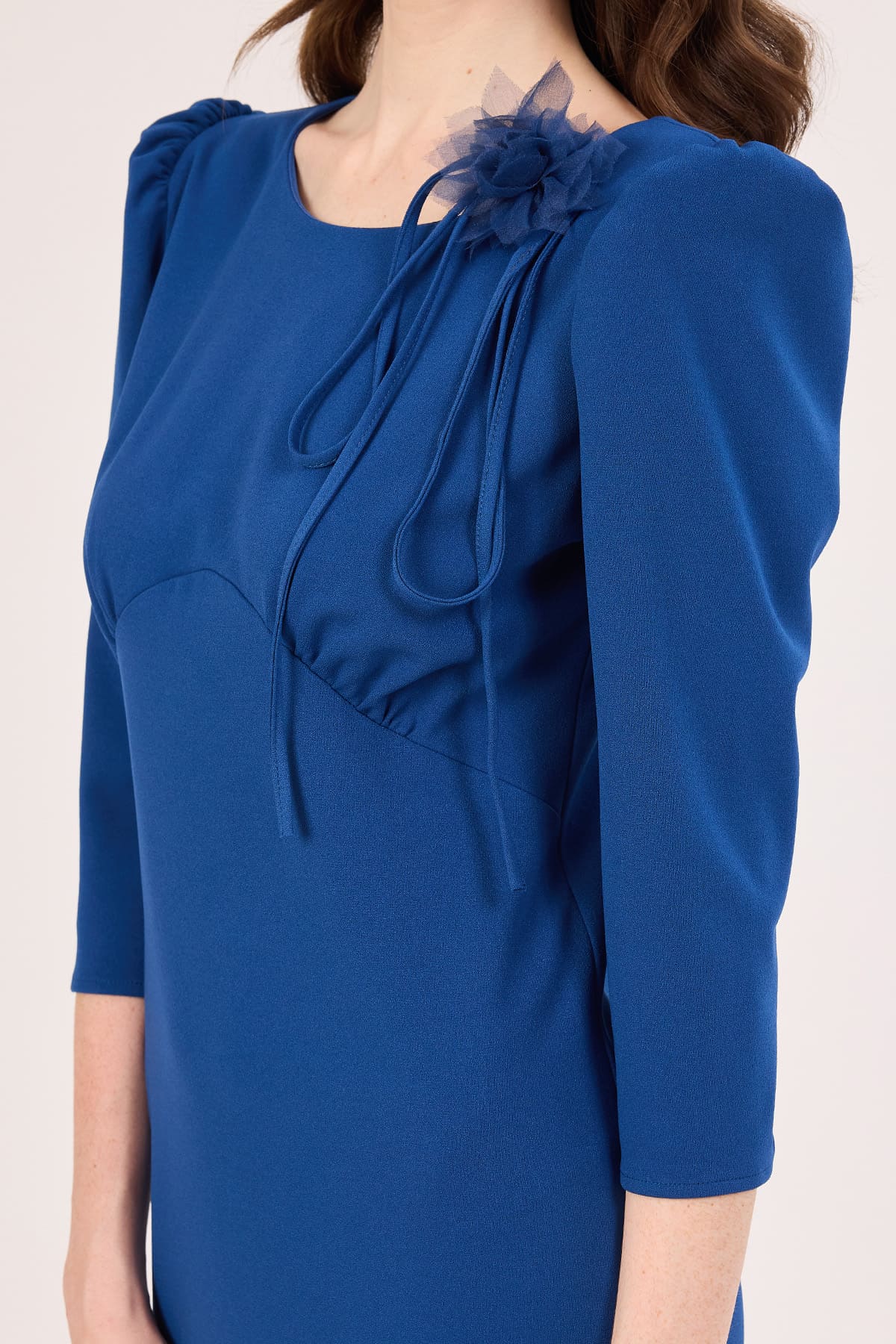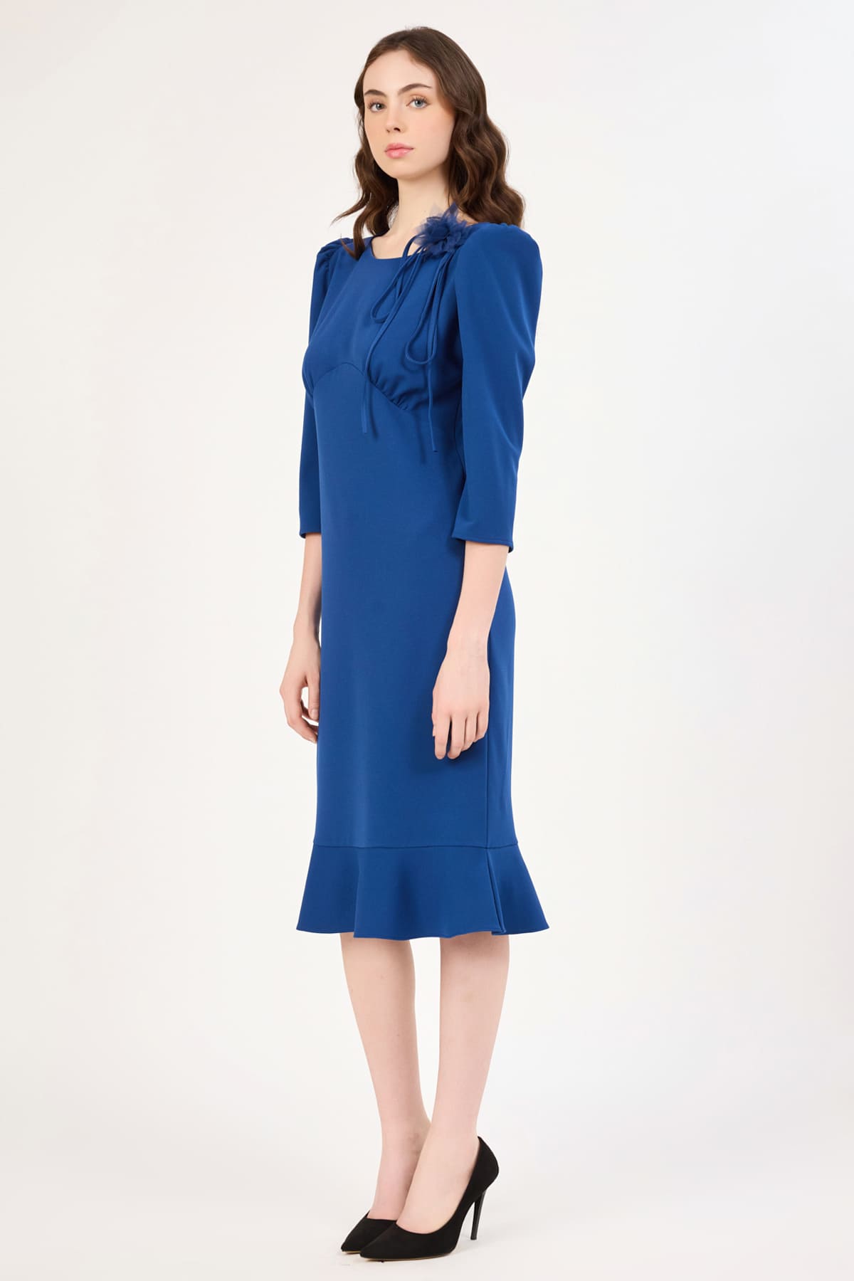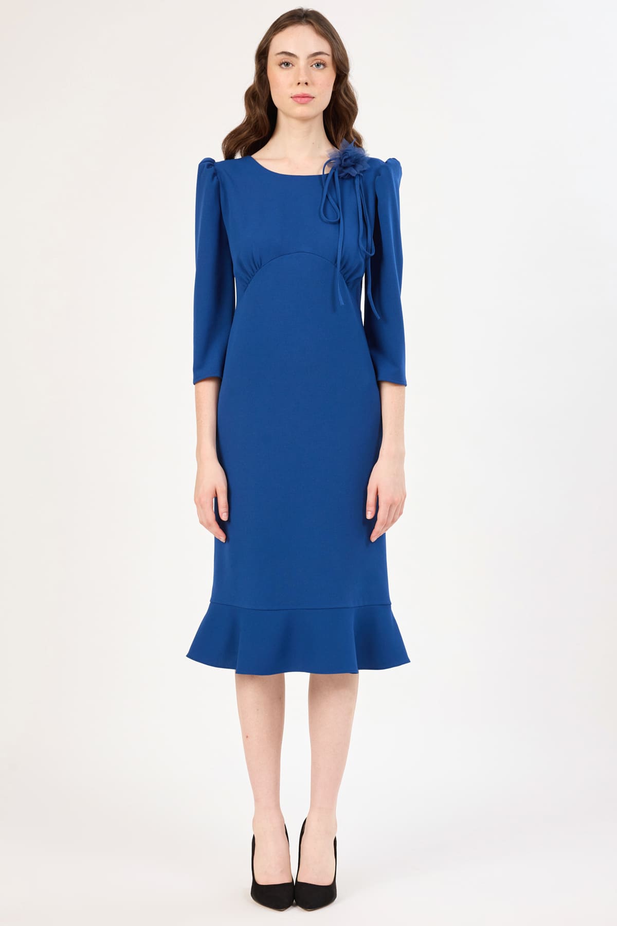 ÜRÜN BİLGİSİ:Krep dokulu hafif esnek örme kumaş,organza kumaş geçişli ve volan detaylı,çiçek broşlu,astarlı elbise