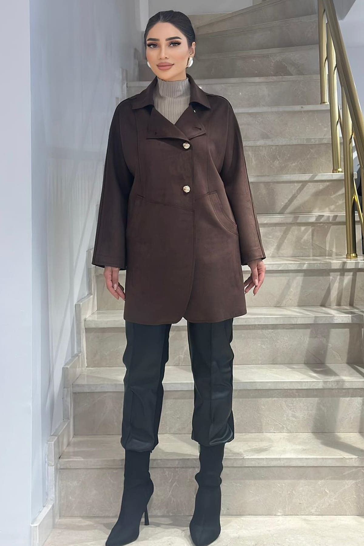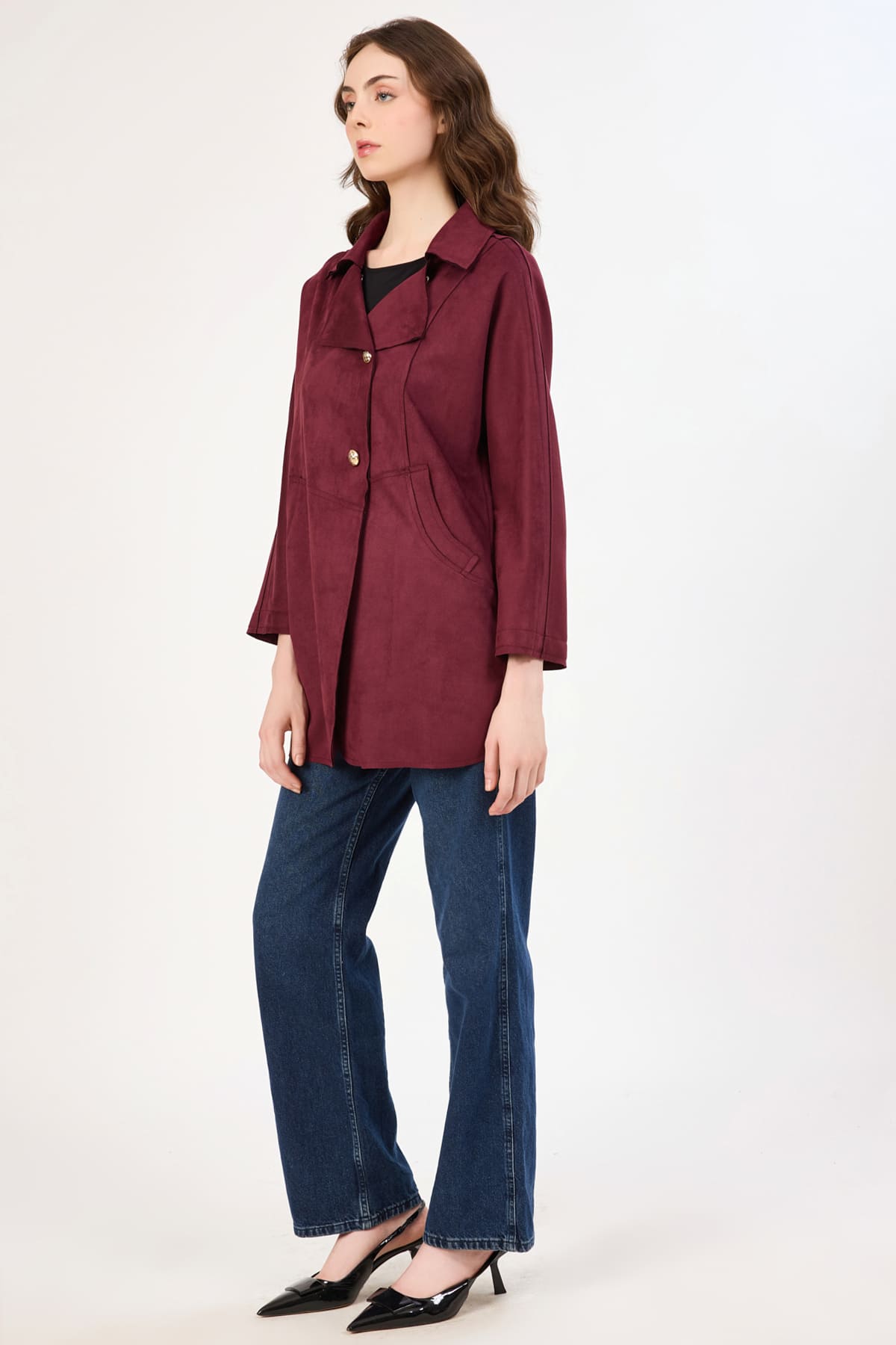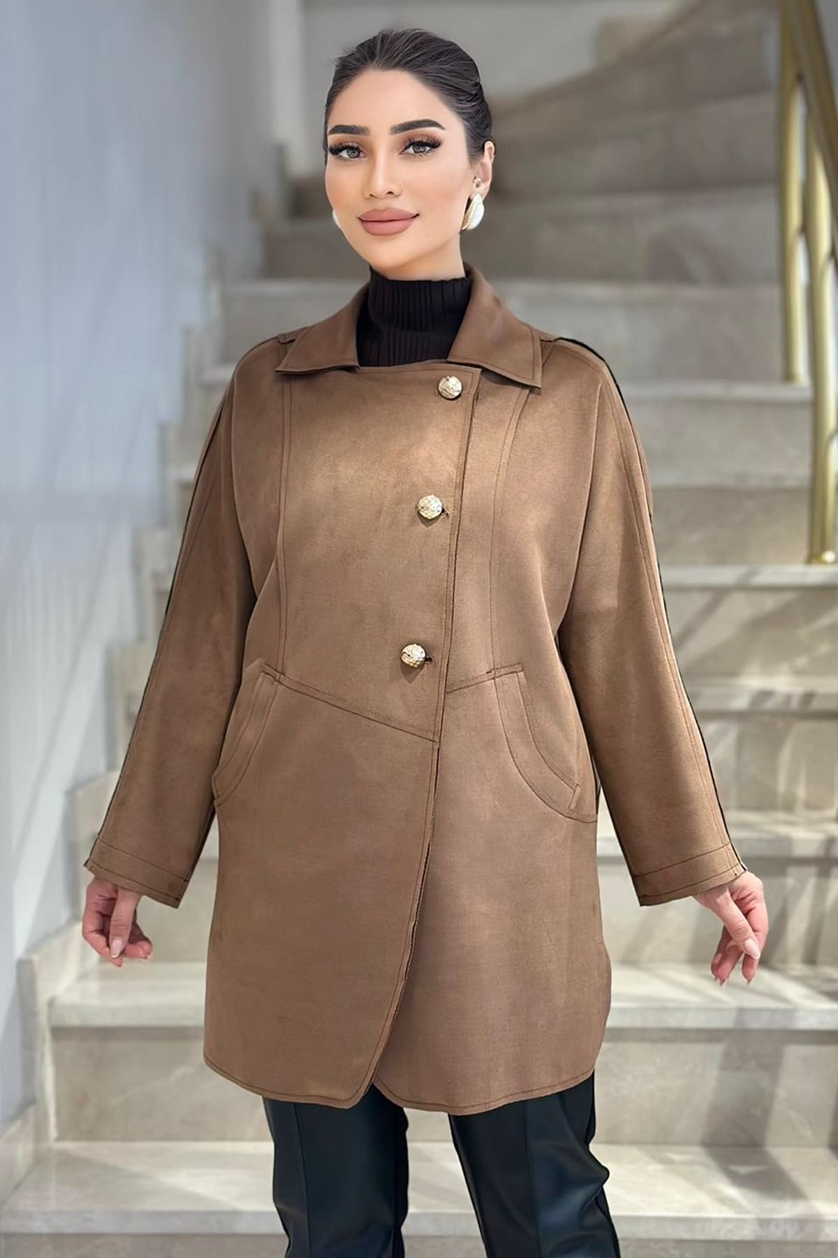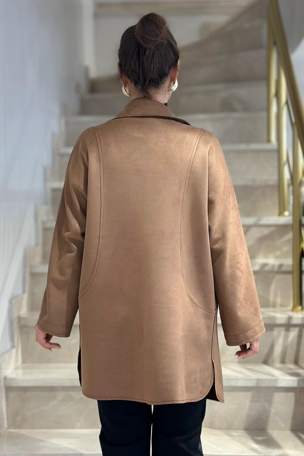 ÜRÜN BİLGİSİ:Süet görünümlü,soft yüzeyli kumaş,yakalı,cepli,düşük kollu,rahat form,astarsız kap