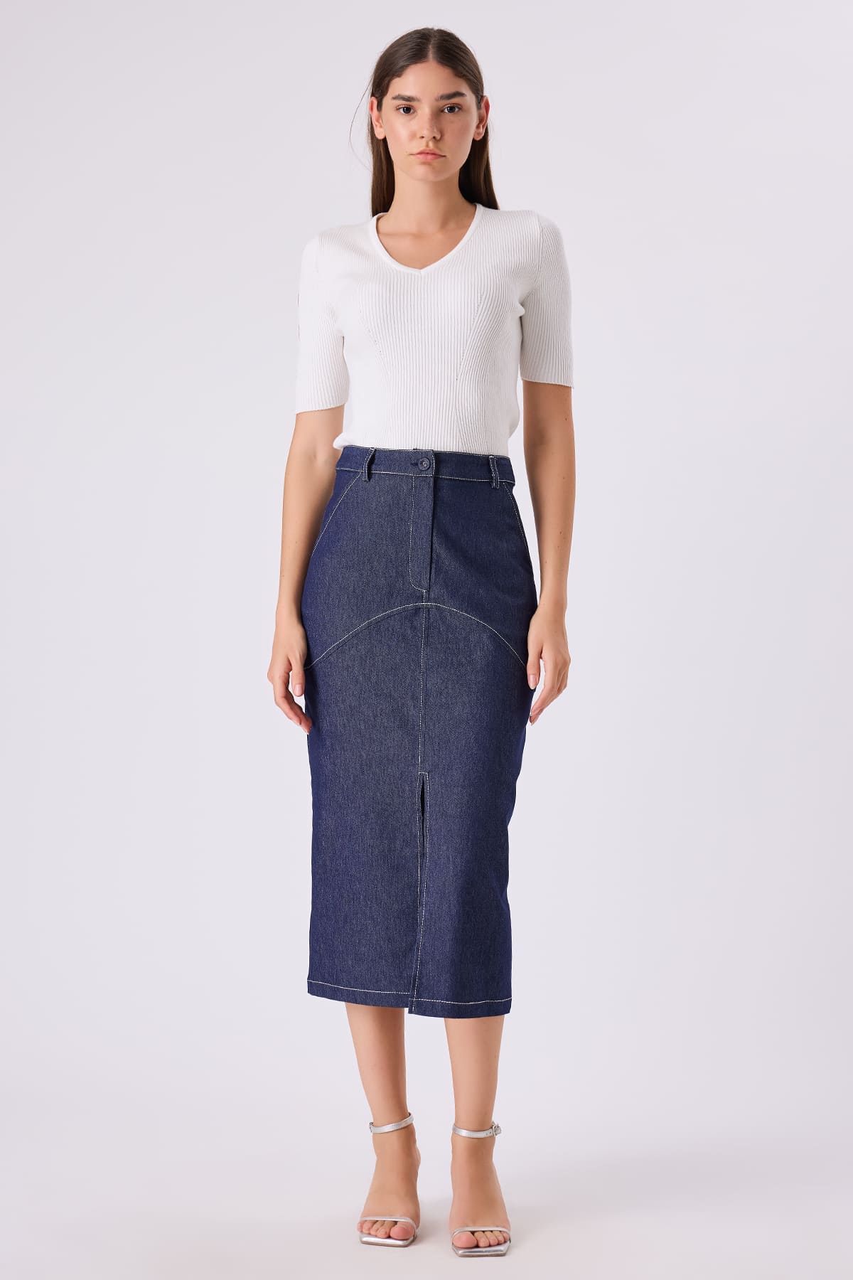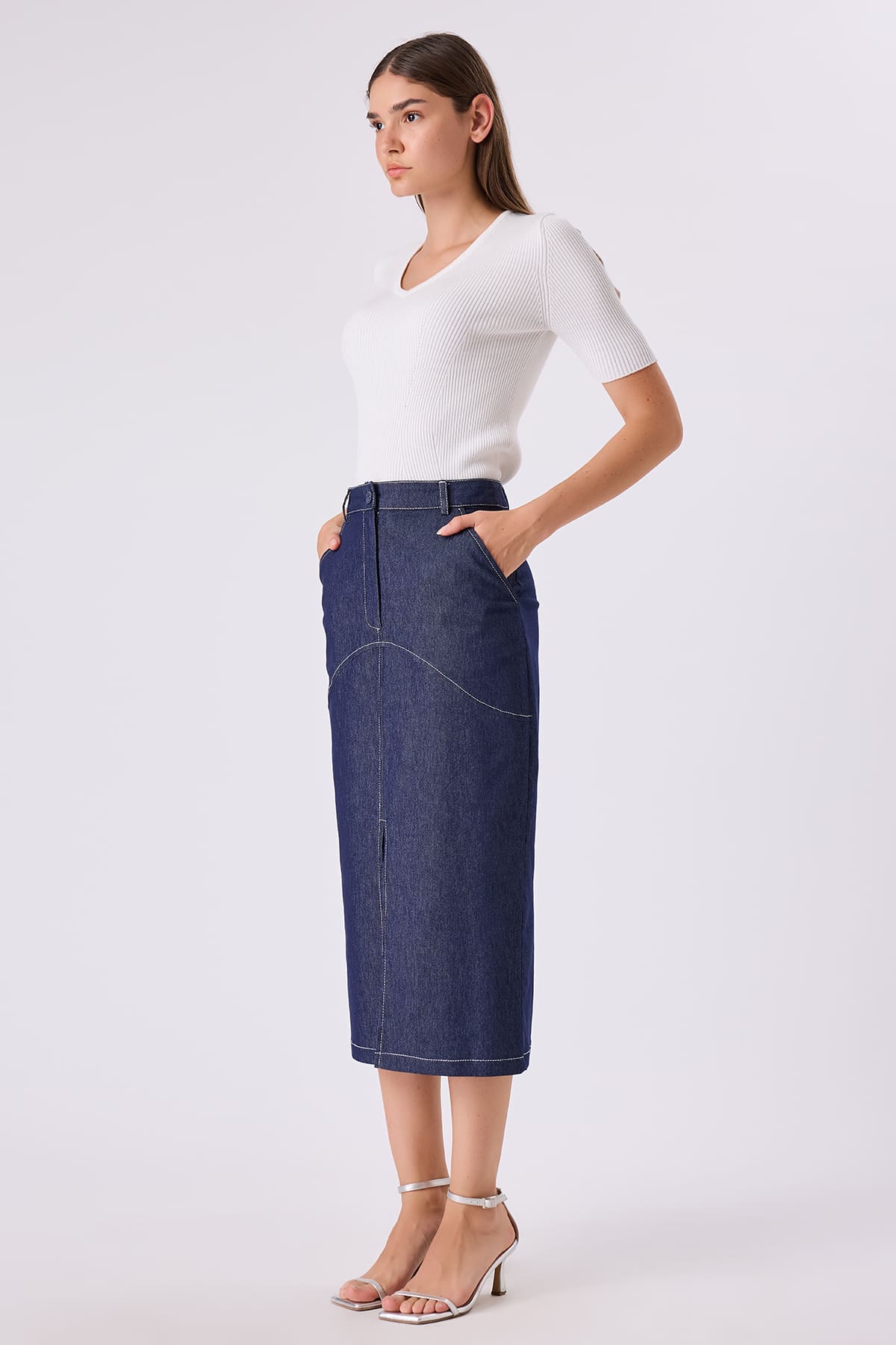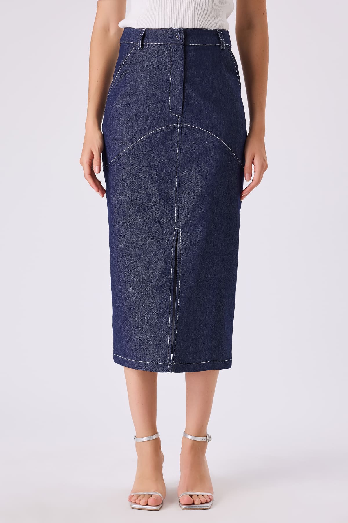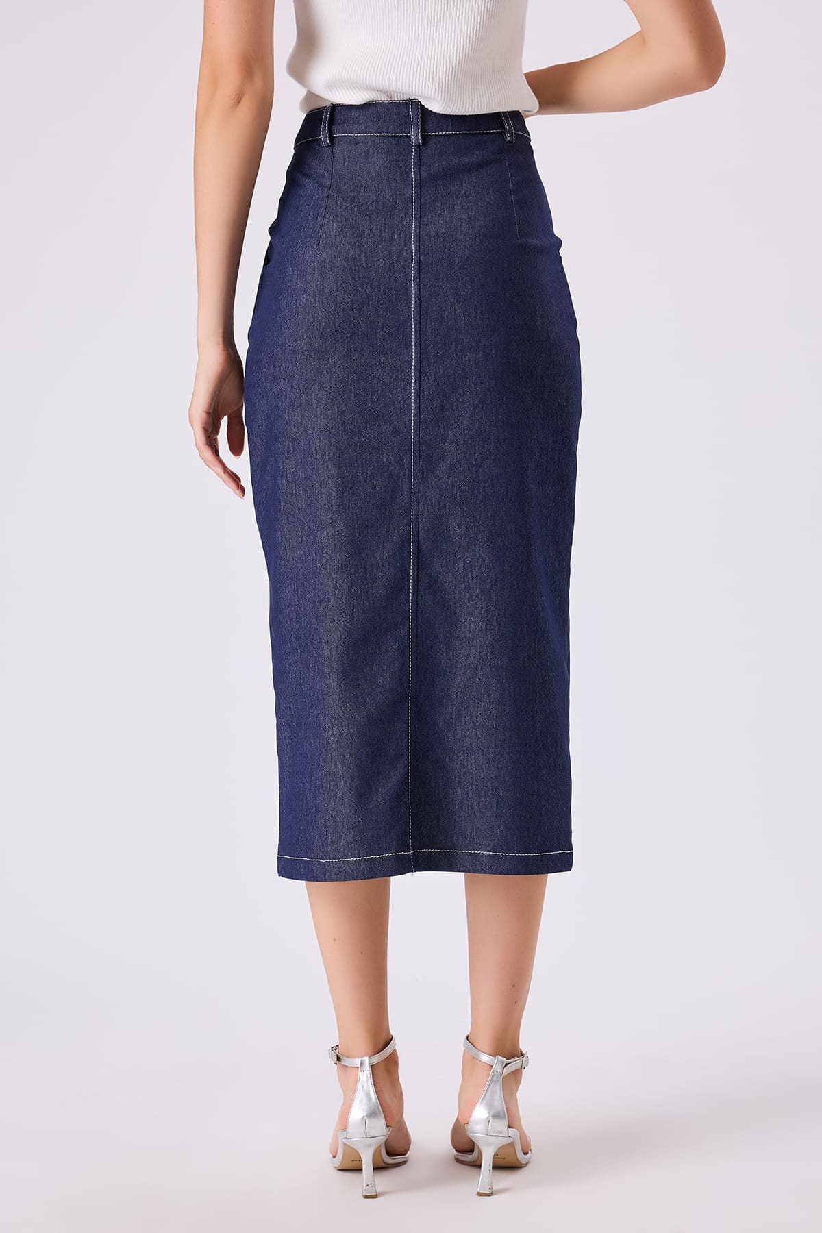 ÜRÜN BİLGİSİ:Pamuk içerikli denim kumaş,normal bel,cepli,önü yırtmaç detaylı,midi boy etek.