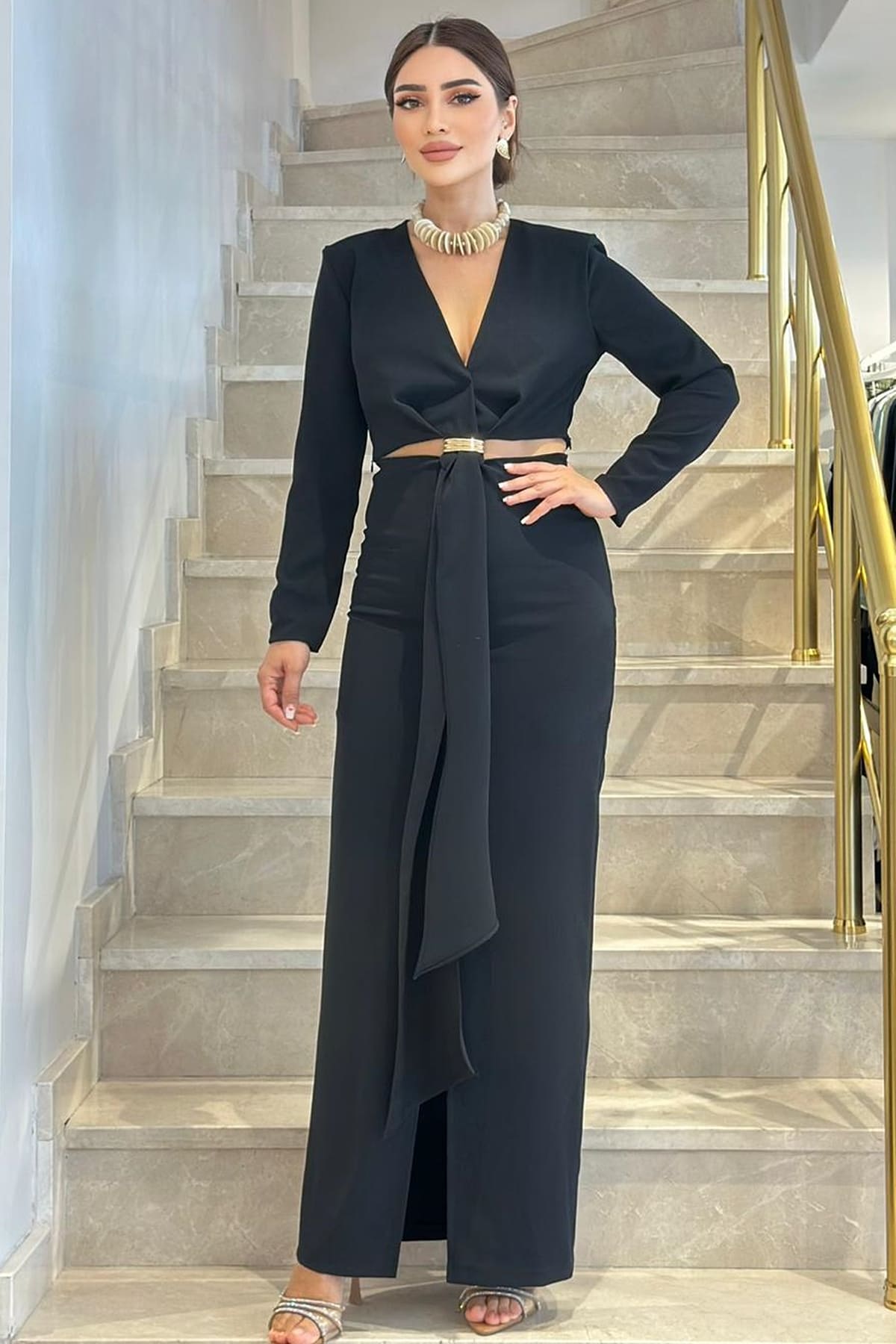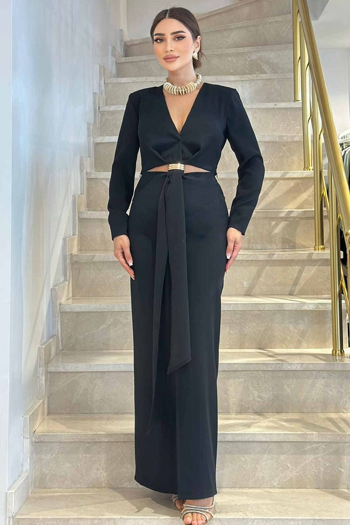 ÜRÜN BİLGİSİ:Nefes alabilir dökümlü yeni nesil krep kumaş,v yakalı,yanları pencere detaylı,yırtmaçlı,astarlı şık elbise.