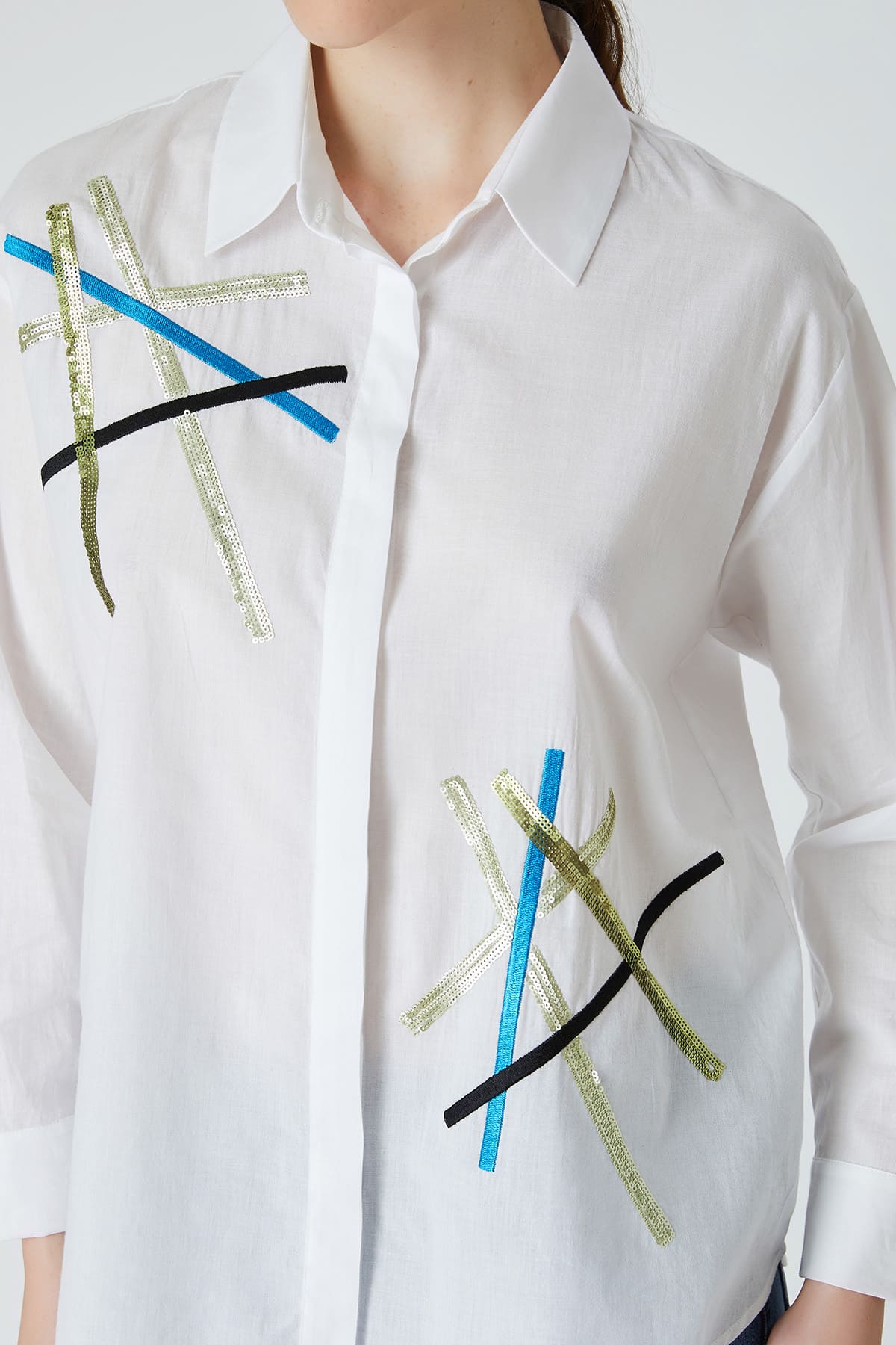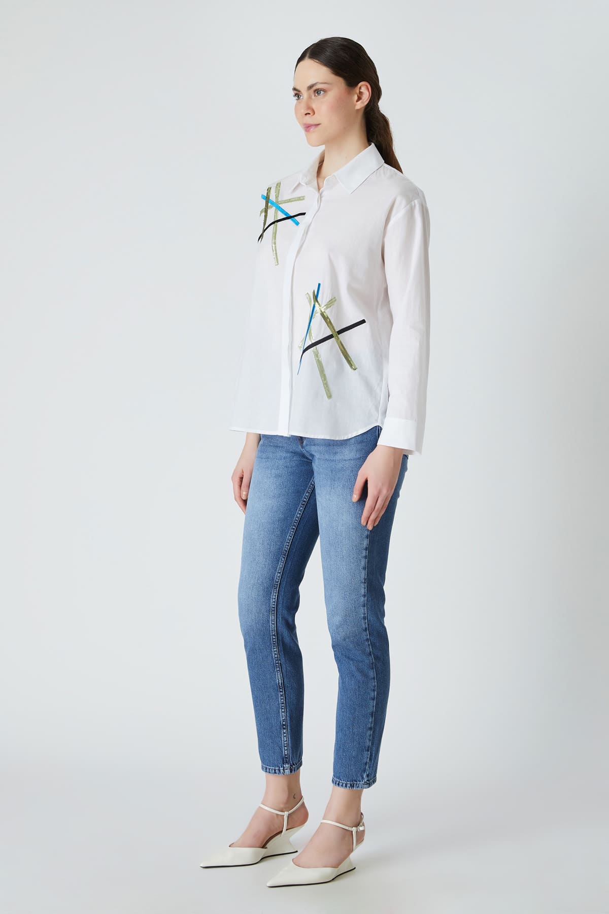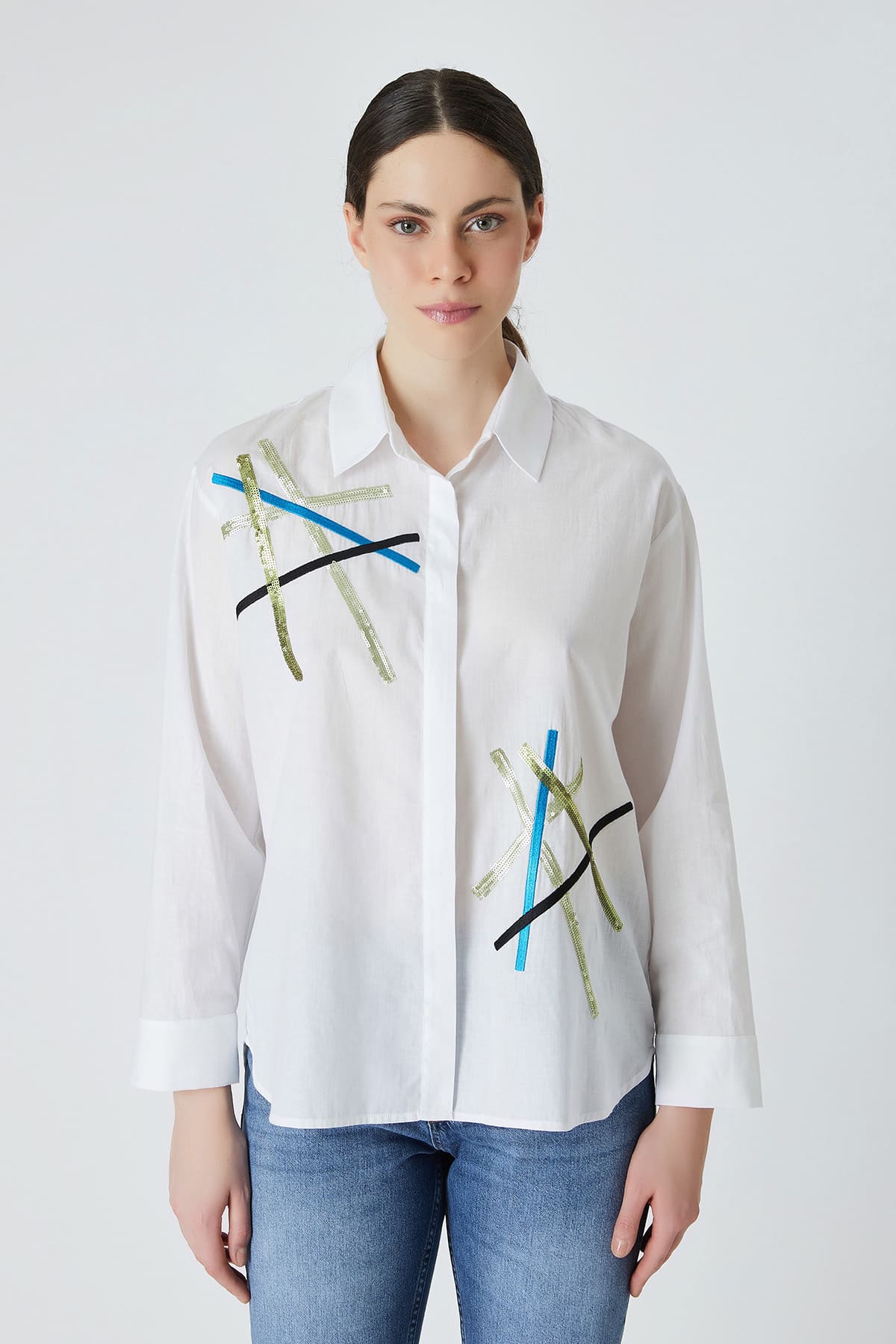 ÜRÜN BİLGİSİ:Pamuk karışımlı kumaş,gizli patlı,önü kontrast nakışlı,düz form gömlek.