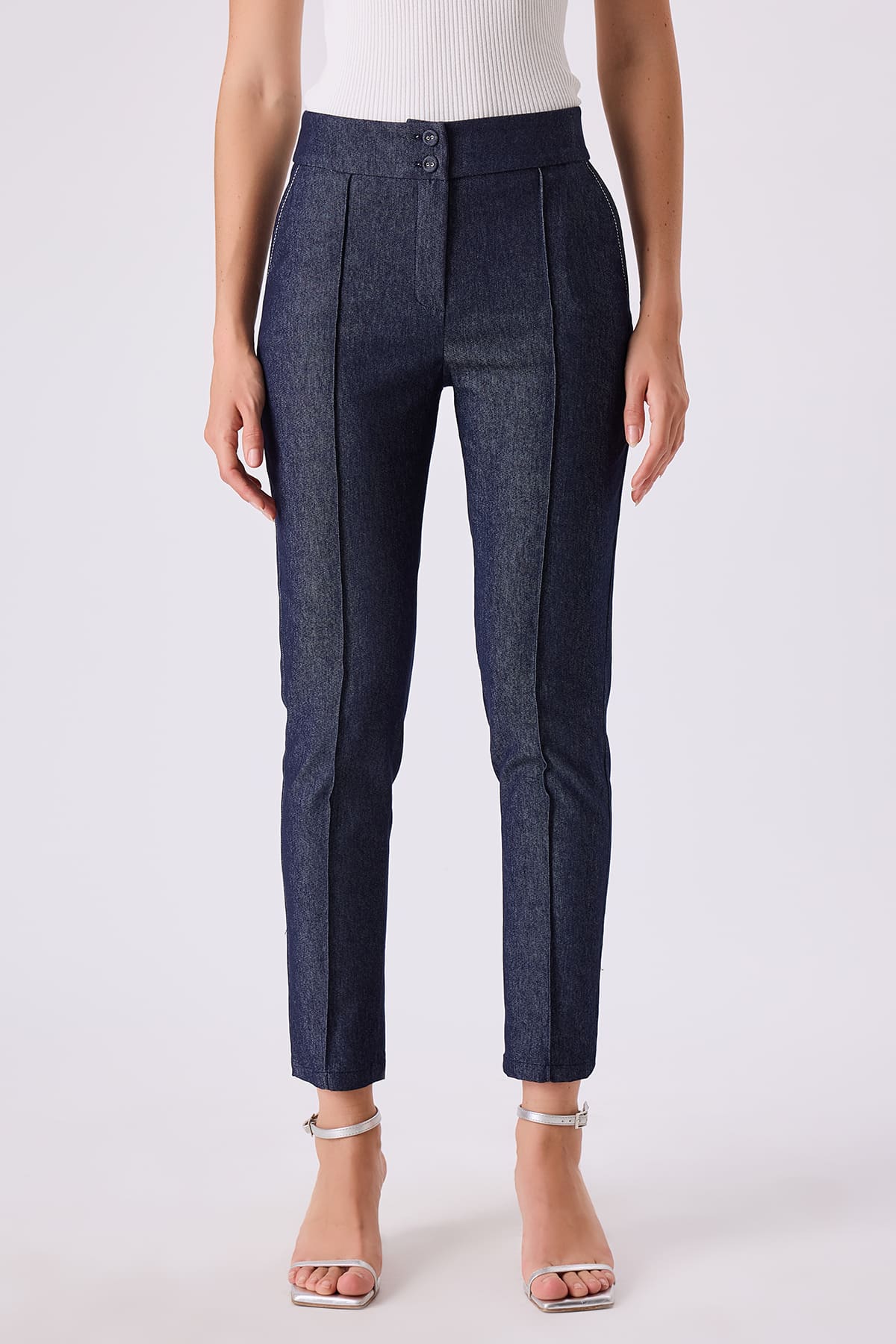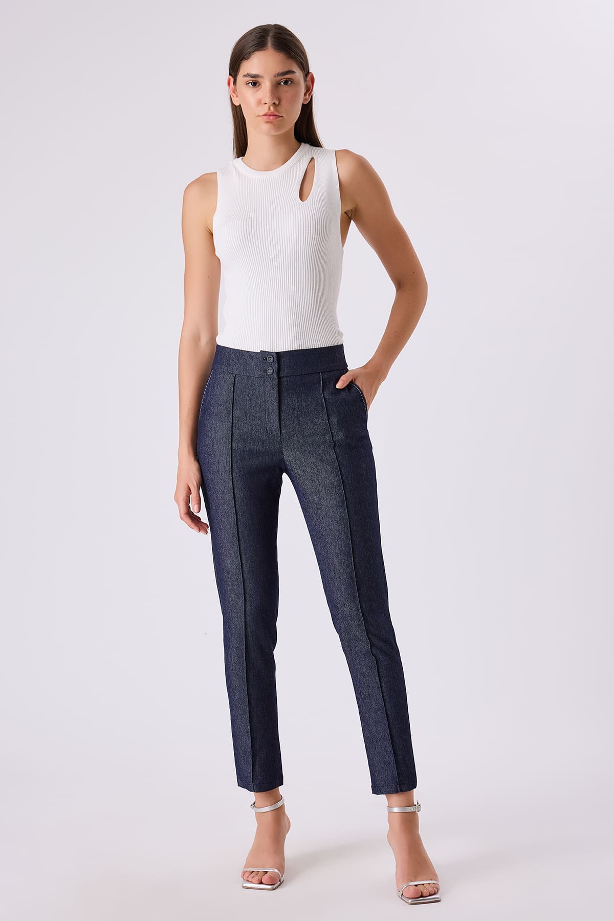 ÜRÜN BİLGİSİ:Pamuk içerikli denim kumaş,normal bel,cepli,önü ortası üstten dikişli,düğme kapamalı,fit form denim pantolon.
