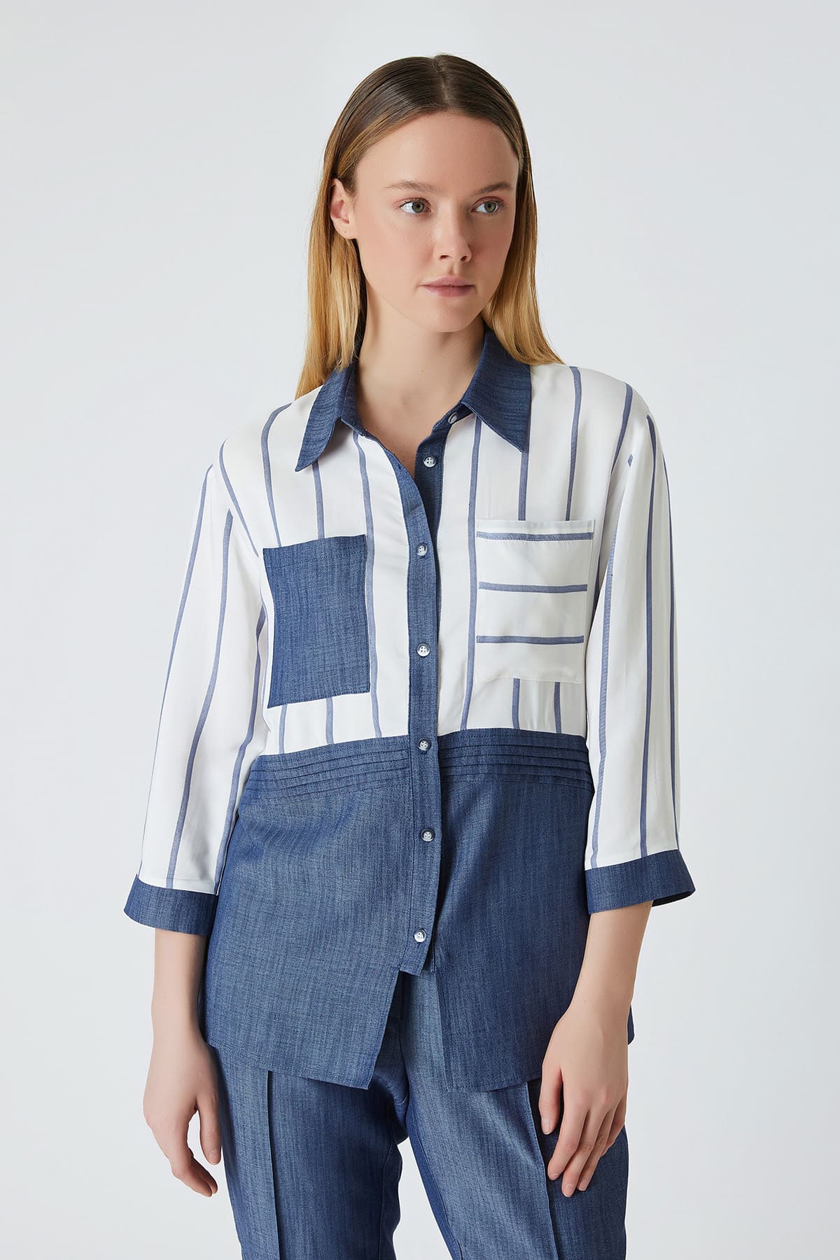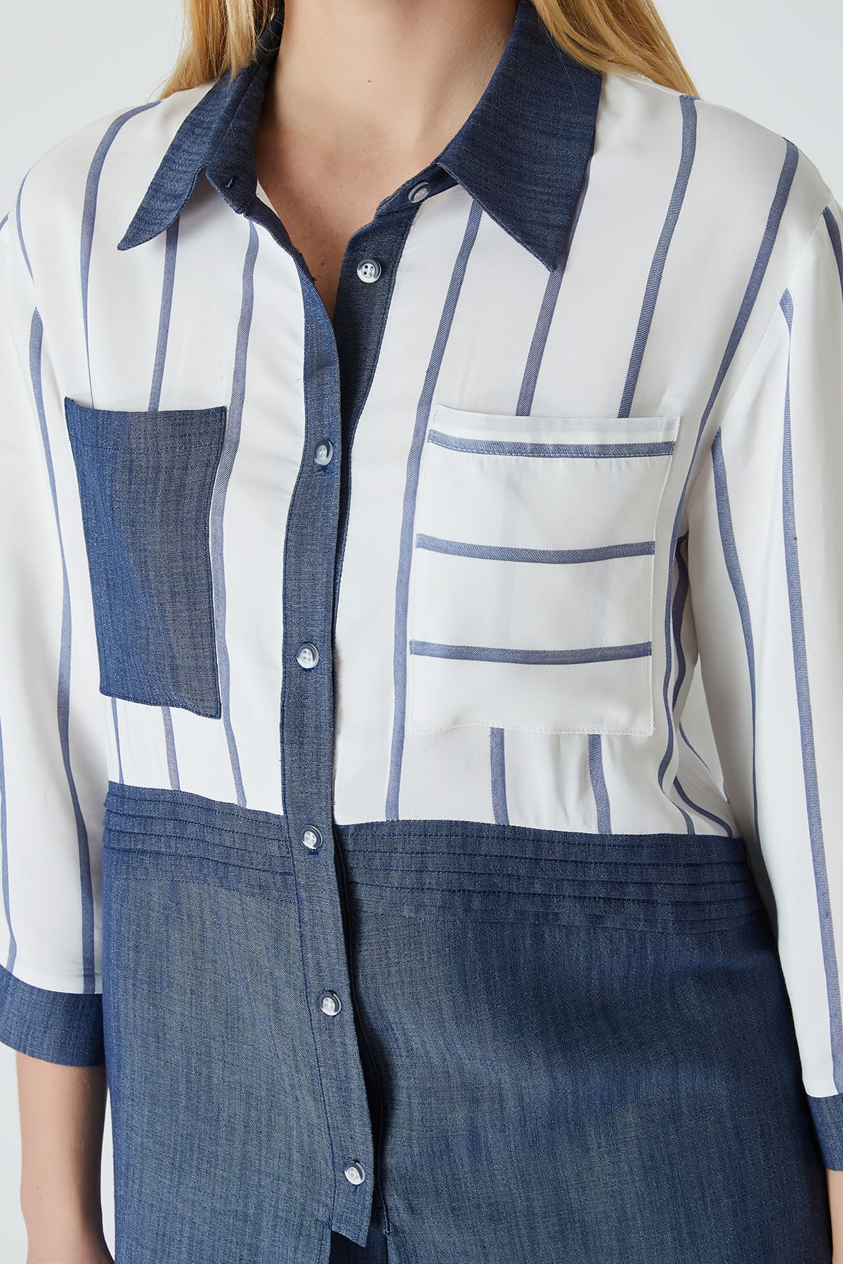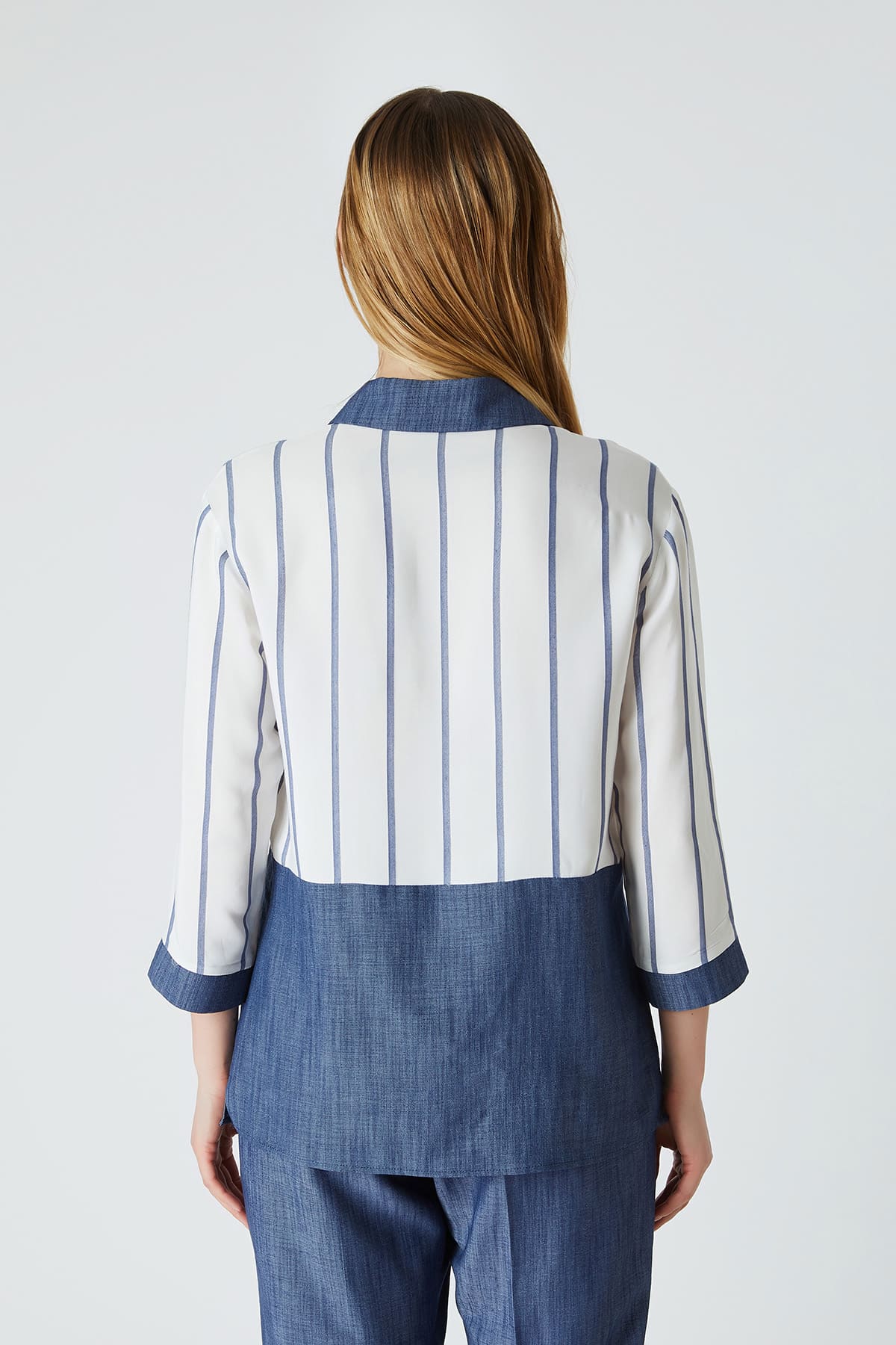 ÜRÜN BİLGİSİ:Viskon karışımlı dökümlü kumaş,yakalı,kısa patlı,düğmeli,önü nervürlü,etek ucu yırtmaç detaylı,çift renk çizgili rahat form gömlek.
