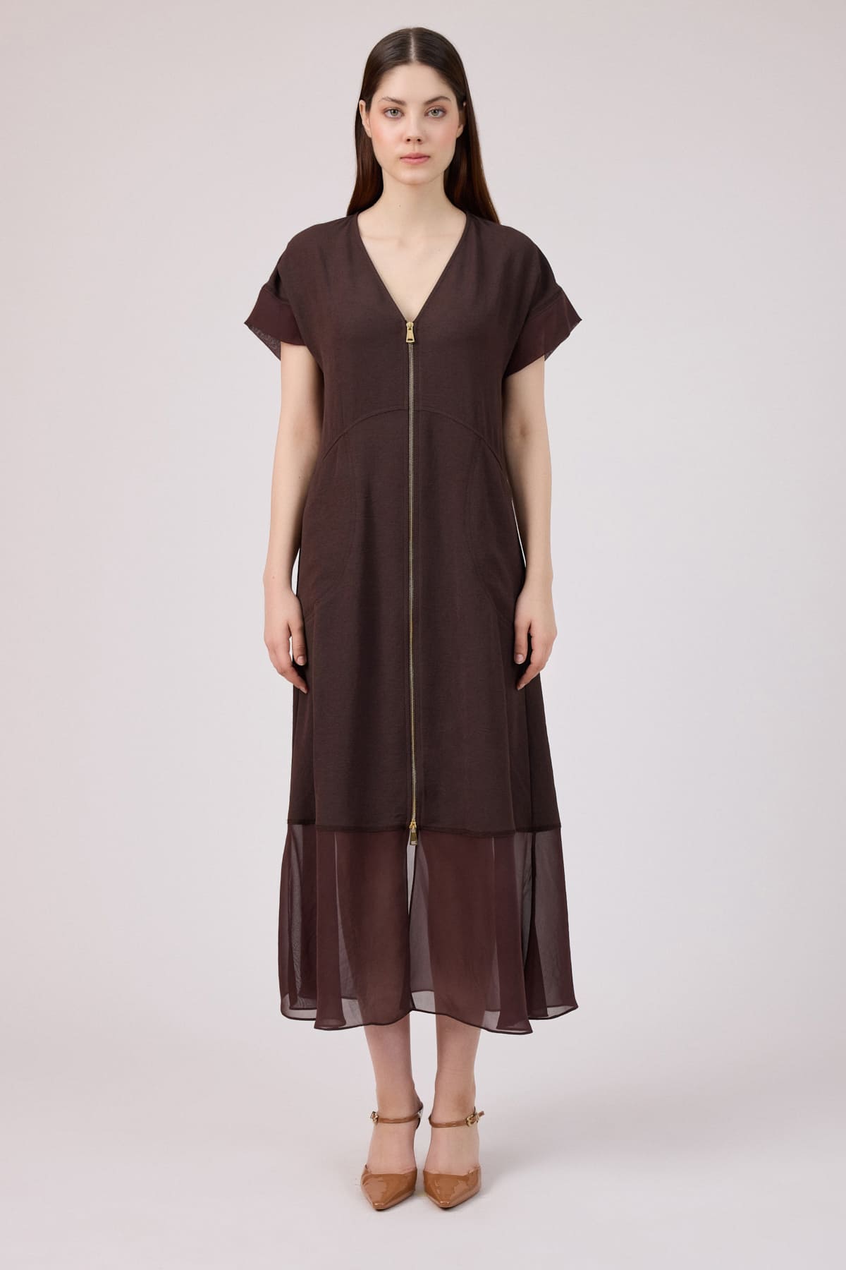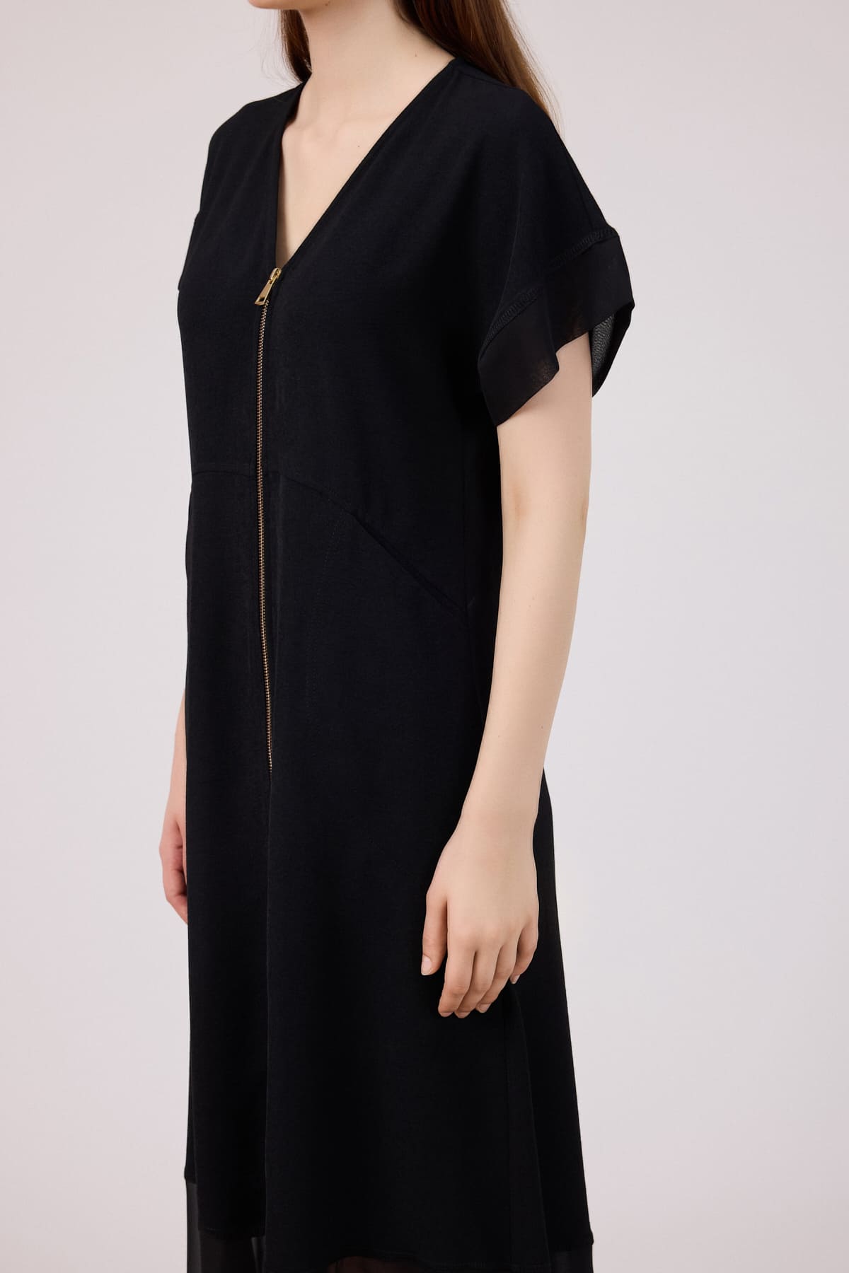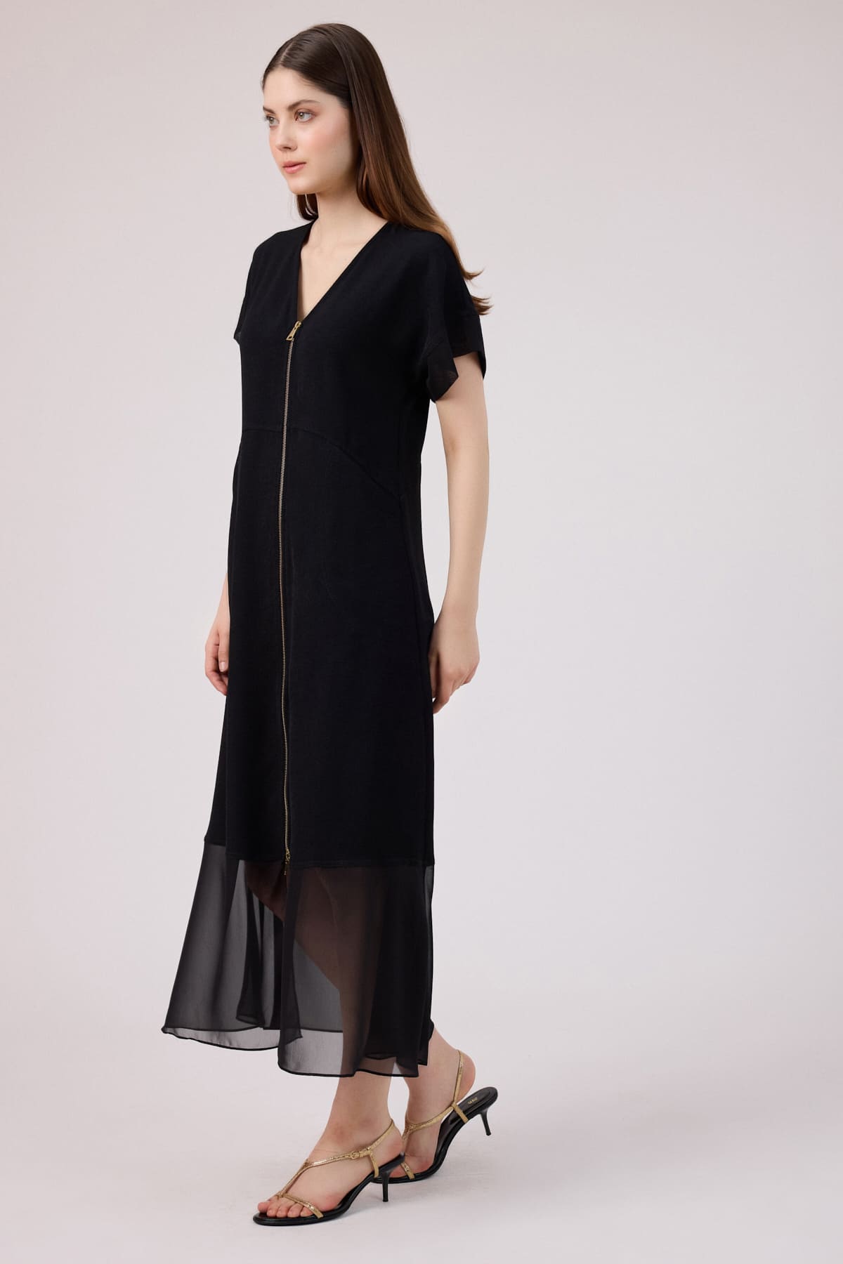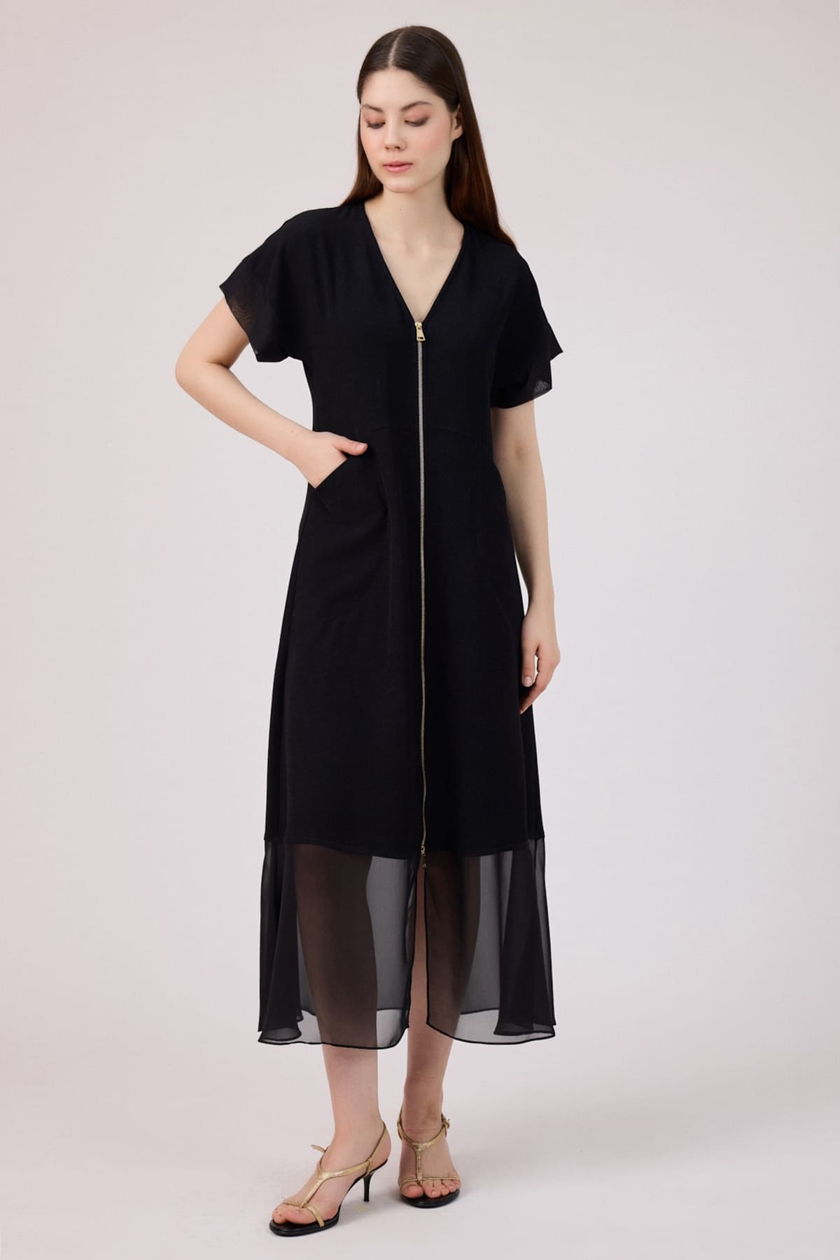 ÜRÜN BİLGİSİ:Hafif esnek dokulu kumaş,önü ince metal fermuarlı,oval kuplu ve kuparası gizli cepli,düşük kollu,kol ve etek ucu bant şifon kumaş geçişli,astarsız elbise