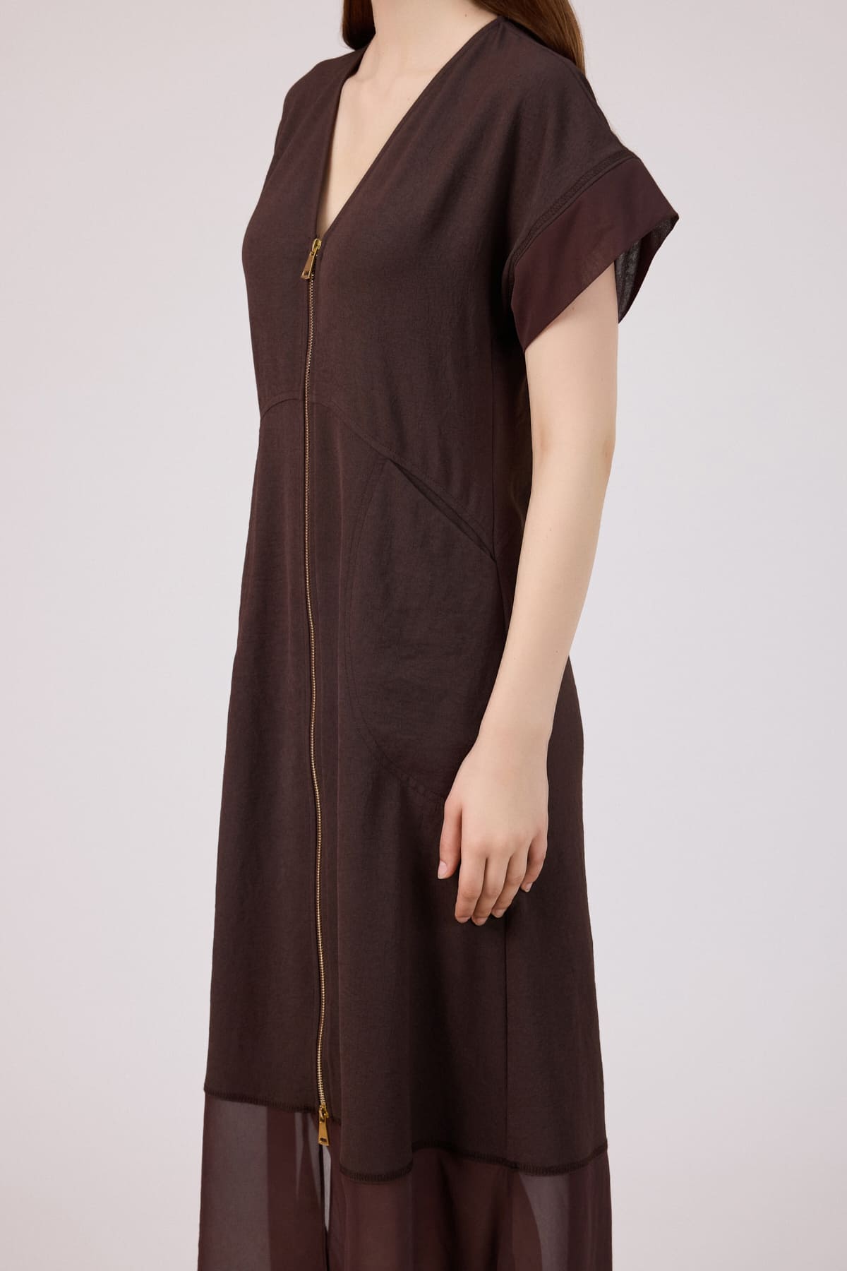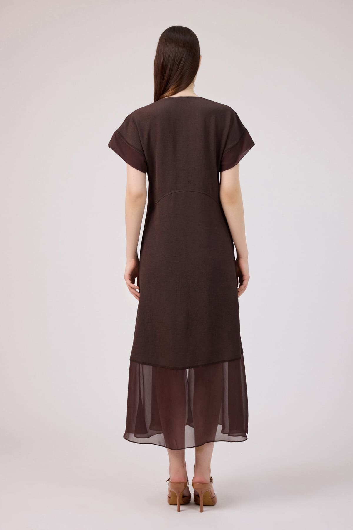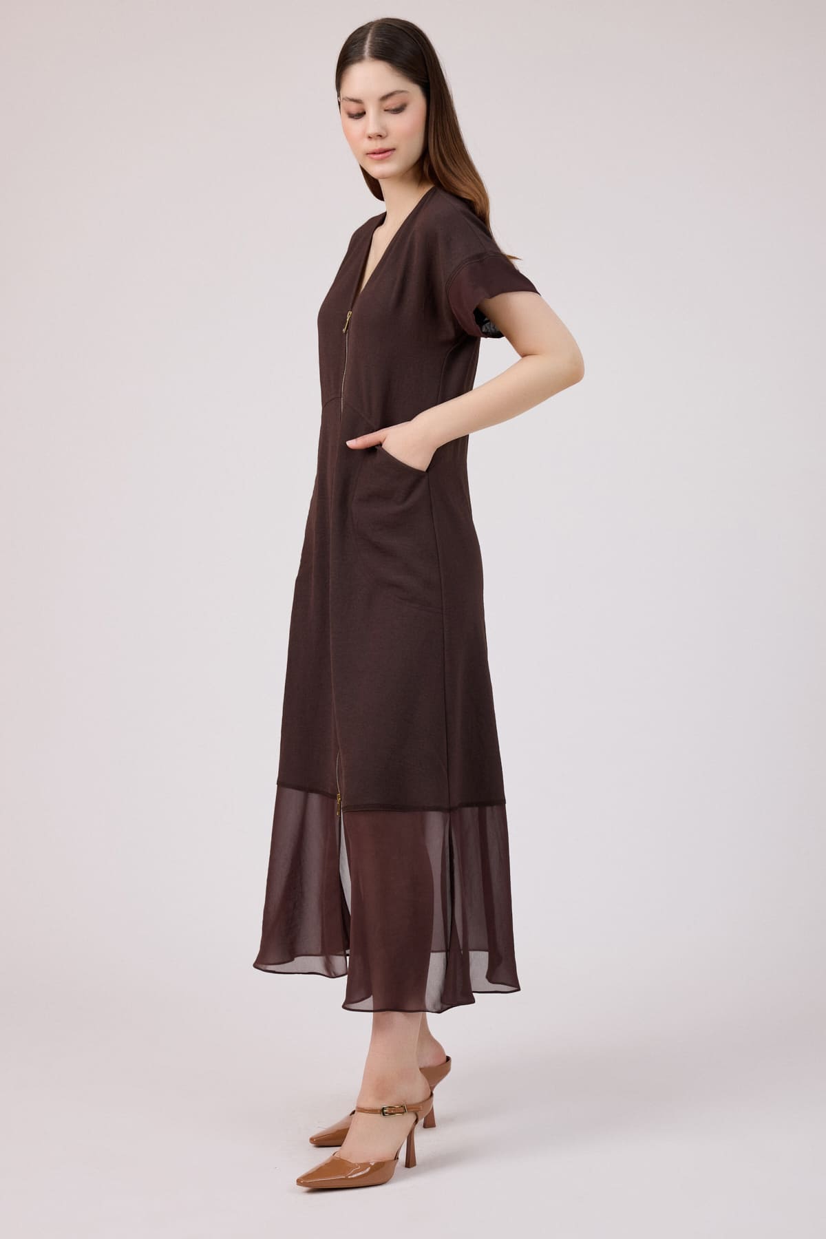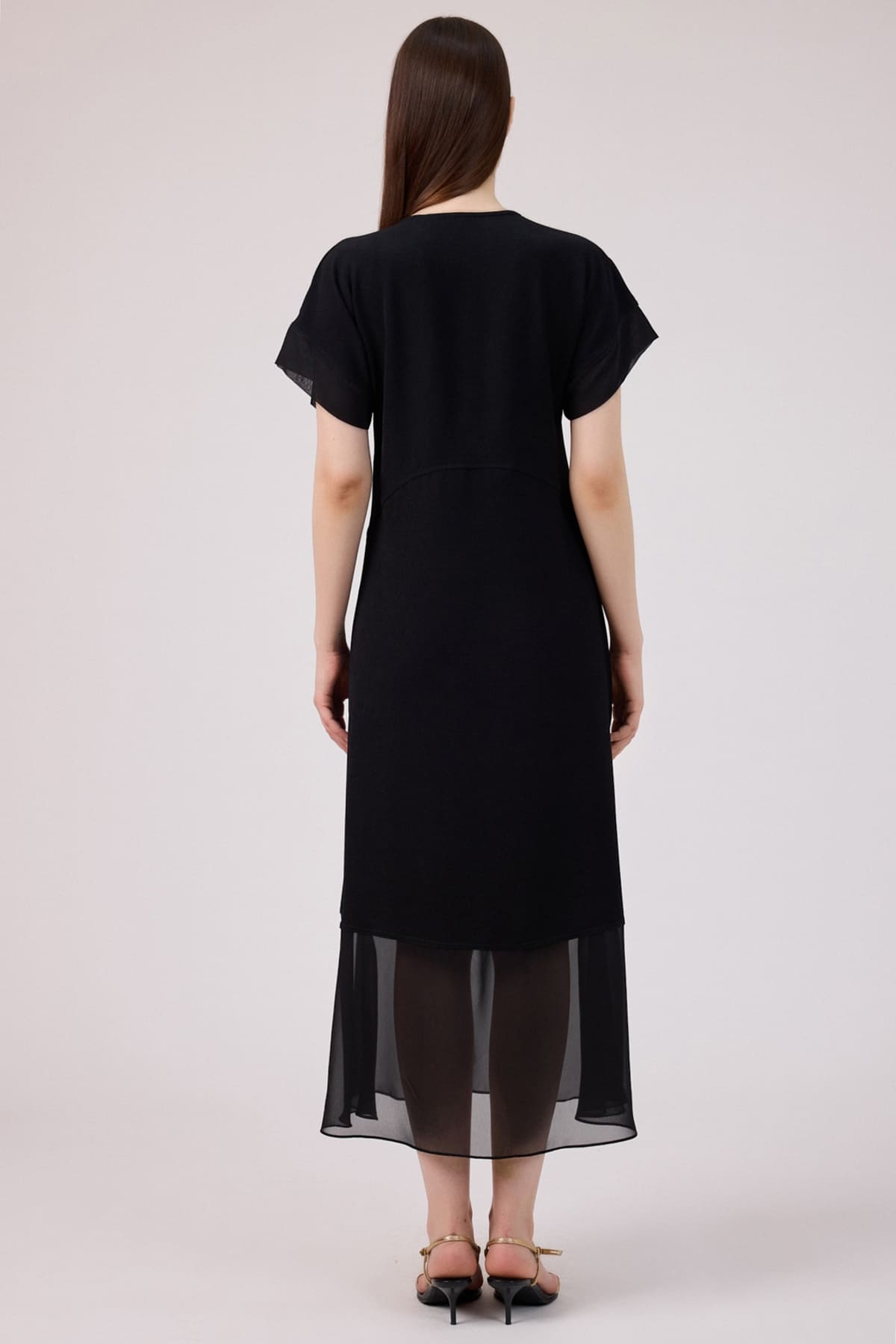 ÜRÜN BİLGİSİ:Hafif esnek dokulu kumaş,önü ince metal fermuarlı,oval kuplu ve kuparası gizli cepli,düşük kollu,kol ve etek ucu bant şifon kumaş geçişli,astarsız elbise