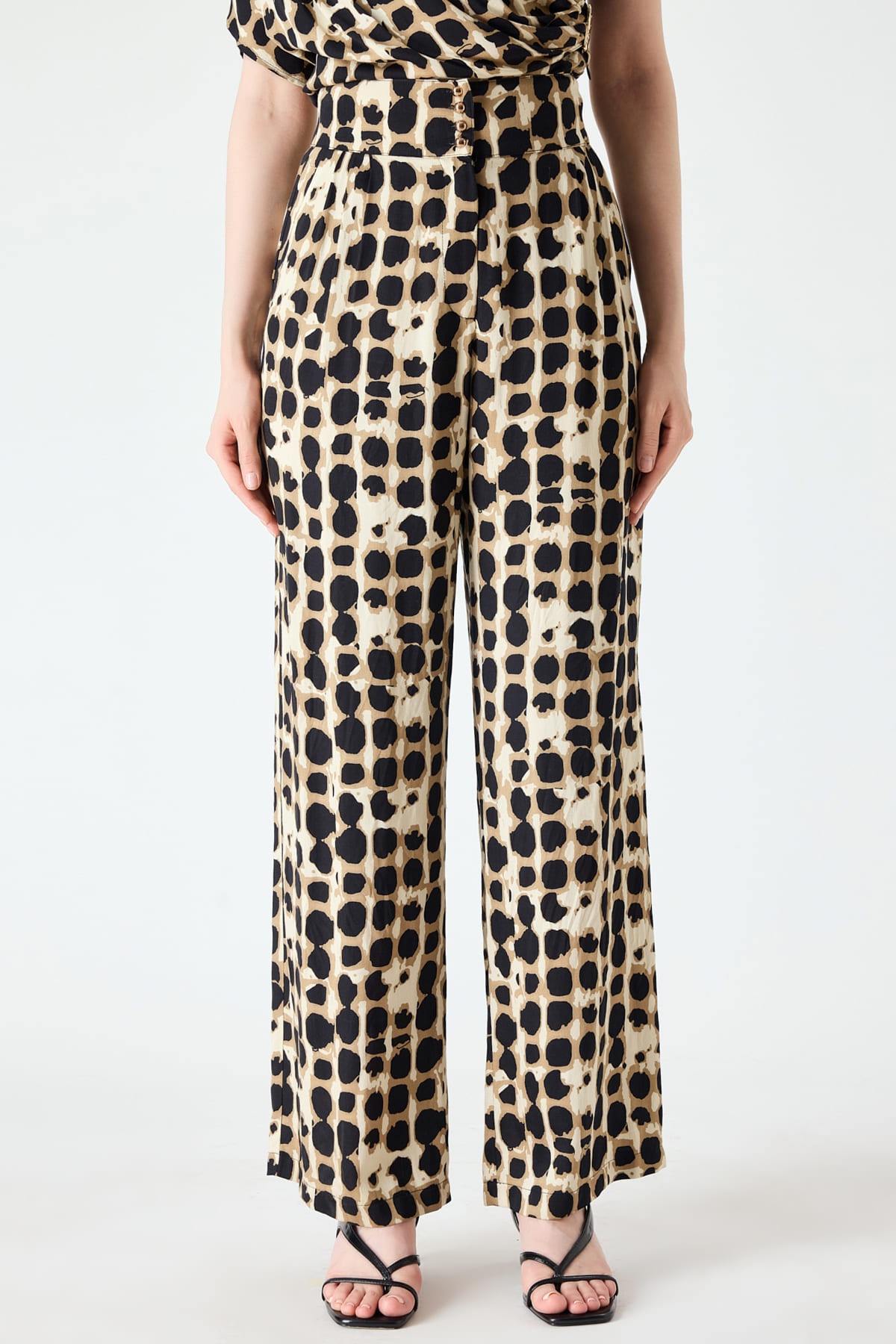 ÜRÜN BİLGİSİ:Viskonlu yumuşak dokulu nefes alabilir leopar kumaş,gold düğmeli,pile detaylı,cepli,hafif geniş paça pantolon.
