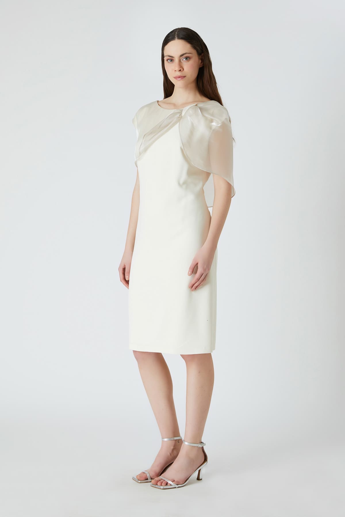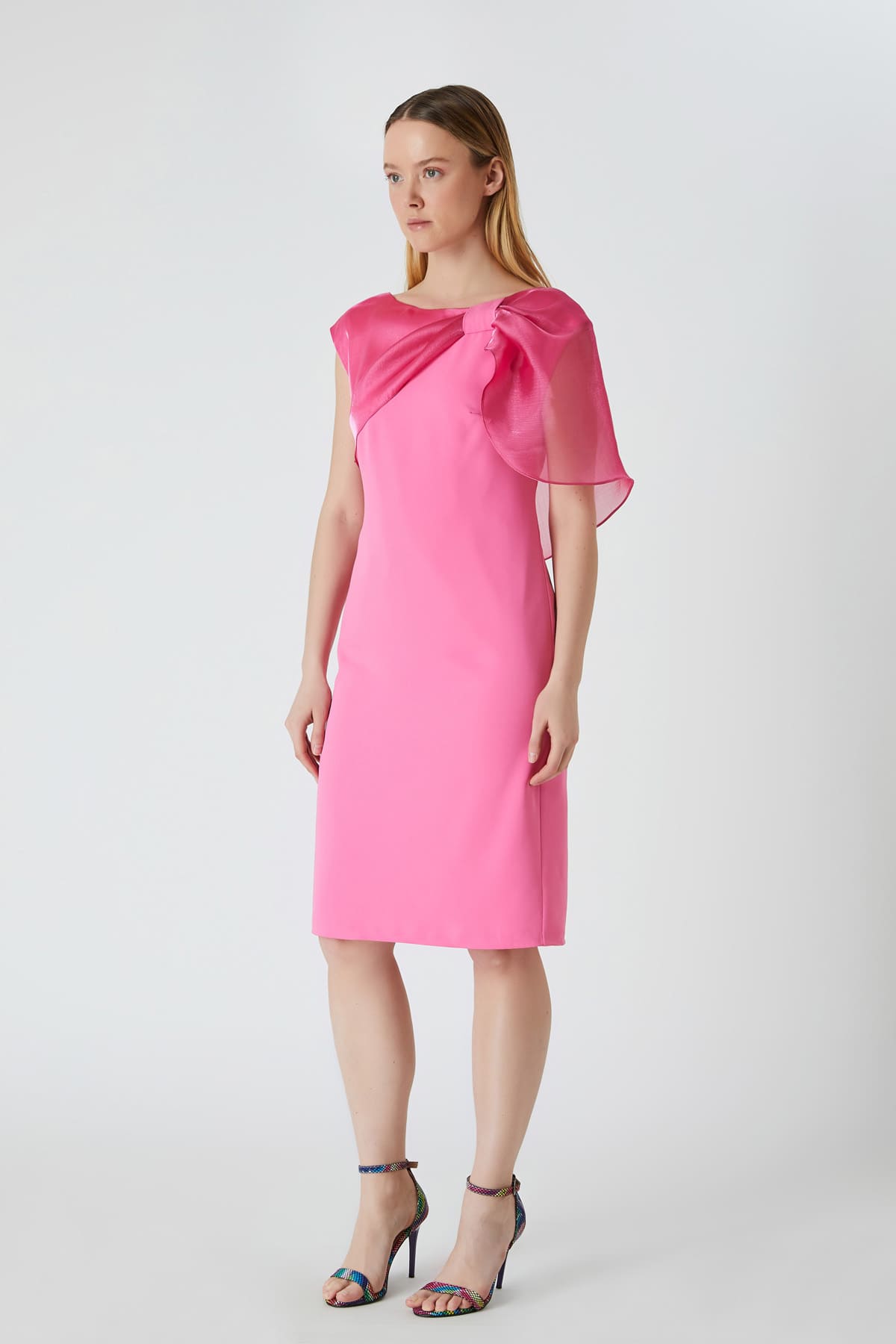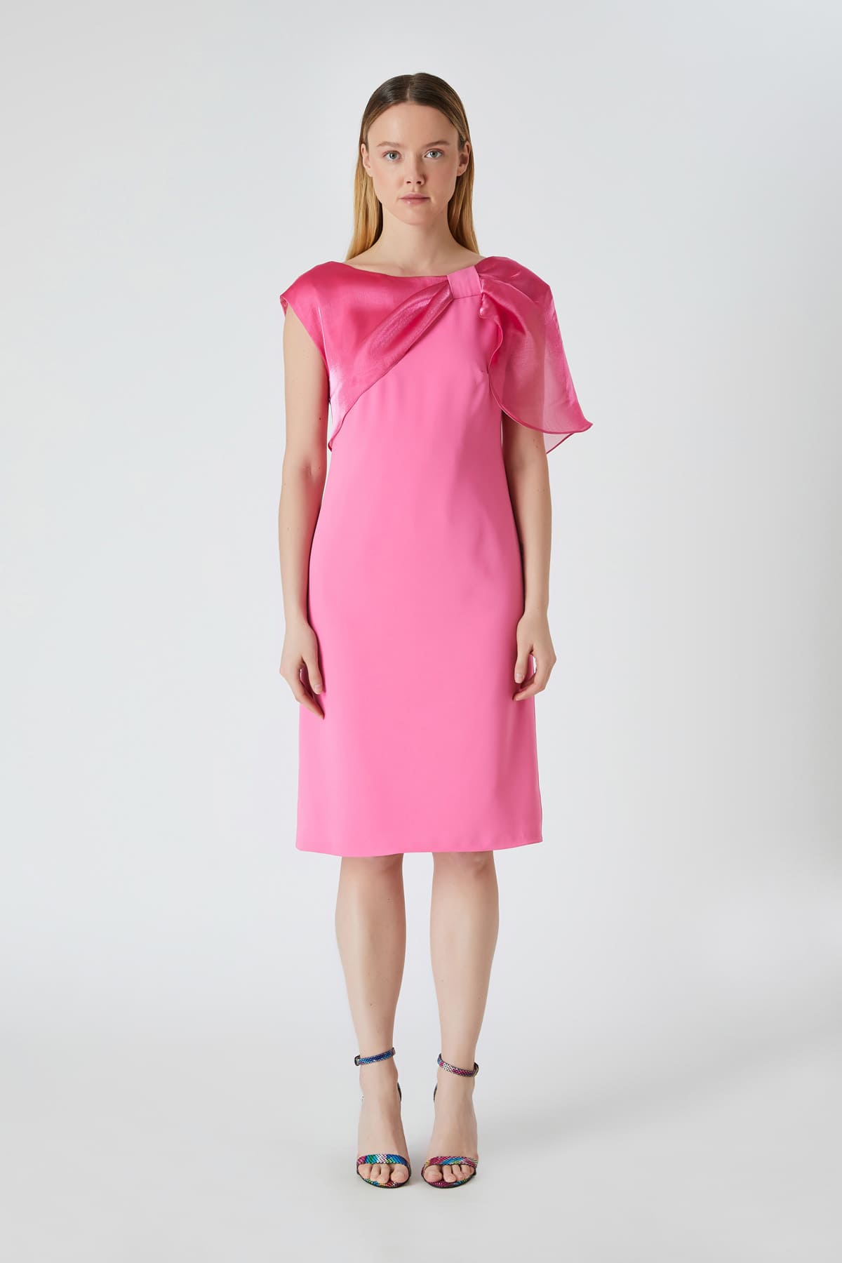 ÜRÜN BİLGİSİ:Dökümlü kumaş,parlak organze geçişli,yuvarlak yakalı,tek omuzu asimetrik,önü parlak fiyonk detaylı,fit form astarlı şık elbise.
