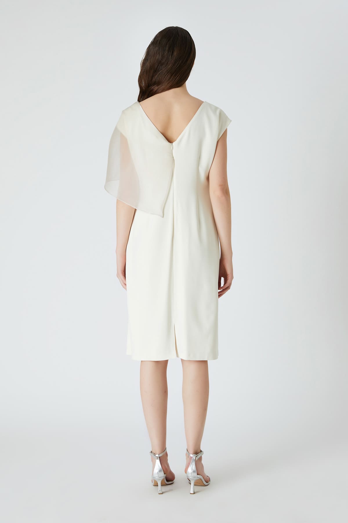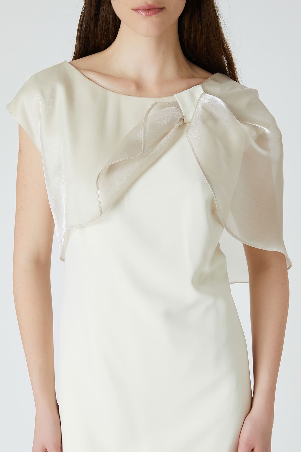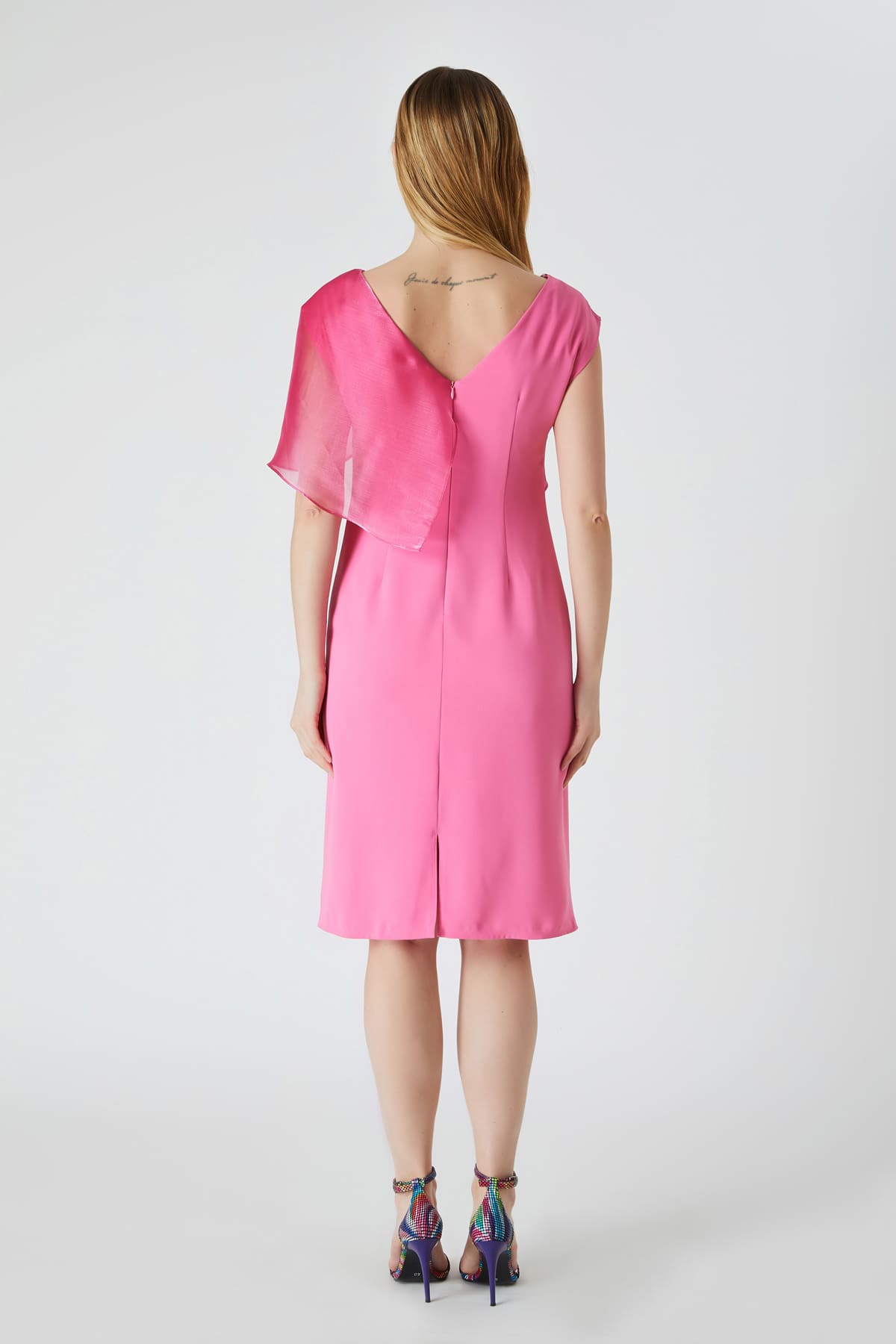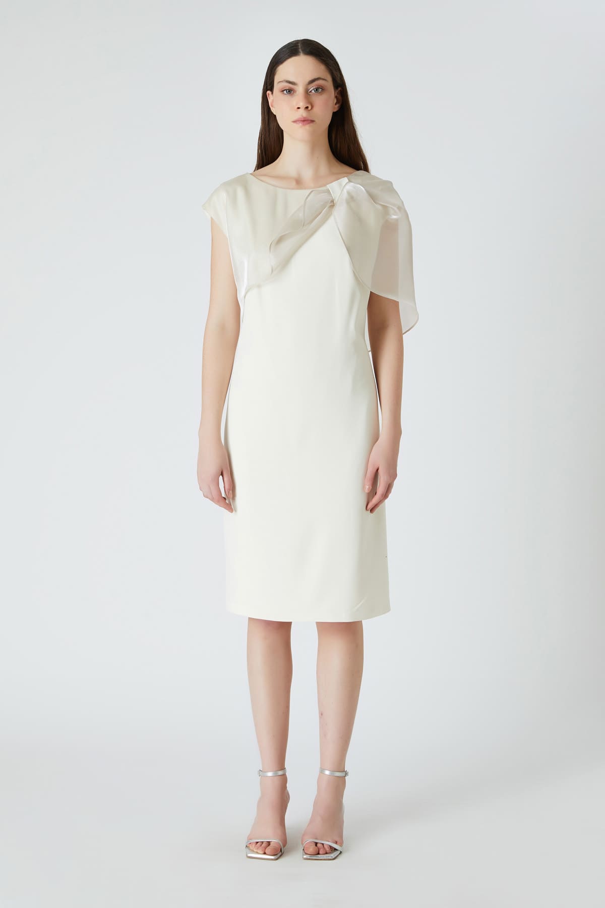 ÜRÜN BİLGİSİ:Dökümlü kumaş,parlak organze geçişli,yuvarlak yakalı,tek omuzu asimetrik,önü parlak fiyonk detaylı,fit form astarlı şık elbise.