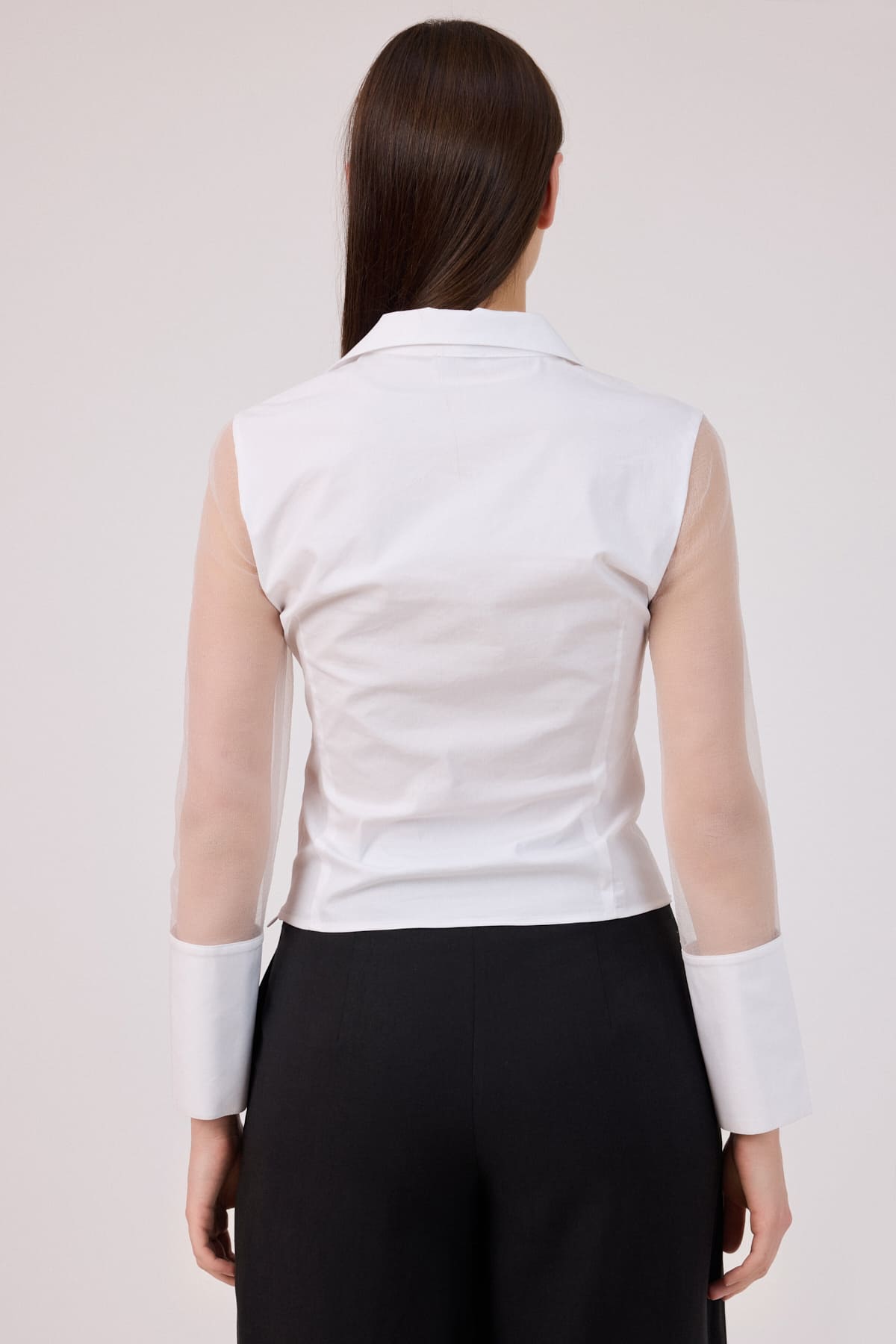 ÜRÜN BİLGİSİ:Esnek dokulu poplin kumaş,yakalı,kolları organze kumaş geçişli,etek ucu drapeli,kısa bluz