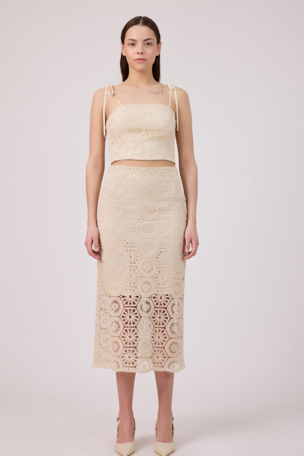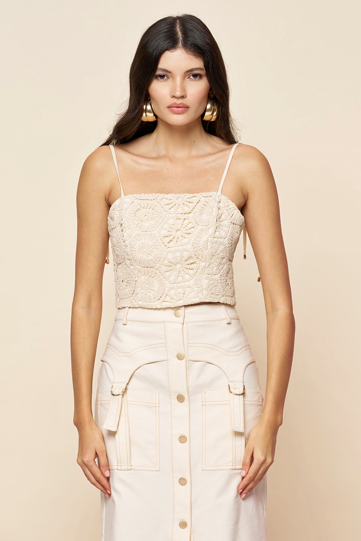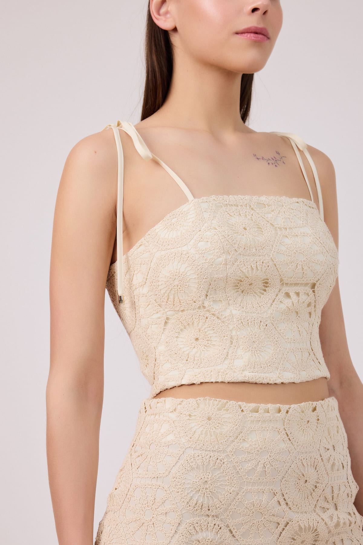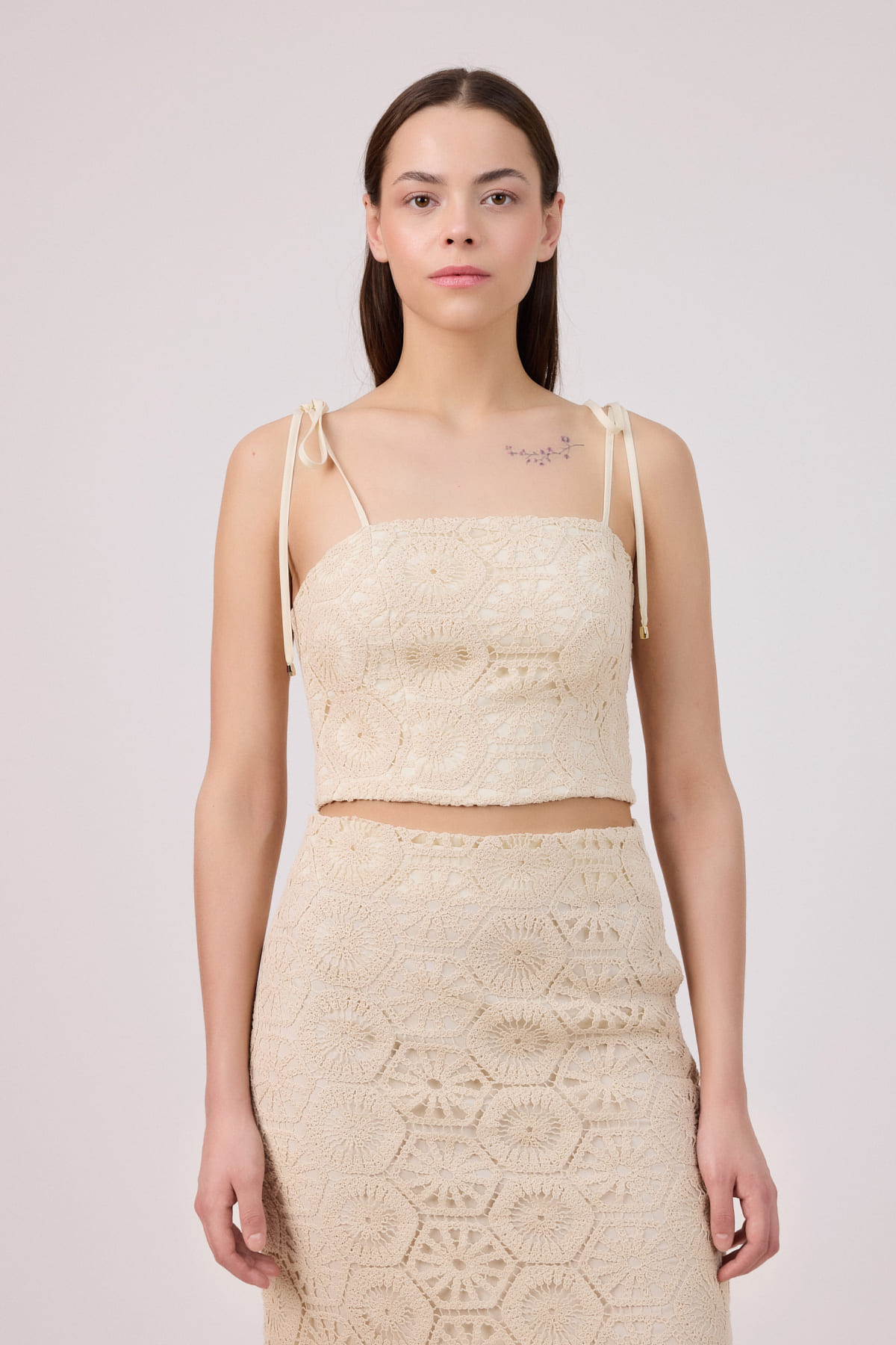 ÜRÜN BİLGİSİ:Pamuk karışımlı naturel renkli güpür dokulu dantel kumaş,ayarlanabilir kumaş askılı crop top