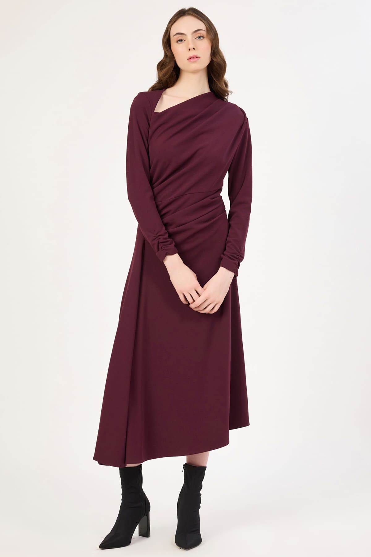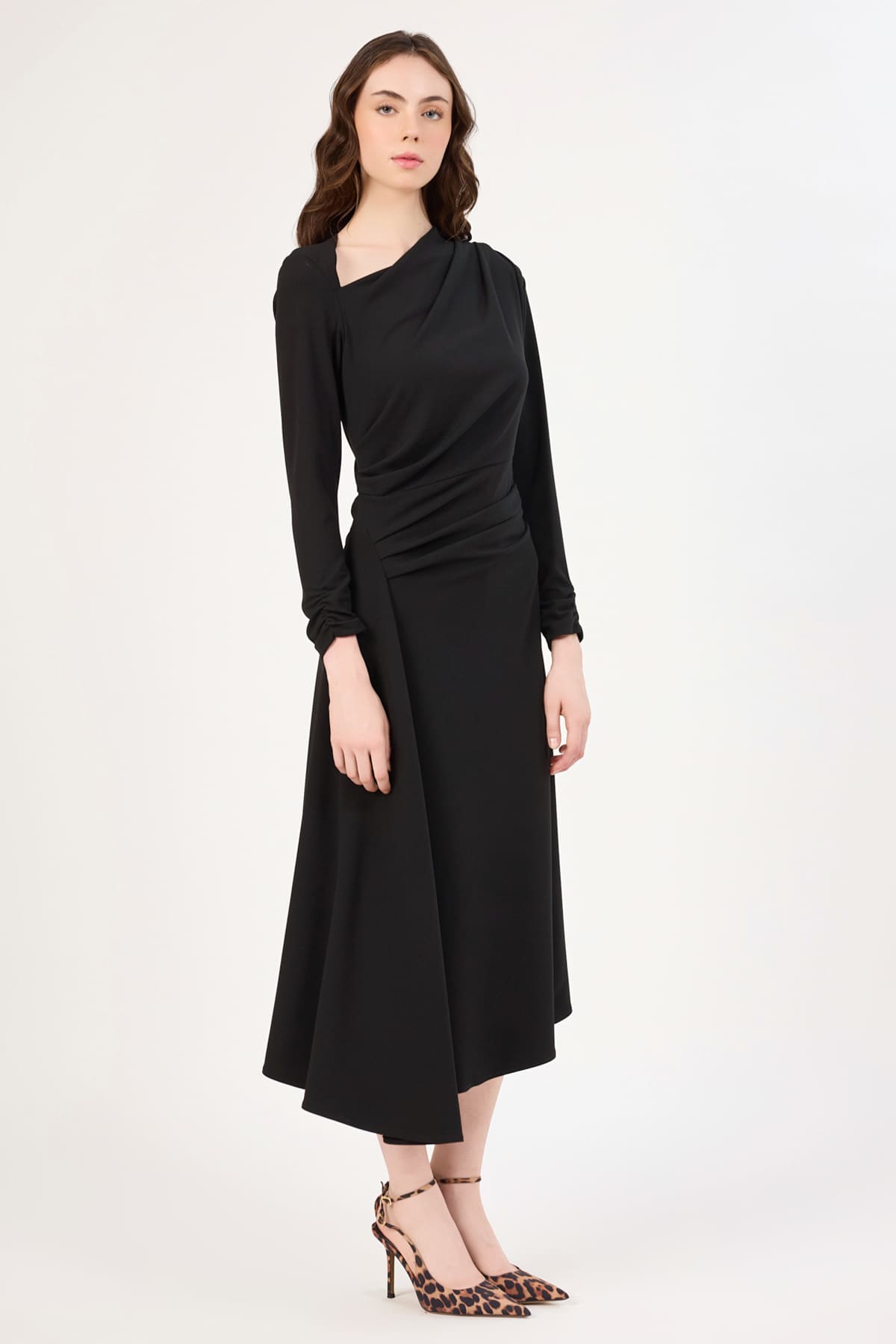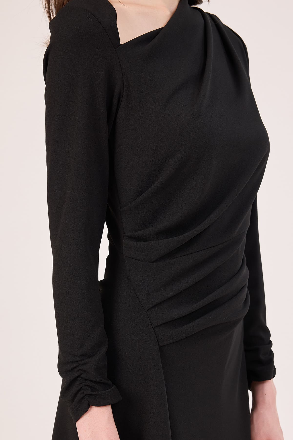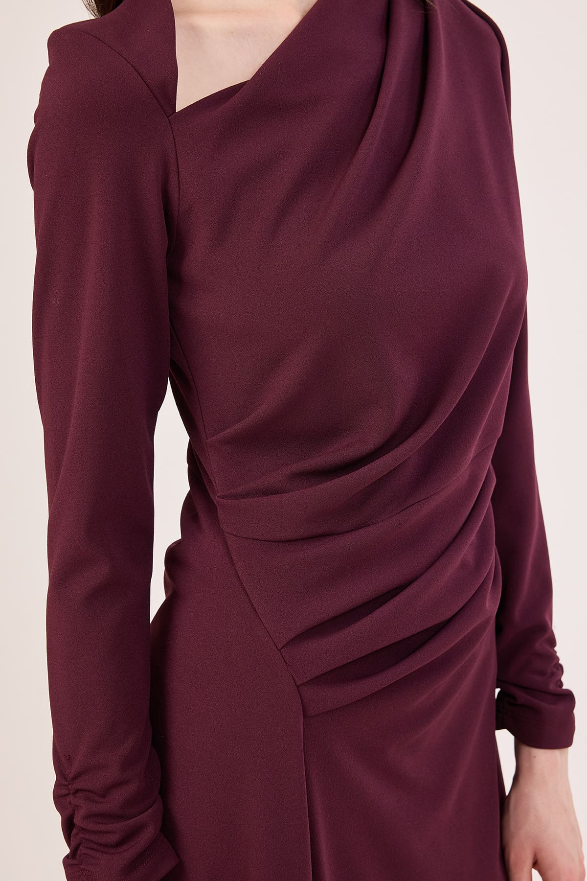 ÜRÜN BİLGİSİ:Likralı esnek dokulu krep kumaş,yakası ve etek ucu asimetrik,pile detaylı,fermuarlı,astarlı,şık elbise.
