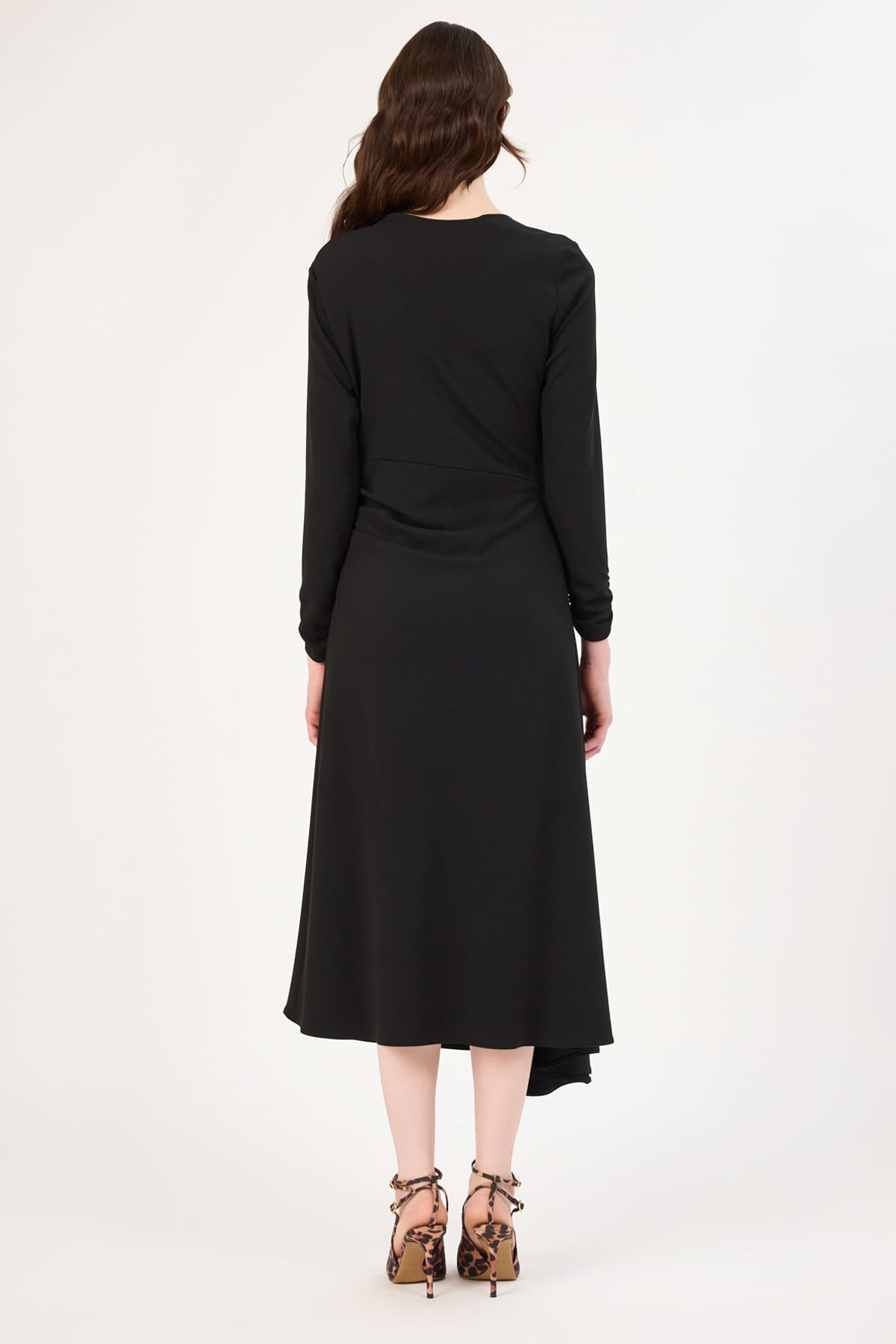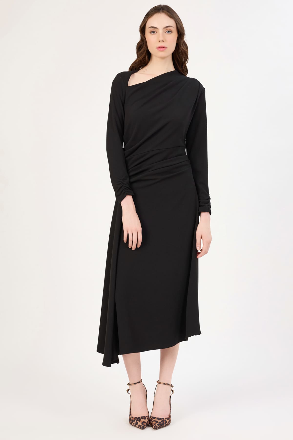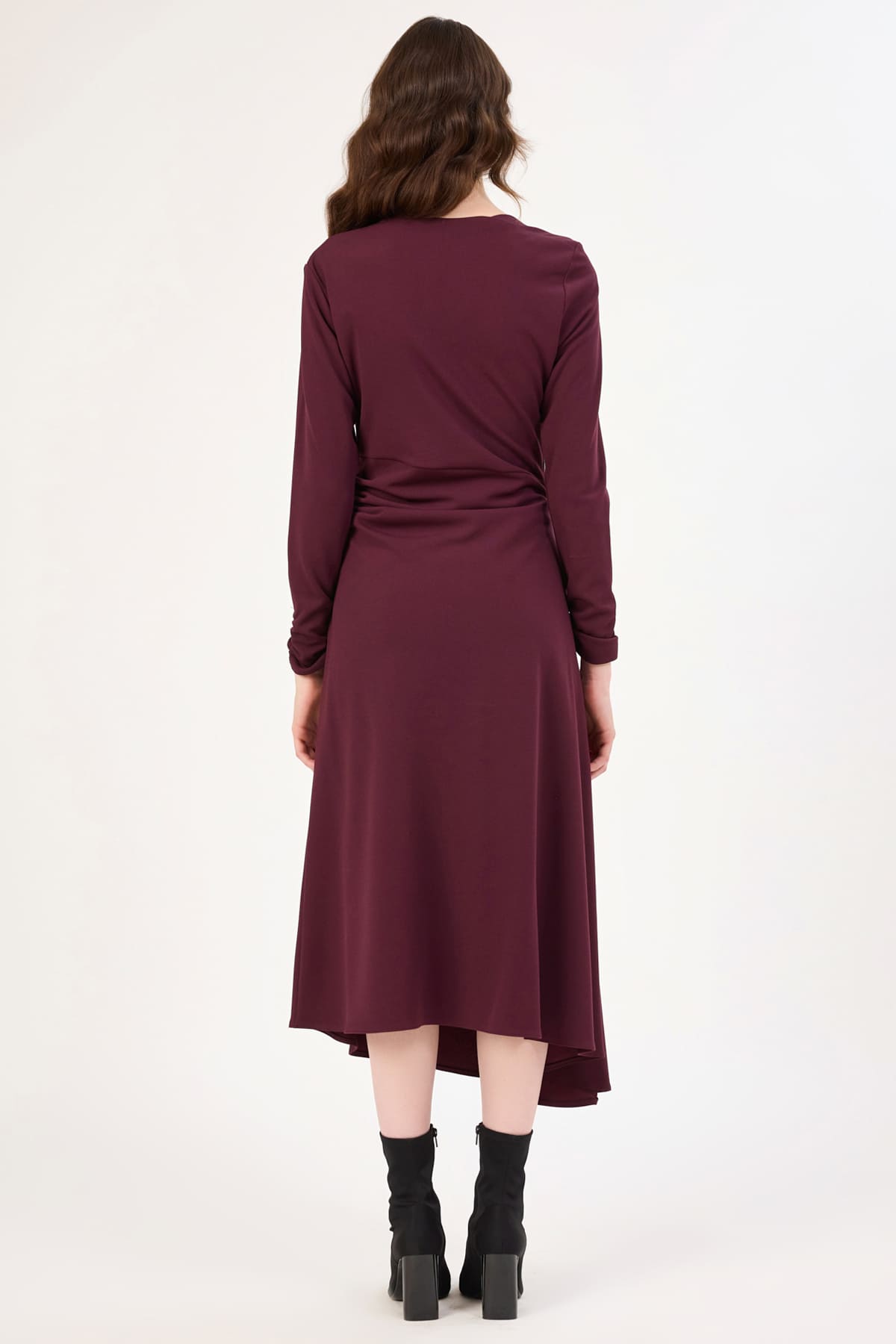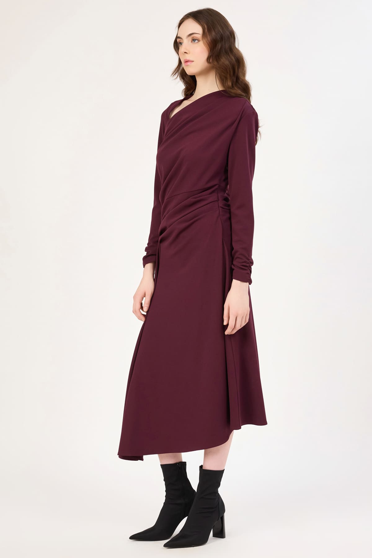 ÜRÜN BİLGİSİ:Likralı esnek dokulu krep kumaş,yakası ve etek ucu asimetrik,pile detaylı,fermuarlı,astarlı,şık elbise.