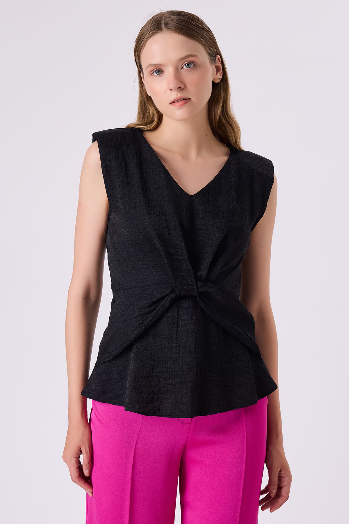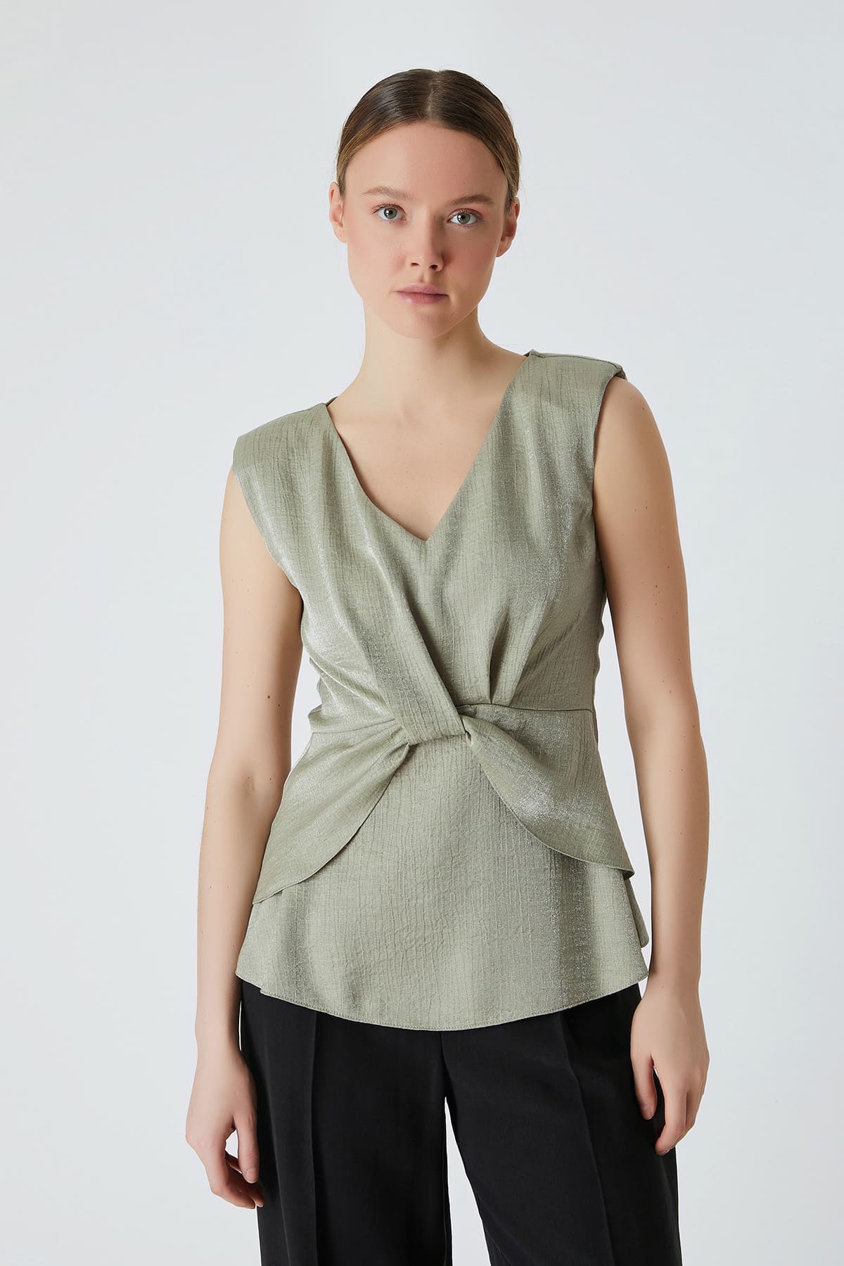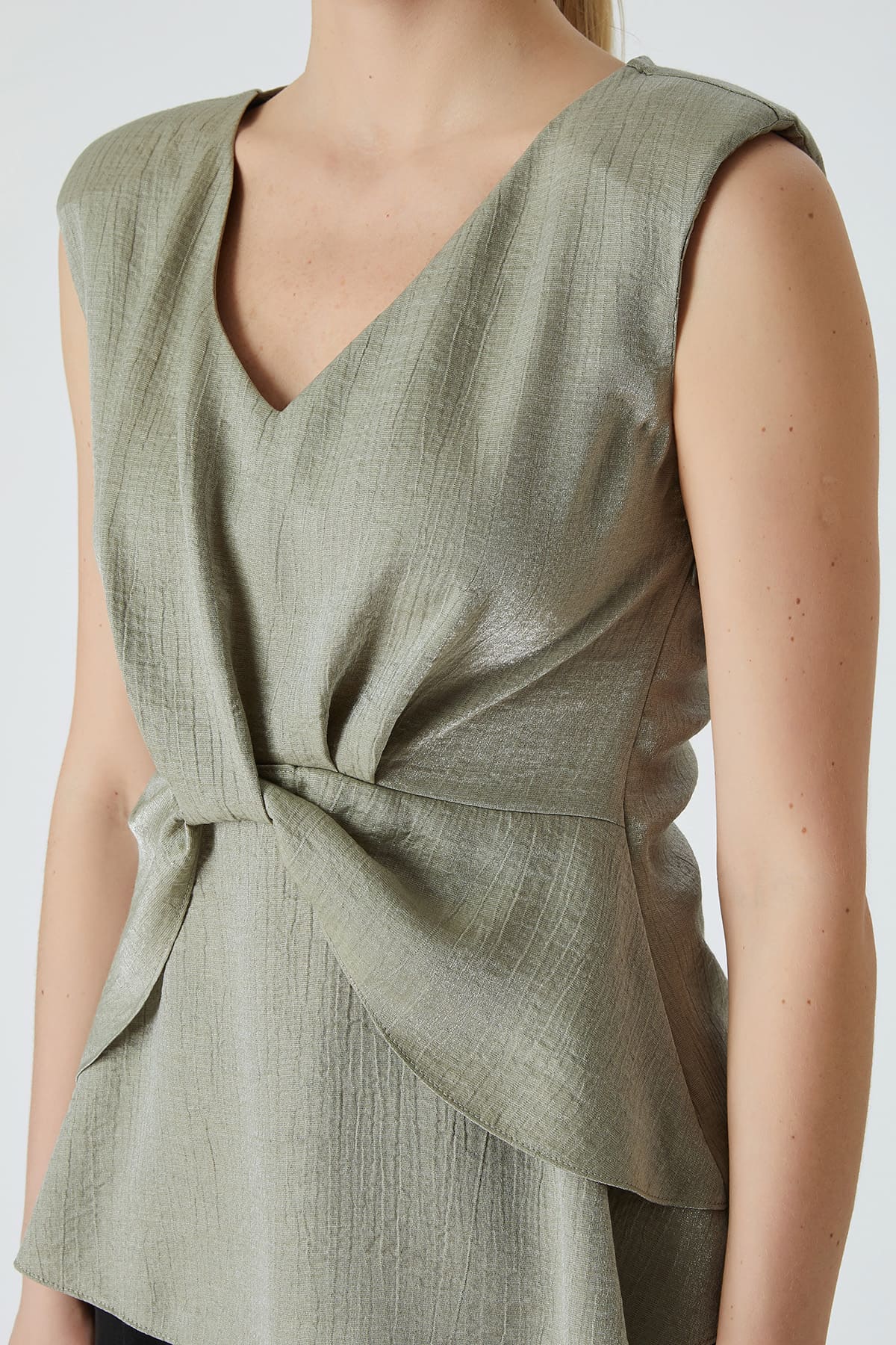 ÜRÜN BİLGİSİ:Viskon içerikli parlak kumaş,önü v yakalı,omuzları vatkalı,beli pile detaylı,fermuarlı şık bluz.