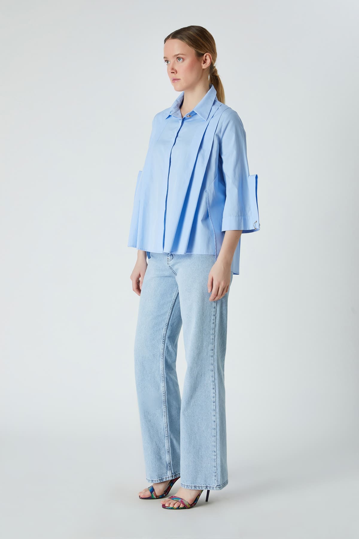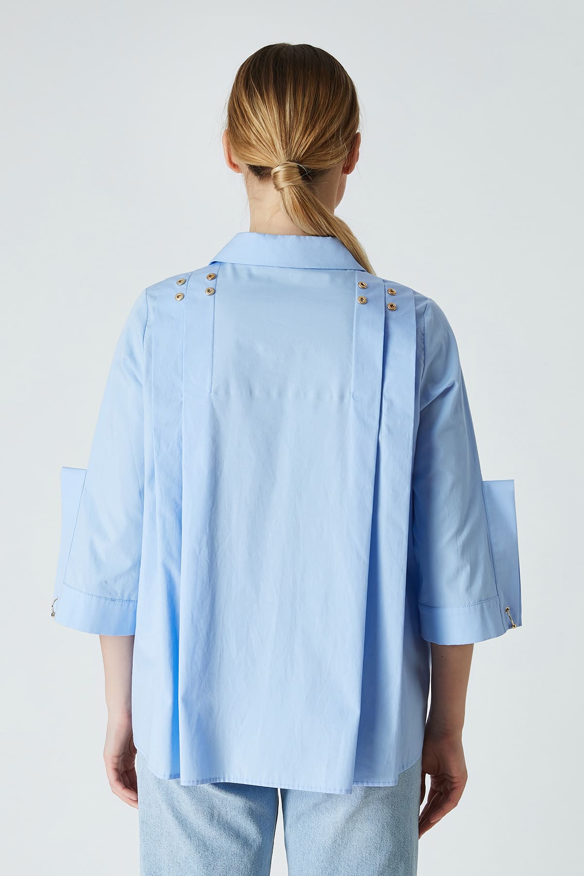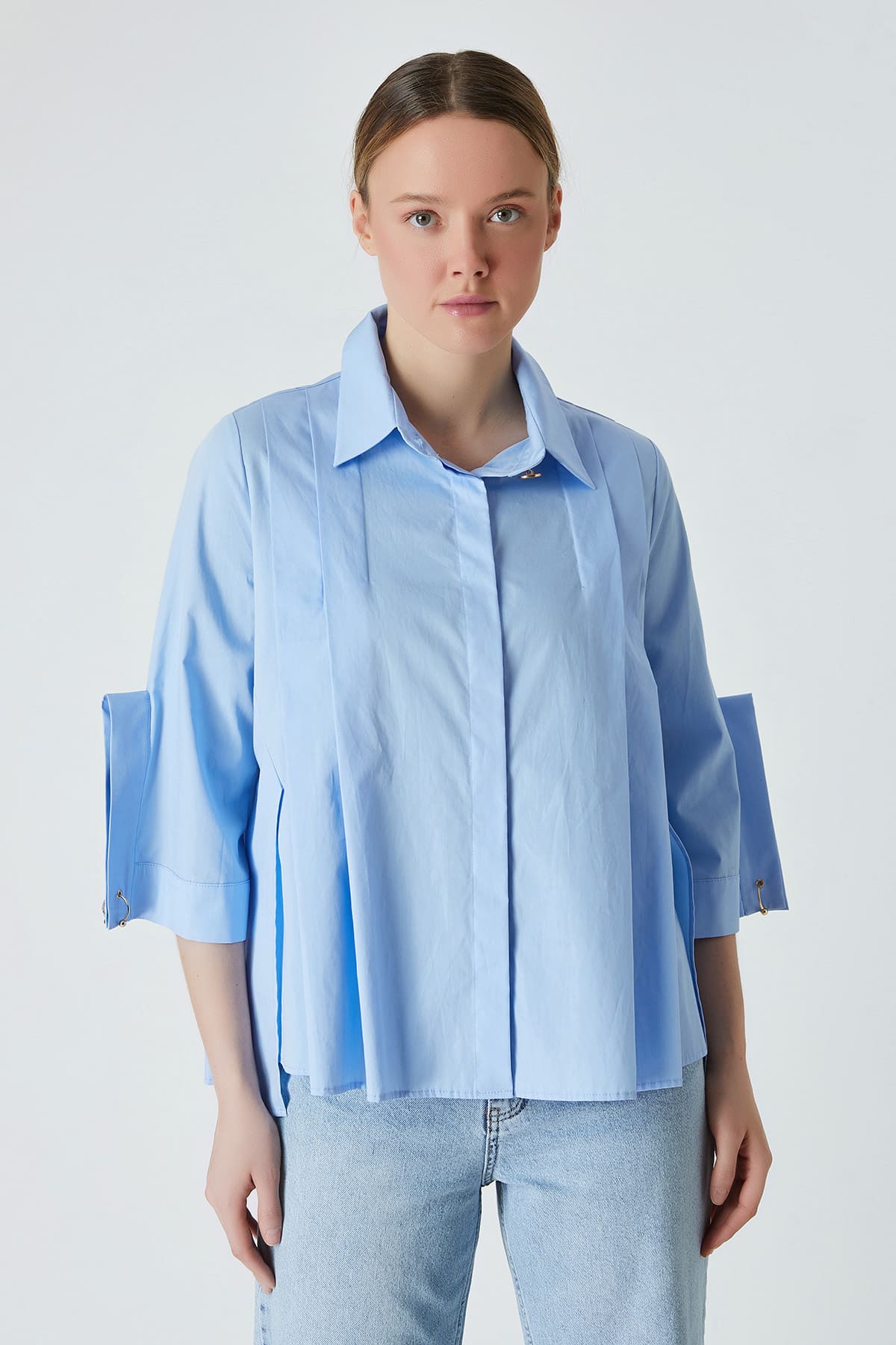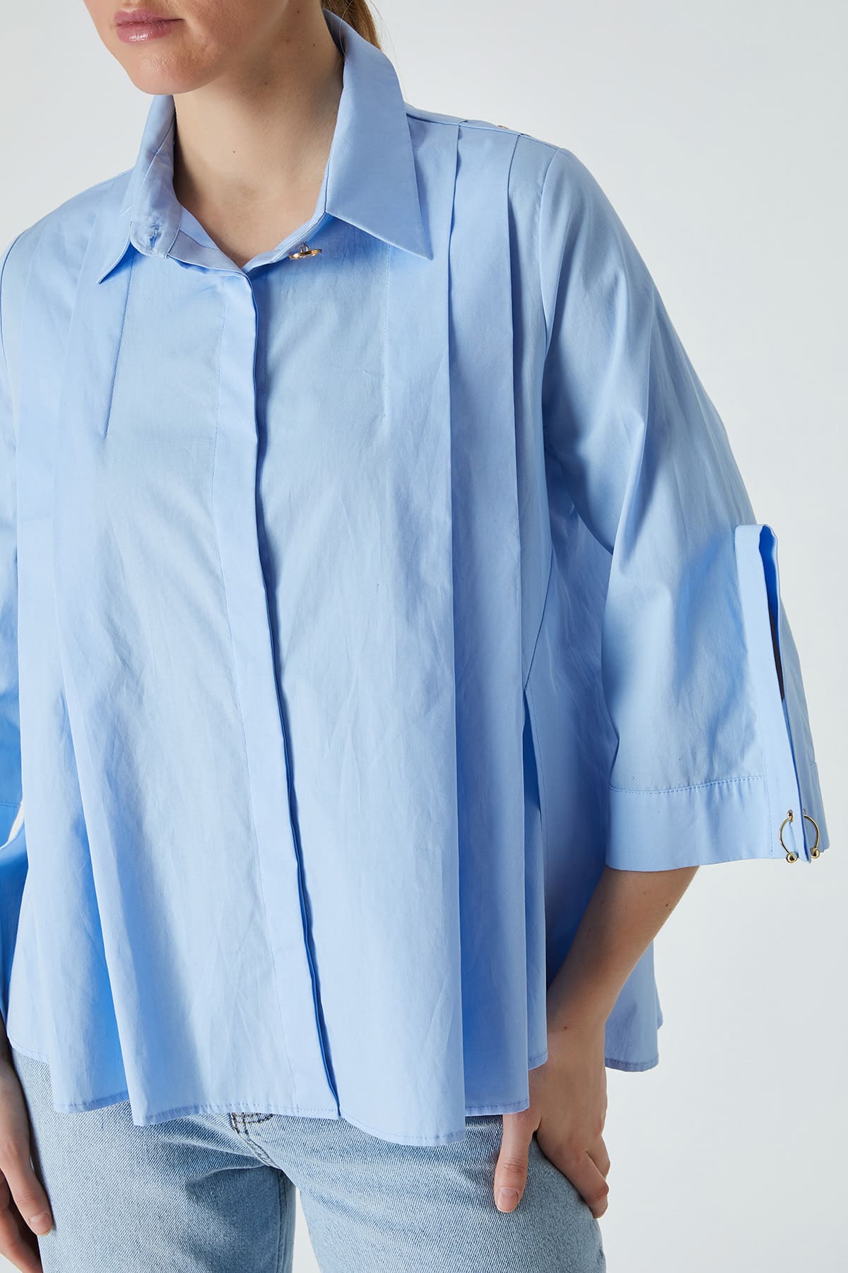 ÜRÜN BİLGİSİ:Pamuk içerikli poplin kumaş,yakalı,truvakar kollu,gizli patlı,kesik patlı,tek yön pileli,çıkarılabilir metal halka detaylı,oversize zamansız gömlek.