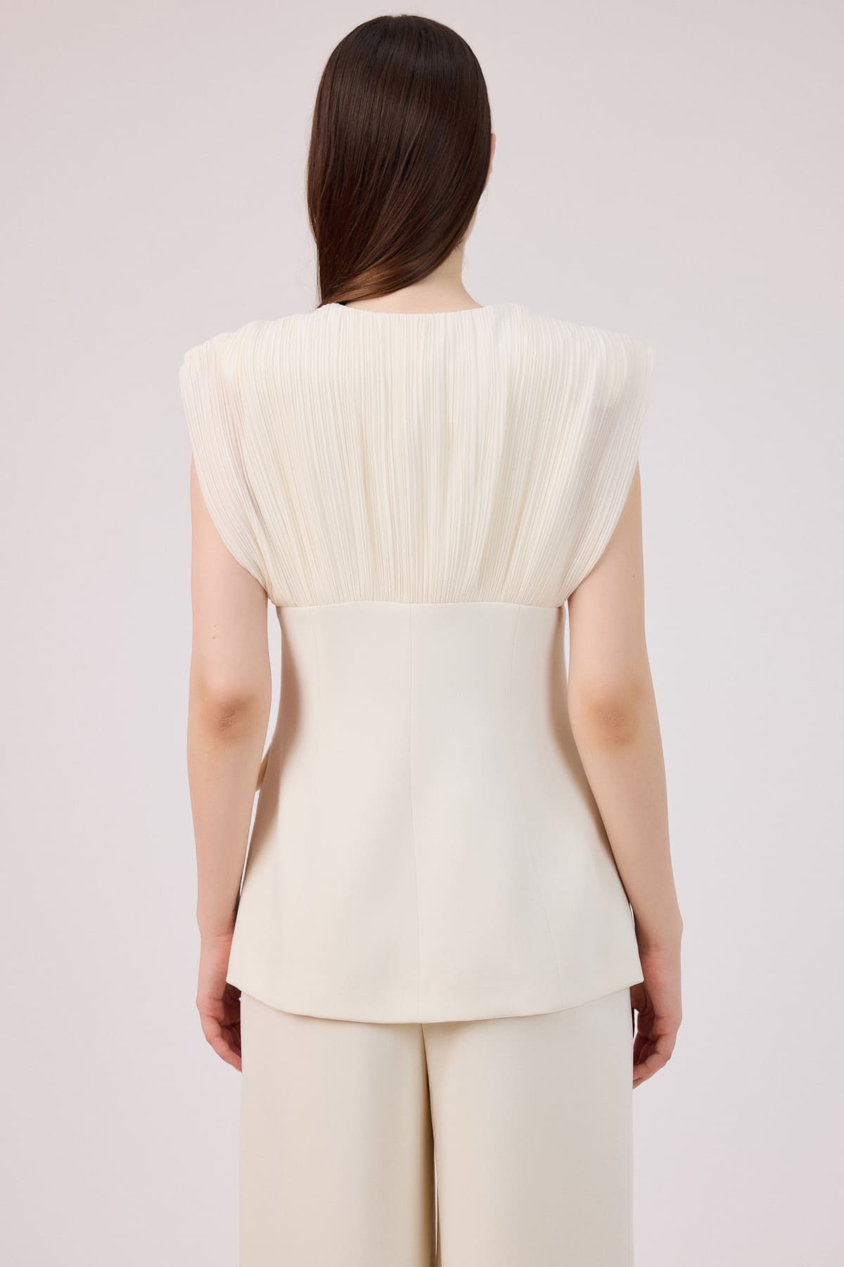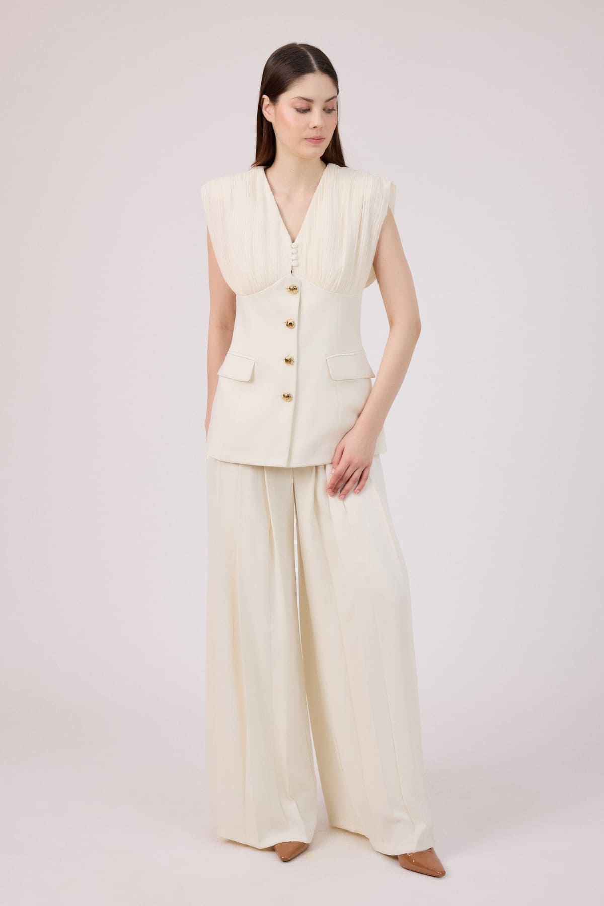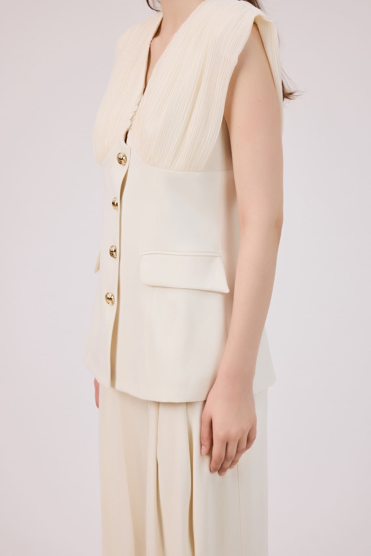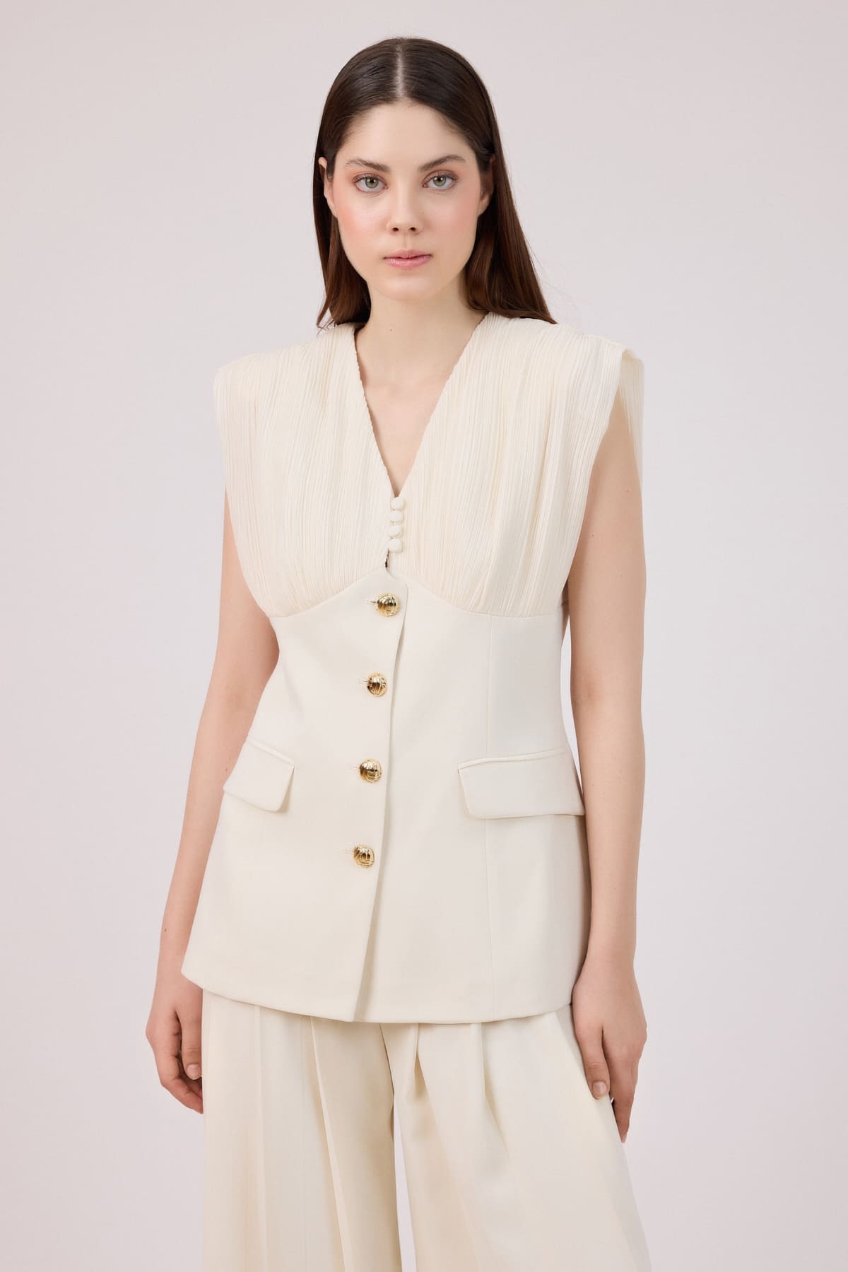 ÜRÜN BİLGİSİ:Üst kısmı uyumlu renkte pliseli şifon kumaştan kup detaylı,önü düğme kapamalı,astarlı şık yelek