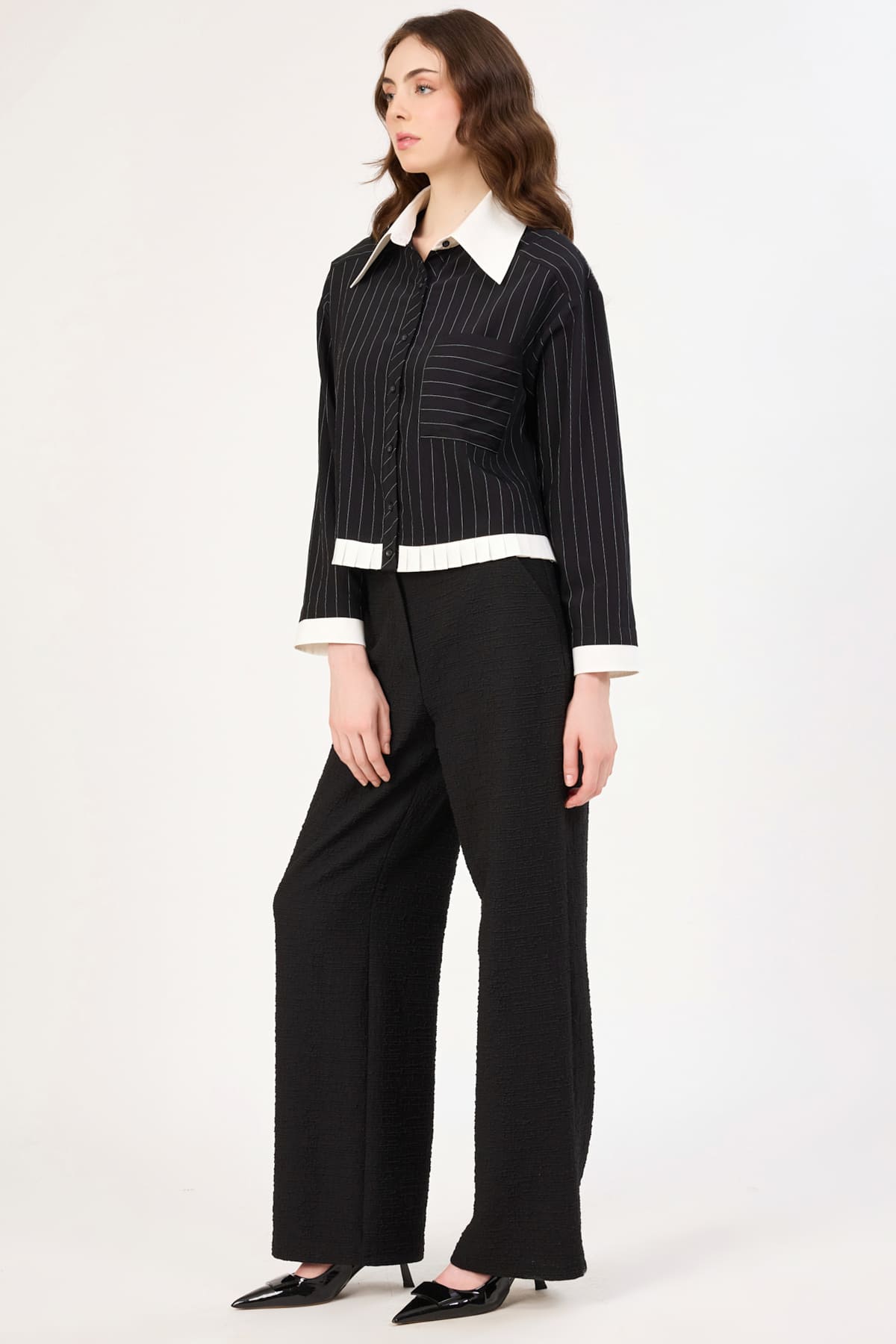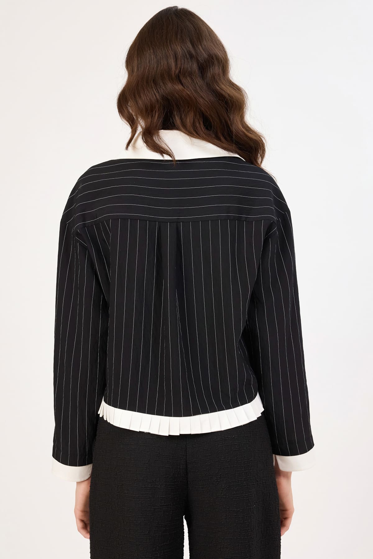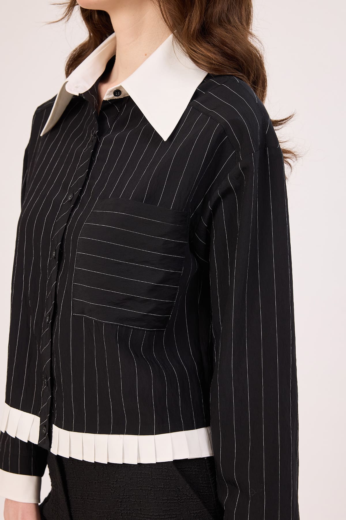 ÜRÜN BİLGİSİ:Viskonlu doğal elyaflı kumaş,çizgili garnili,etek ucu plise detaylı,cepli,uzun kollu şık gömlek.