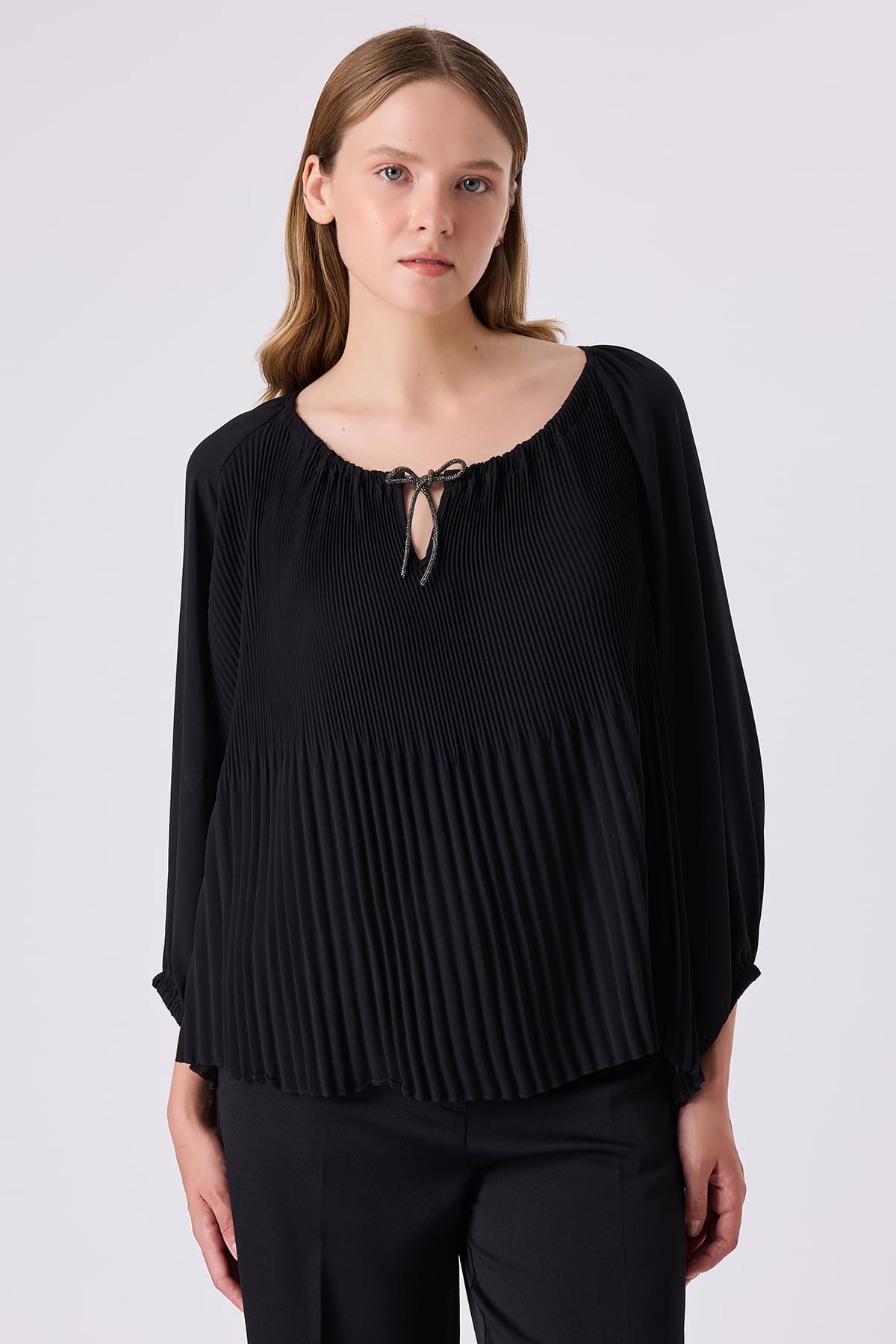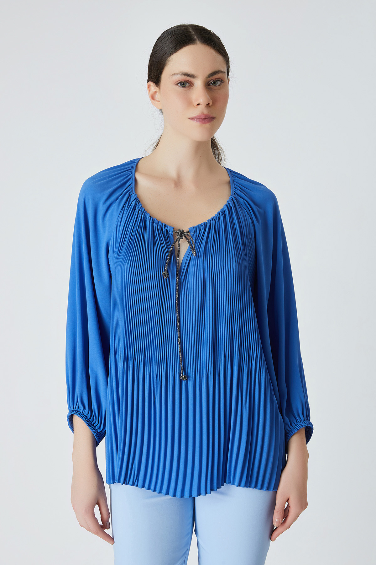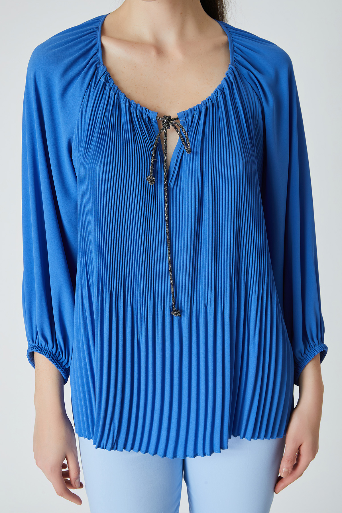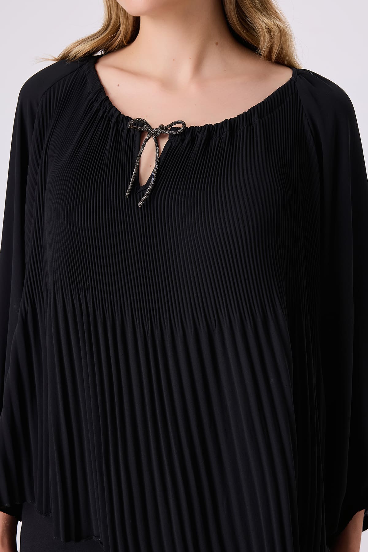 ÜRÜN BİLGİSİ:Dökümlü plise detaylı kumaş,reglan kollu,yakası büzgülü,parlak şerit bağcıklı,kol ucu lastikli,rahat form bluz.