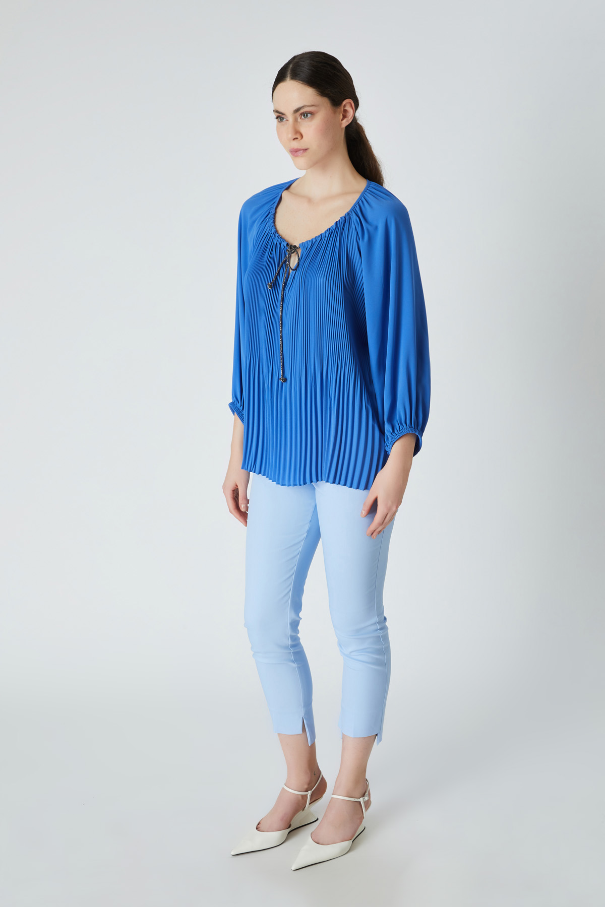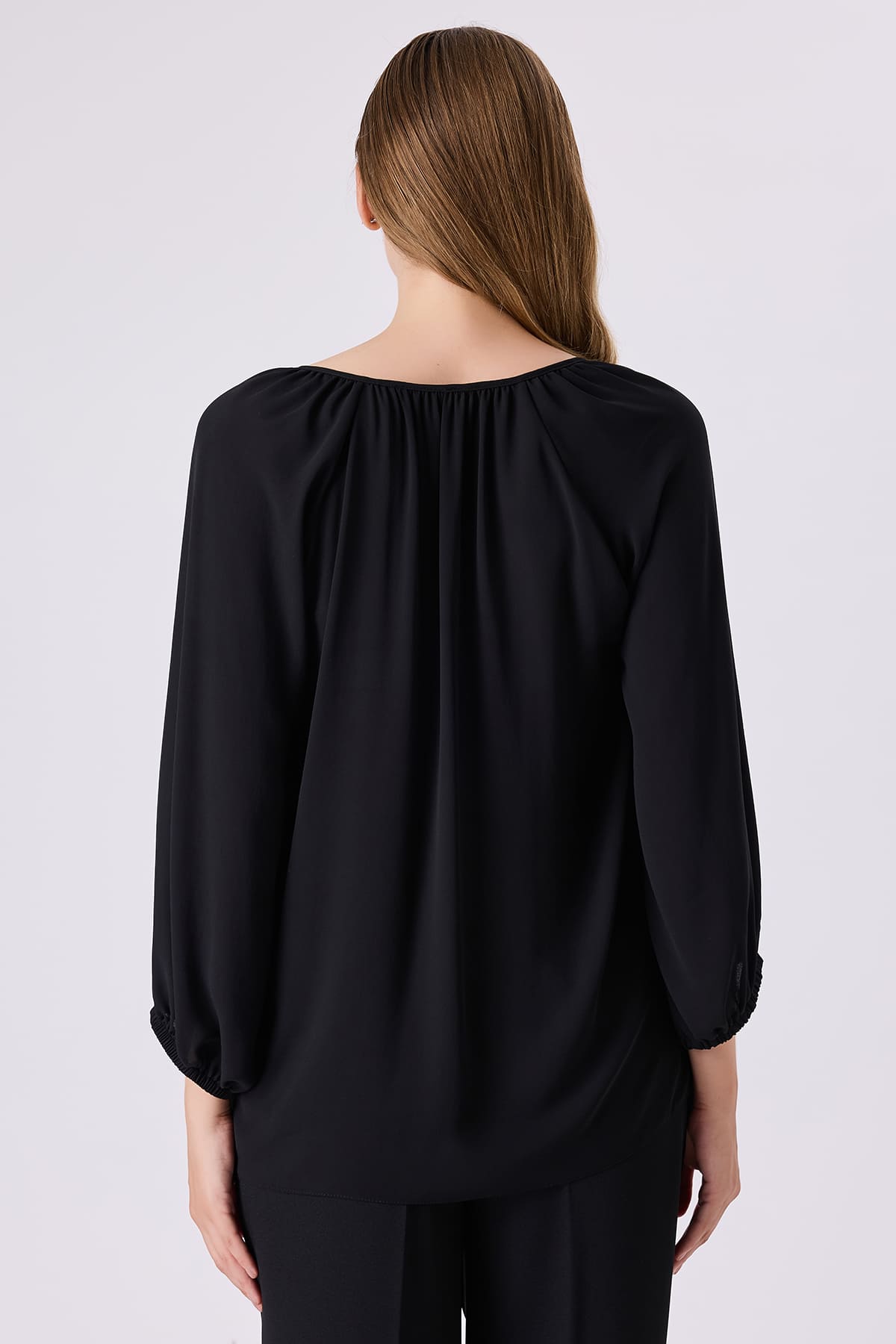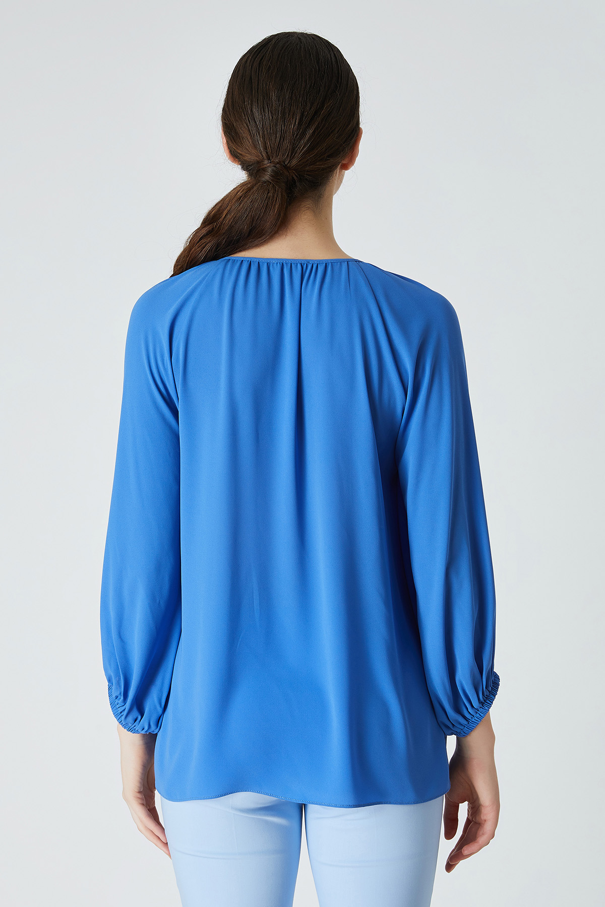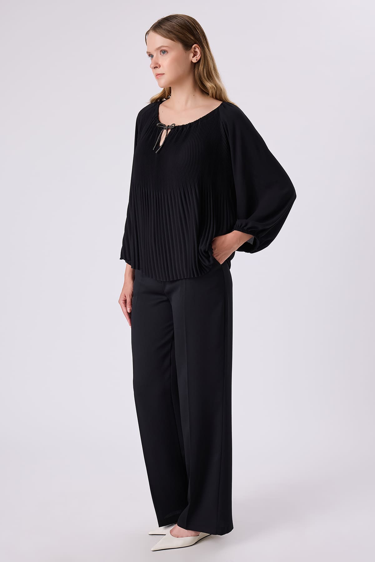 ÜRÜN BİLGİSİ:Dökümlü plise detaylı kumaş,reglan kollu,yakası büzgülü,parlak şerit bağcıklı,kol ucu lastikli,rahat form bluz.