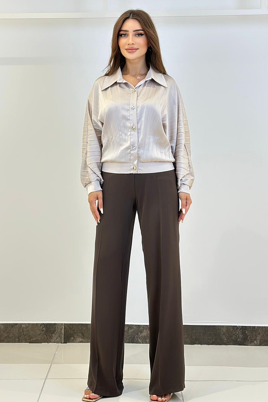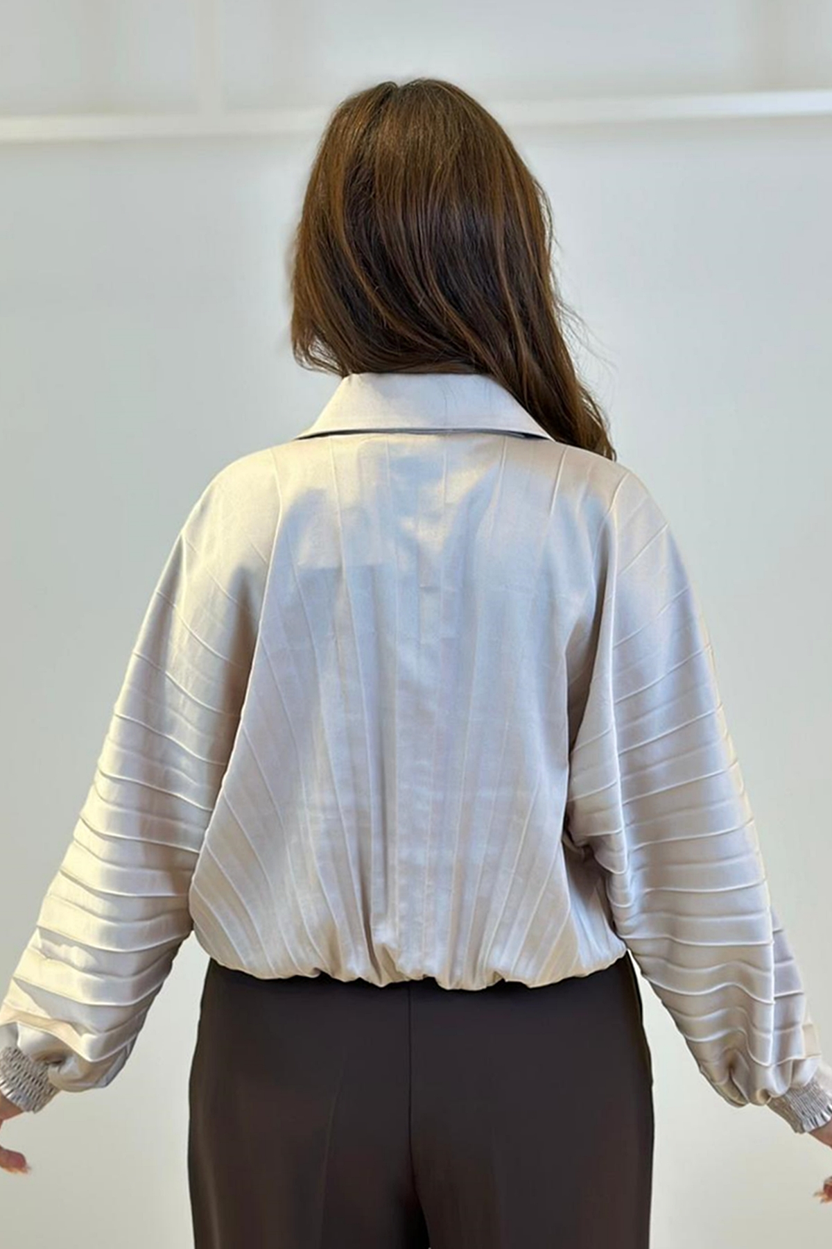 ÜRÜN BİLGİSİ:Dökümlü parlak yüzeyli kumaş,plise efektli,kolları ve arkası lastik dikişli,rahat form şık gömlek.