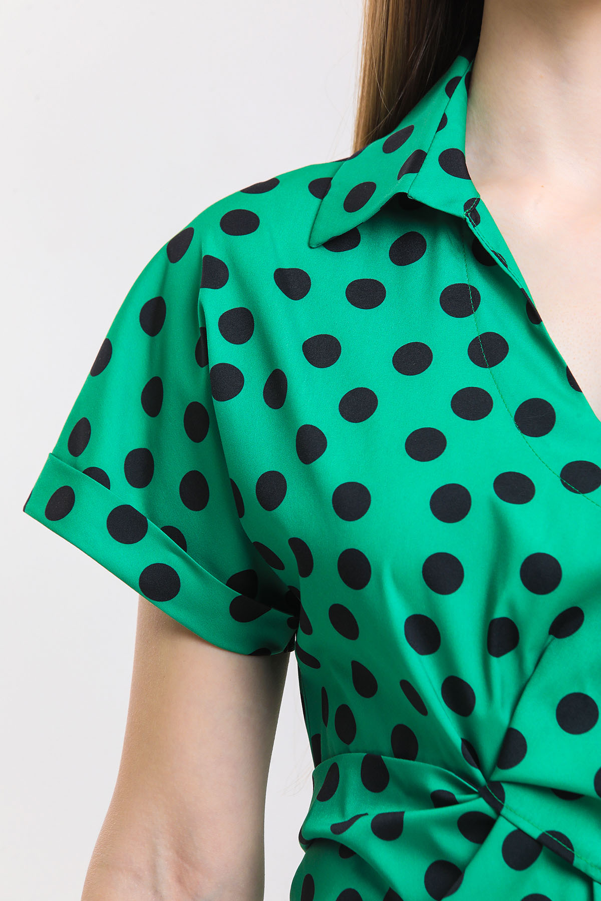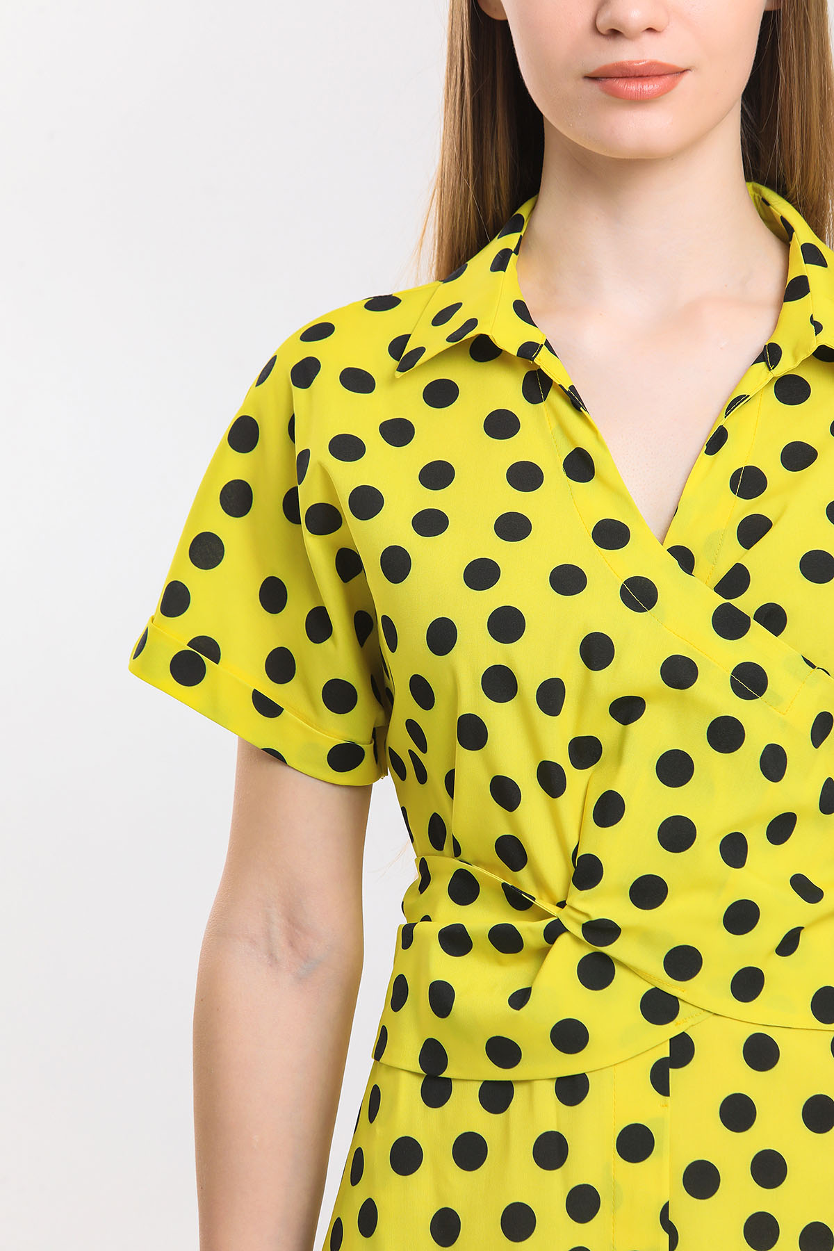 ÜRÜN BİLGİSİ:Kontrast renkte puanlı,yakalı,önü çapraz bağlamalı,düşük kısa kollu,astarsız elbise