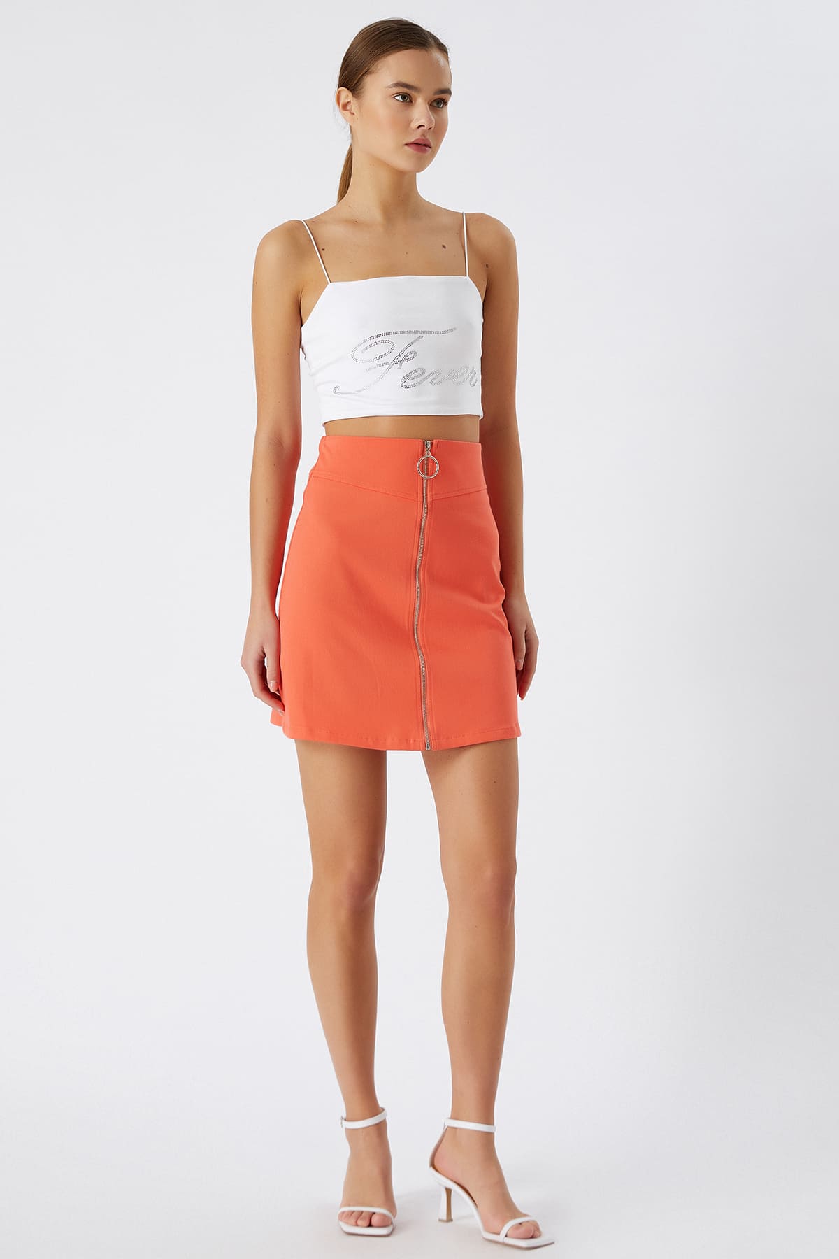 ÜRÜN BİLGİSİ:Doğal elyaf pamuk ve elastan karışımlı kumaş,önü metal fermuarlı,astarsız kısa etek