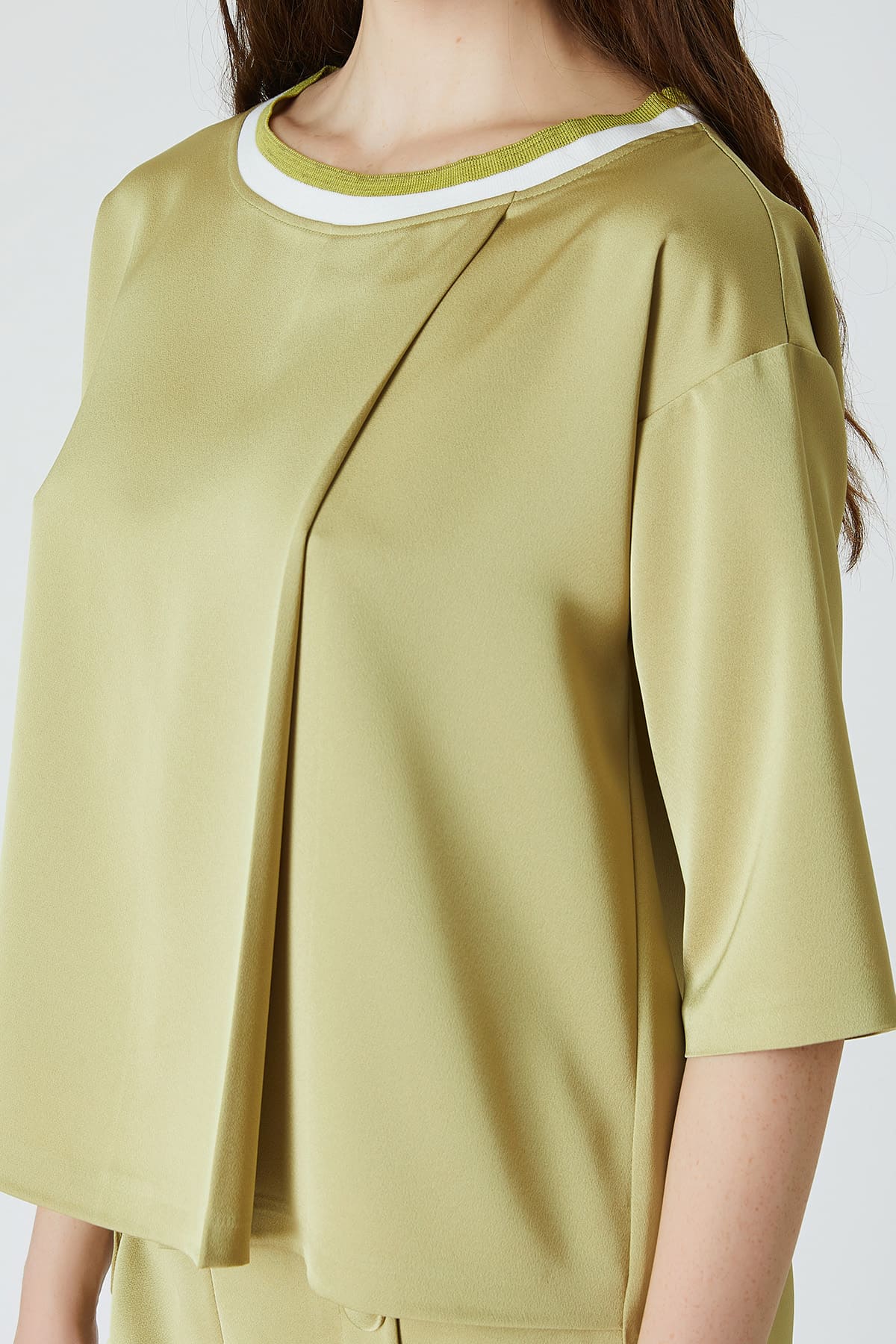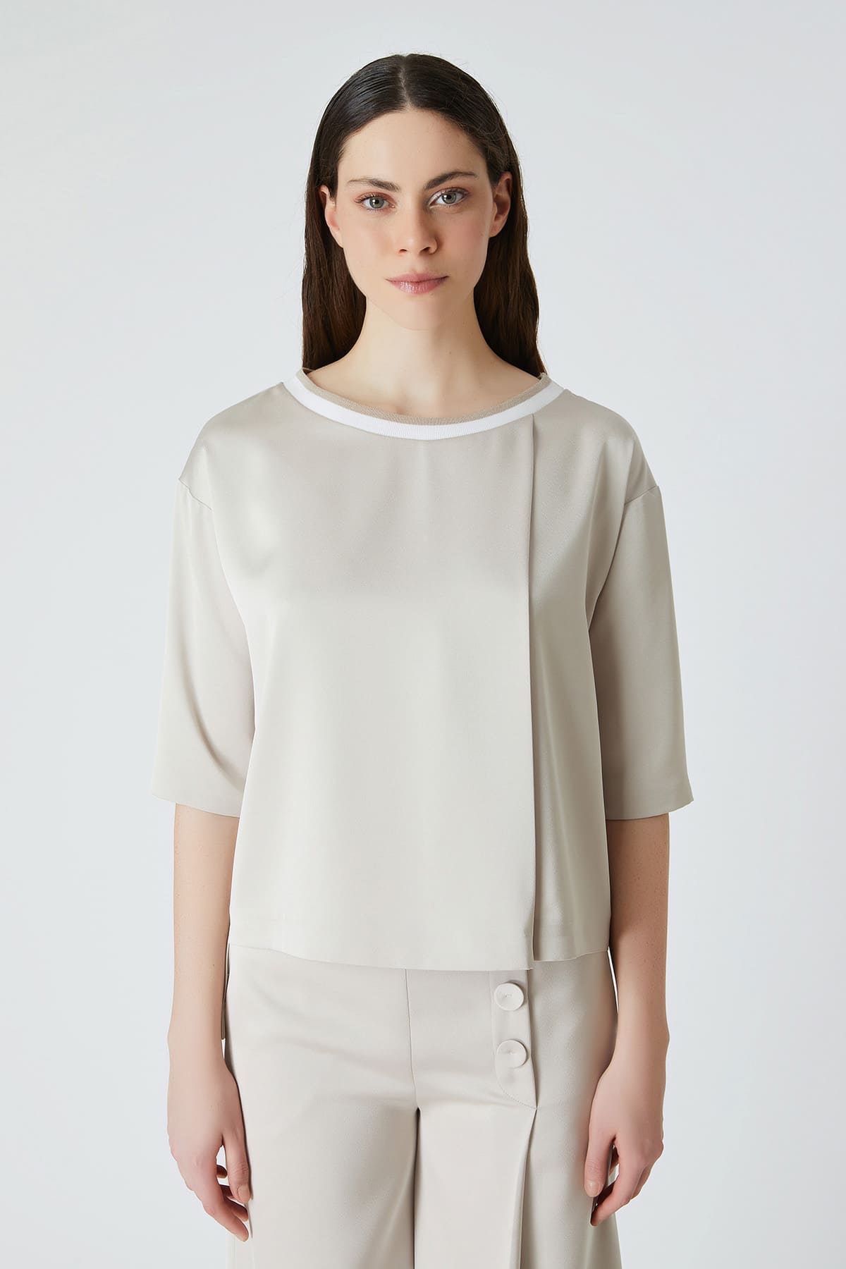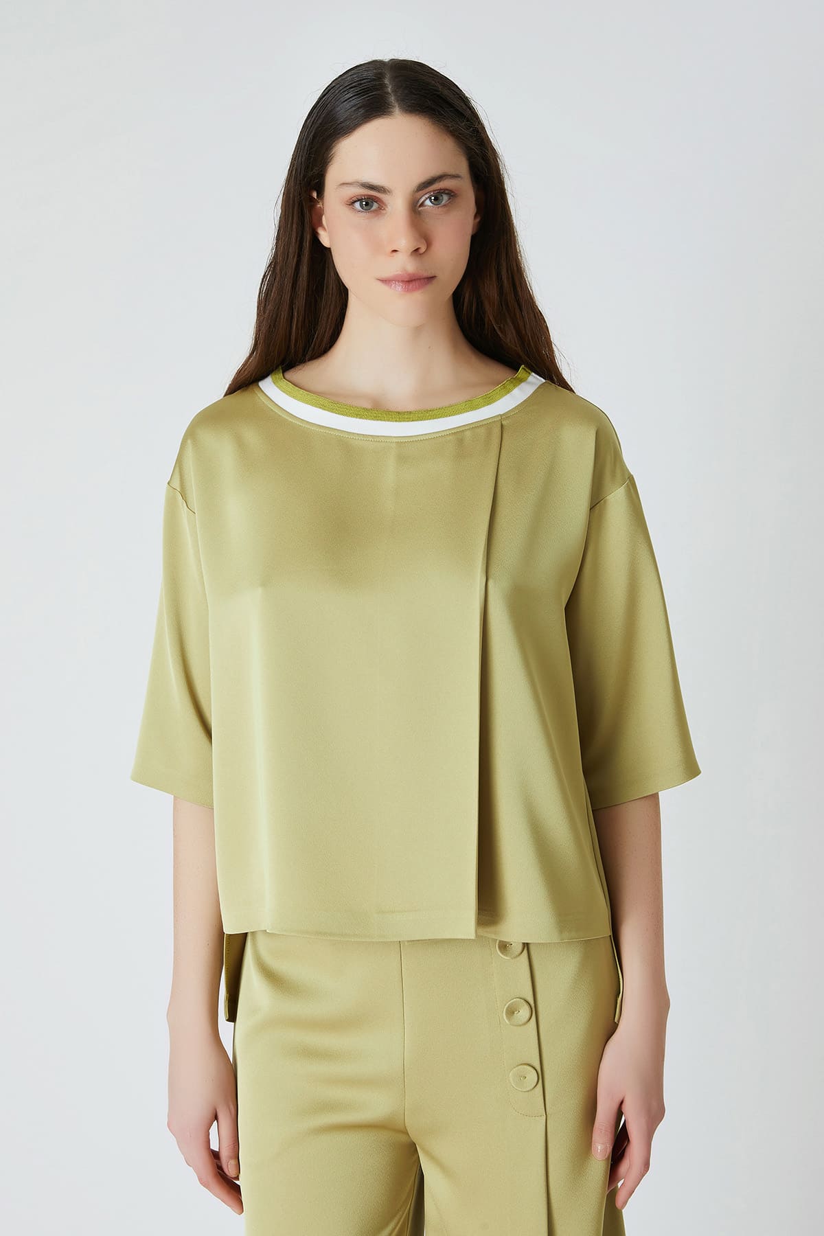 ÜRÜN BİLGİSİ:Parlak yüzeyli dökümlü kumaş,yakası ribanalı,yarım kollu,ön ve arkası katlama detaylı,arka etek ucu uzun,rahat form şık bluz.