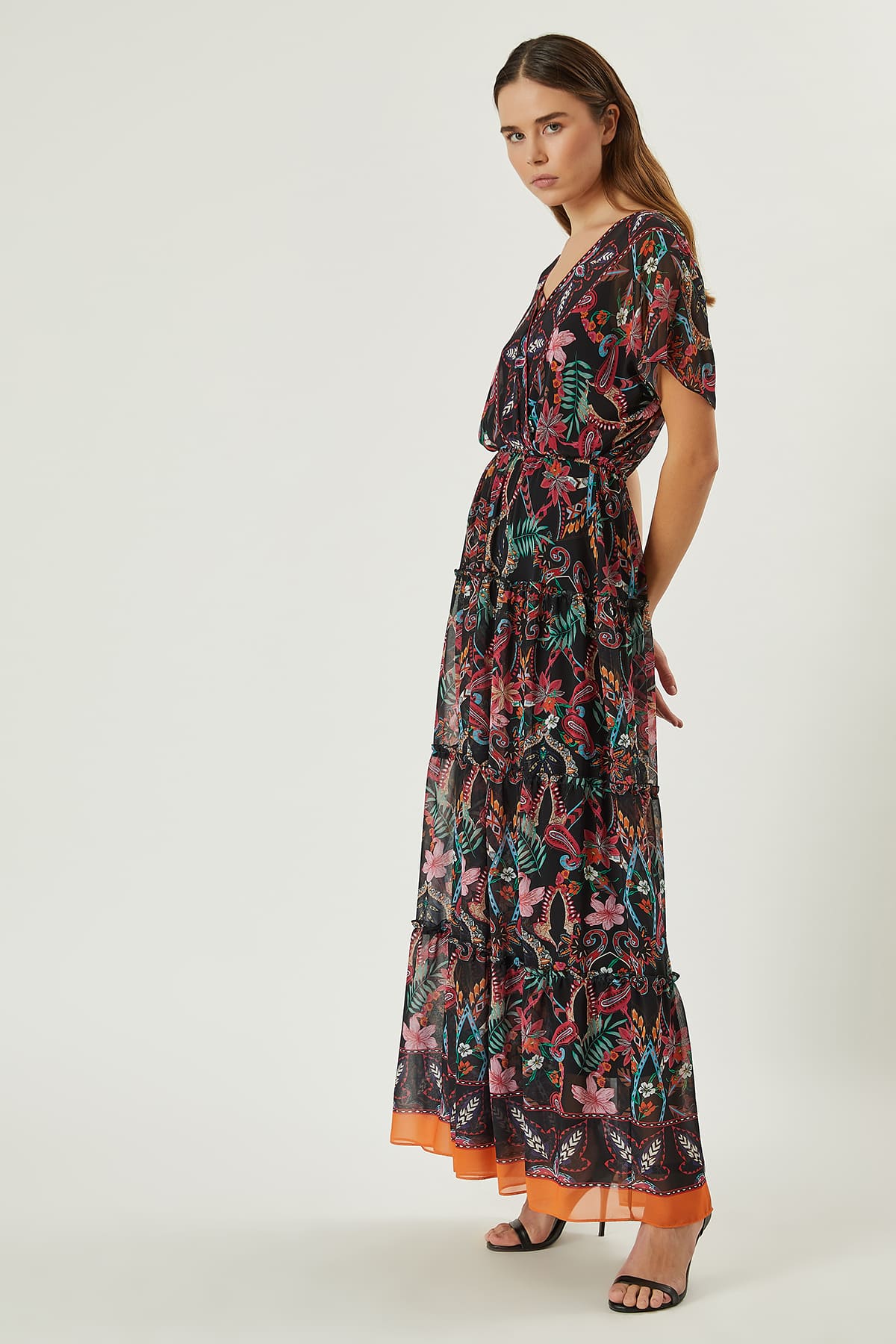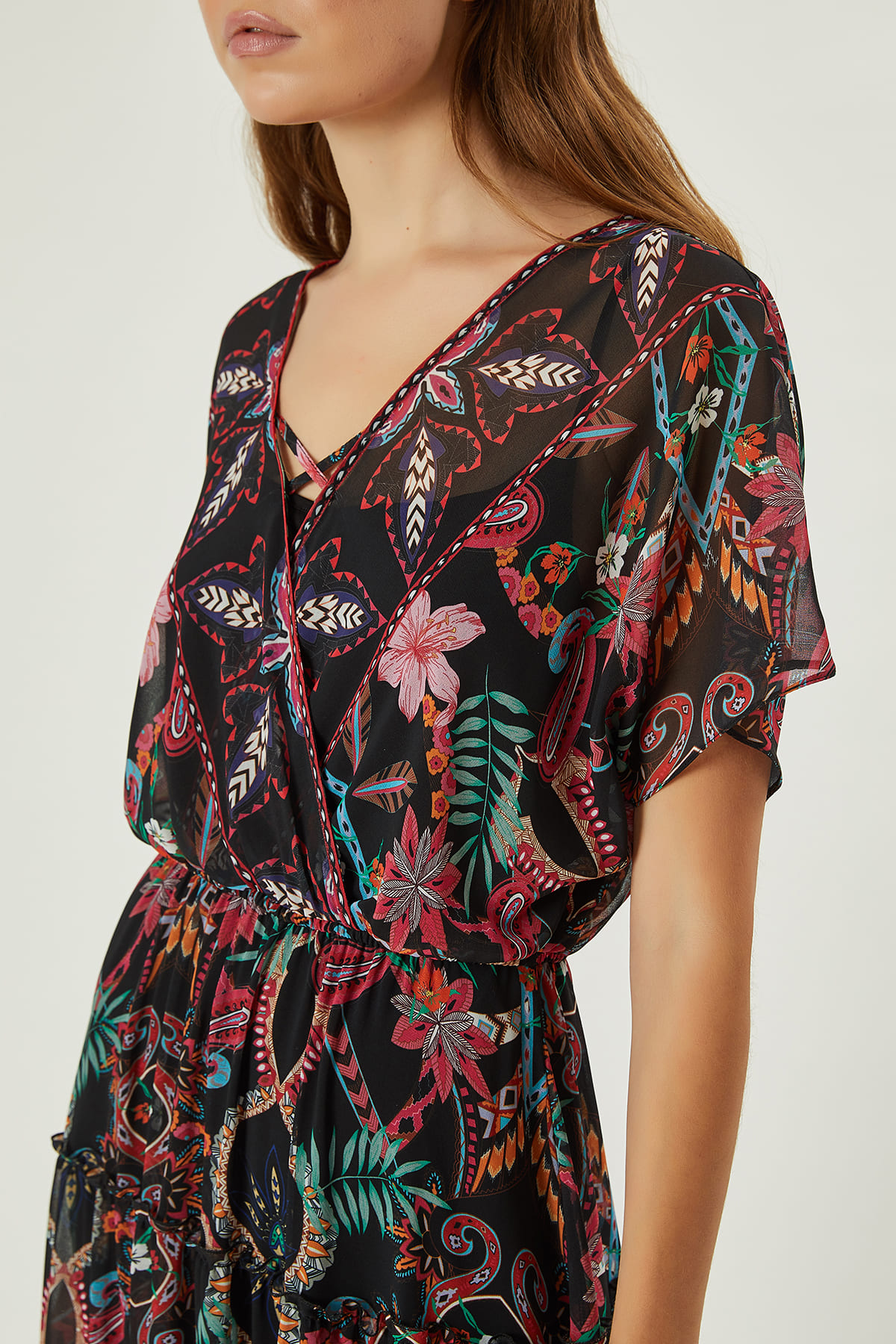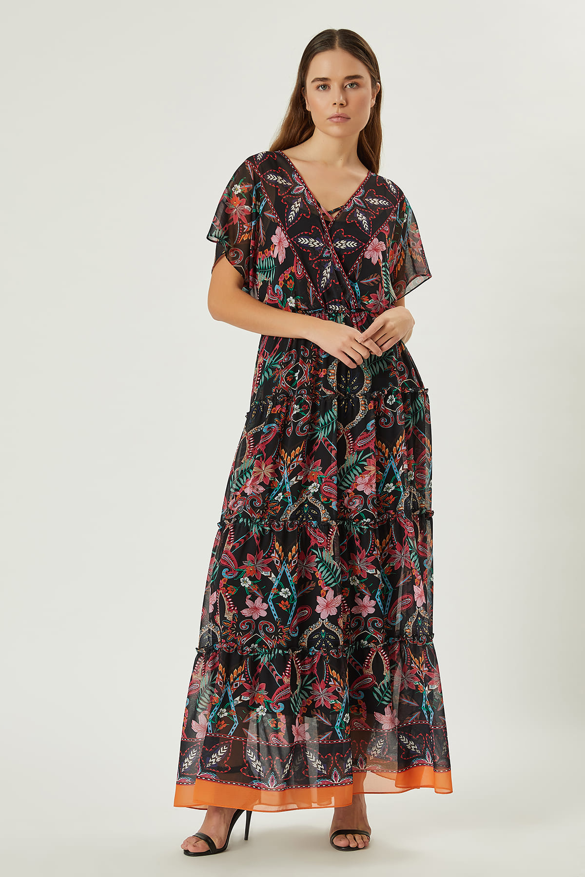 ÜRÜN BİLGİSİ:Dökümlü şifon kumaş,karışık renkli şal desenli,anvelop yakalı,düşük kollu,etek parçası kuplu ve büzgülü,içi astar elbiseli,uzun elbise