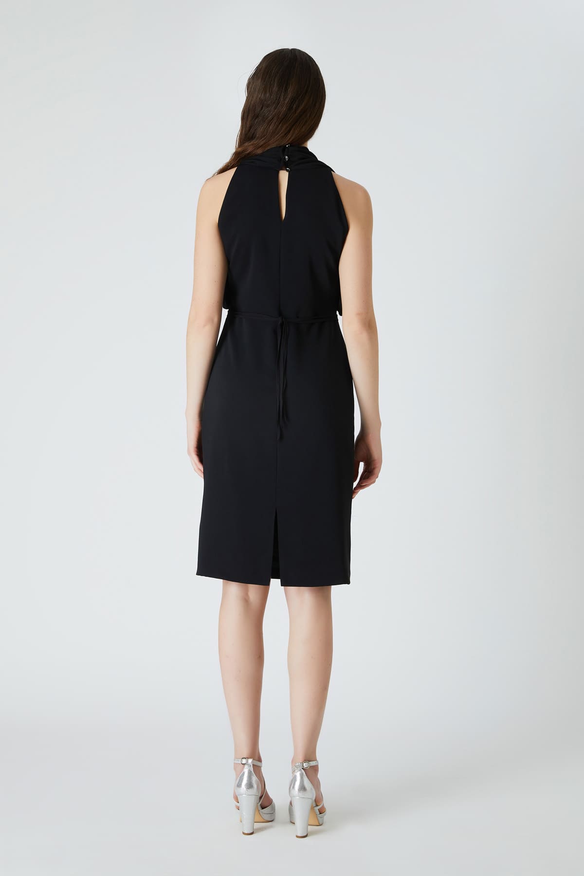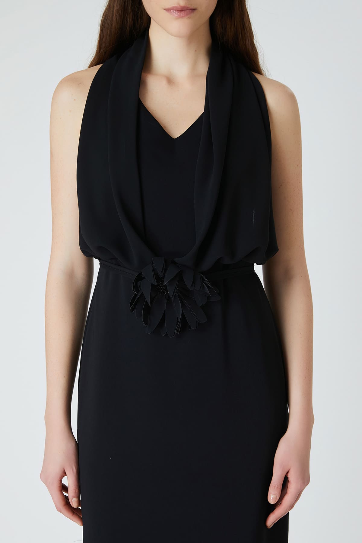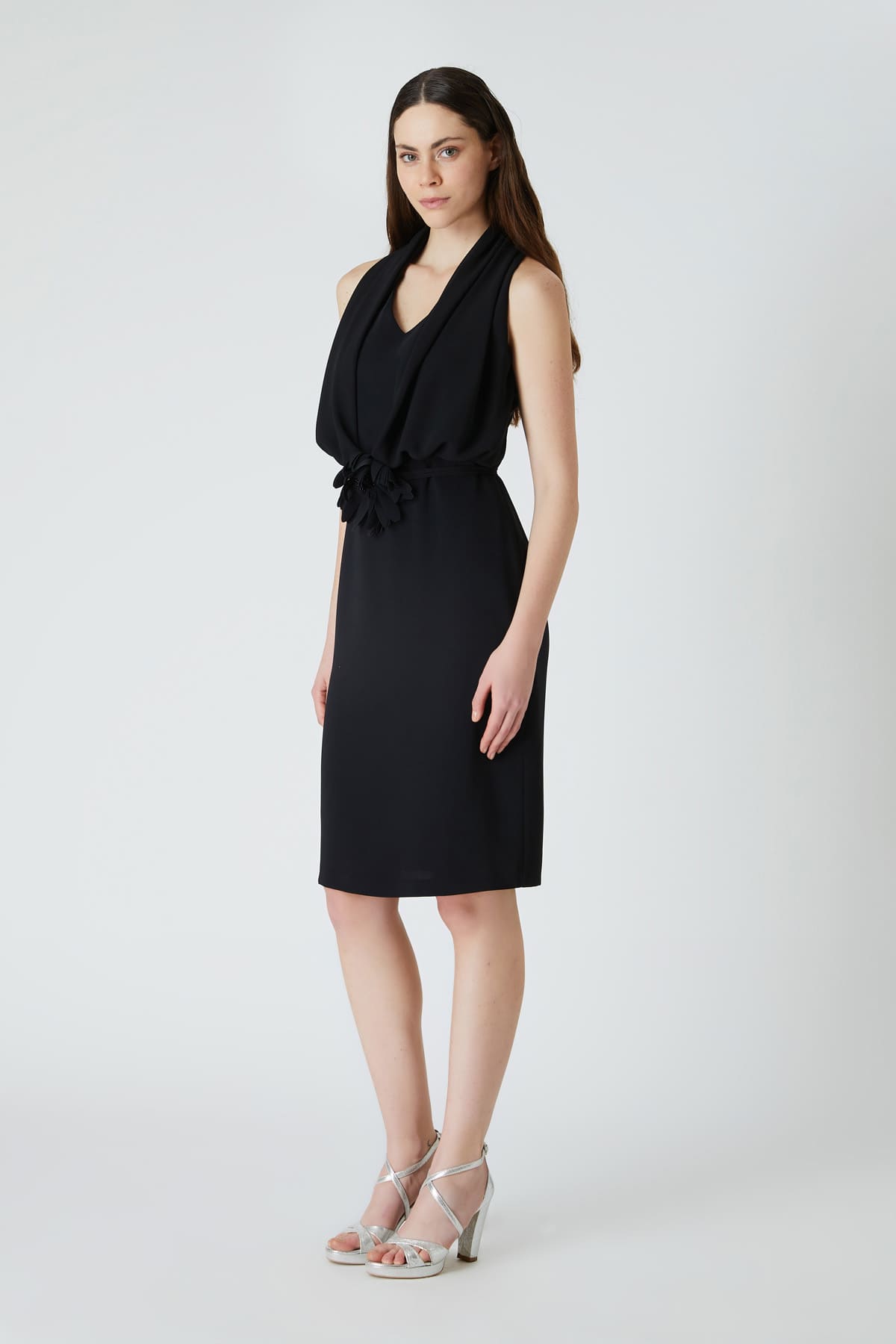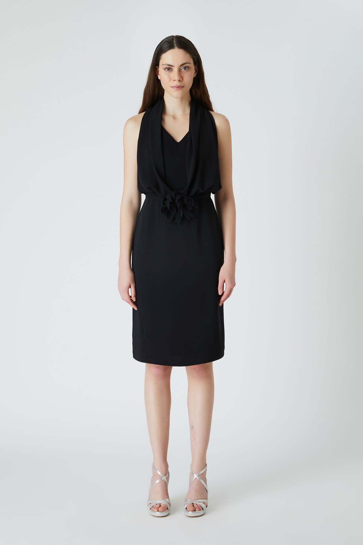 ÜRÜN BİLGİSİ:Dökümlü kumaş,şal yakalı,arka yakası düğmeli,kolsuz,çıkarılabilir çicek detaylı,eteği düz form astarlı elbise.