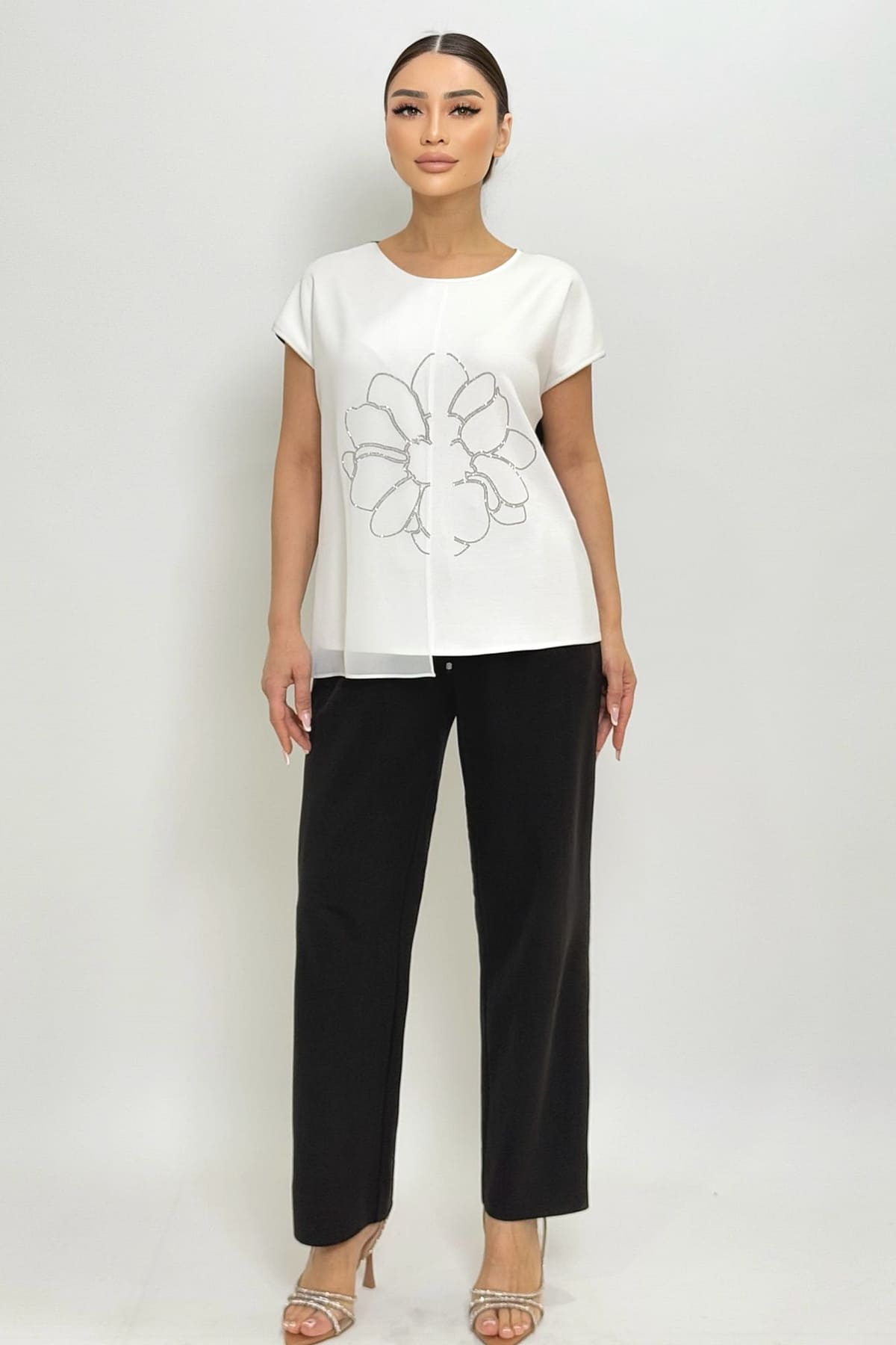 ÜRÜN BİLGİSİ:Likralı hafif ve yumuşak dokulu viskon kumaş,yuvarlak yakalı,kısa kollu,tasarım taş yapıştırmalı,tek tarafı transparan şifonlu,düz form şık bluz.