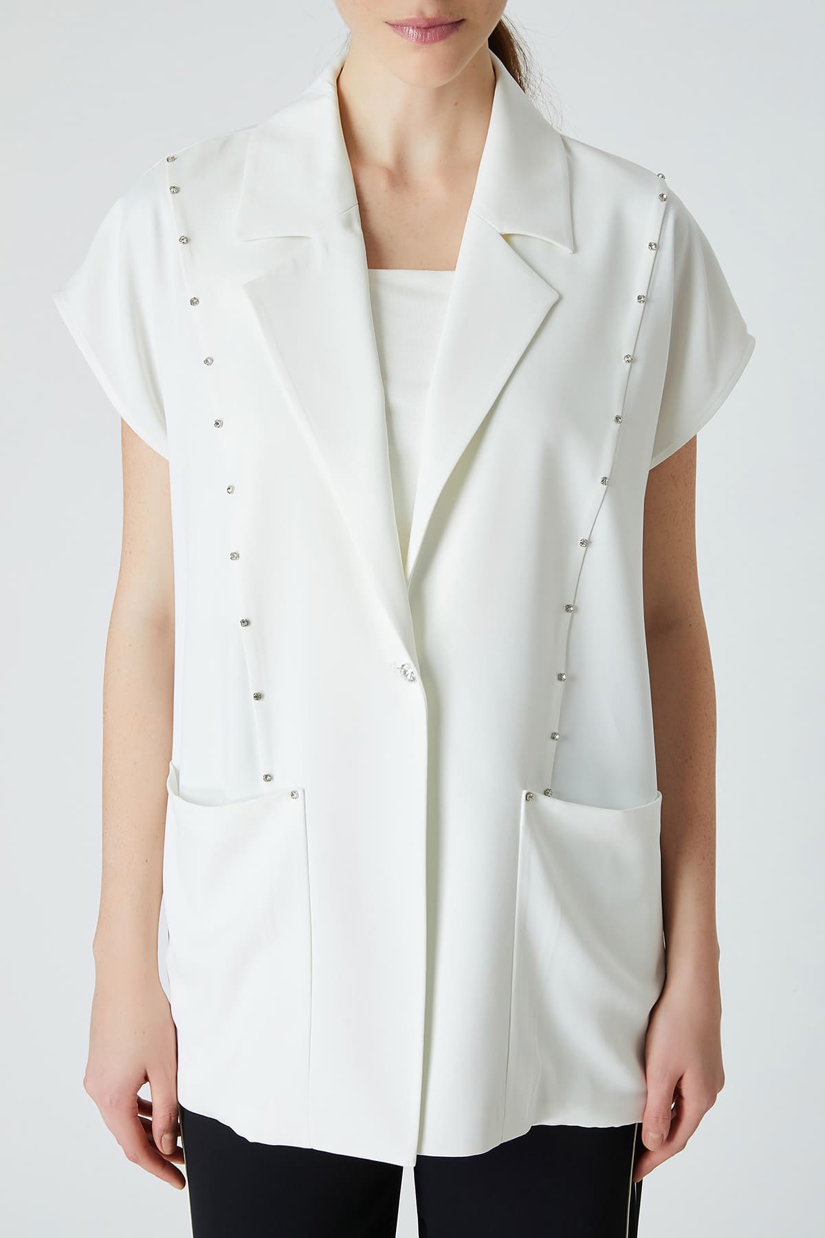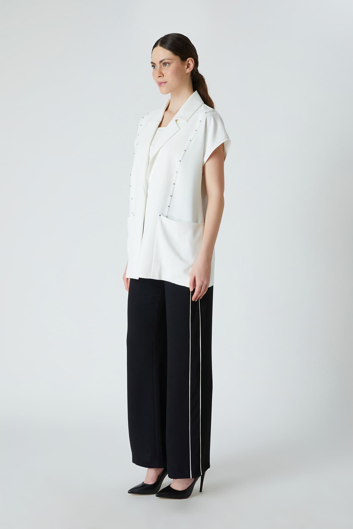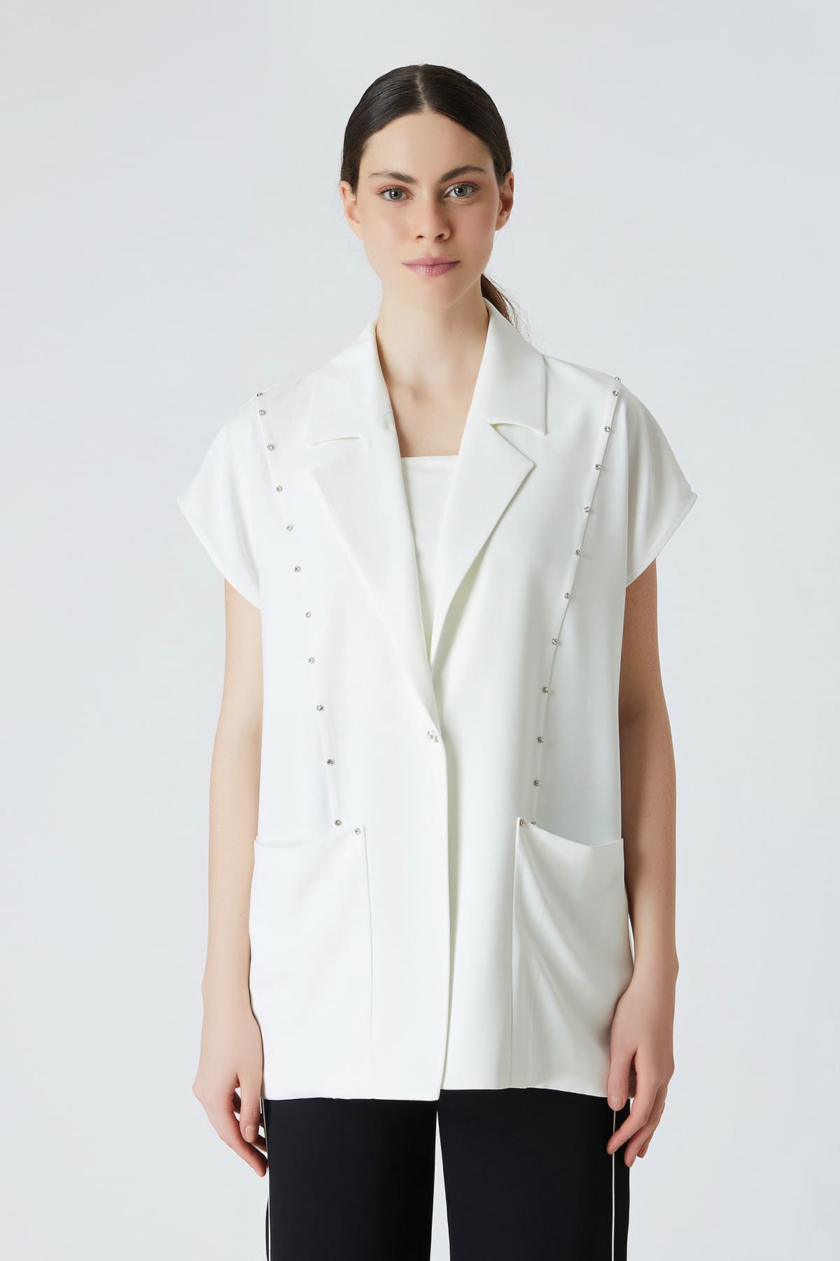 ÜRÜN BİLGİSİ:Dökümlü kumaş,ceket yakalı,önü kuplu,düşük kollu,cepli,düğme kapamalı,taş detaylı,rahat form şık yelek.