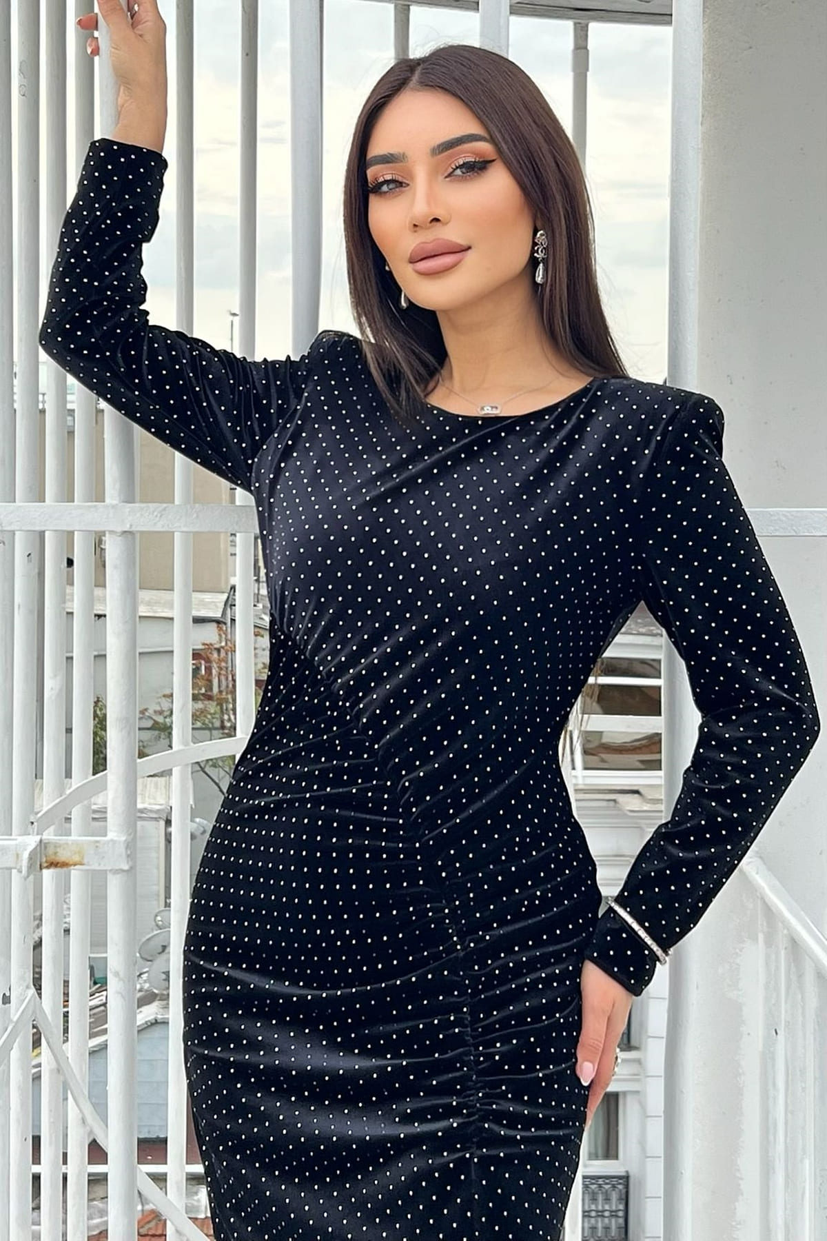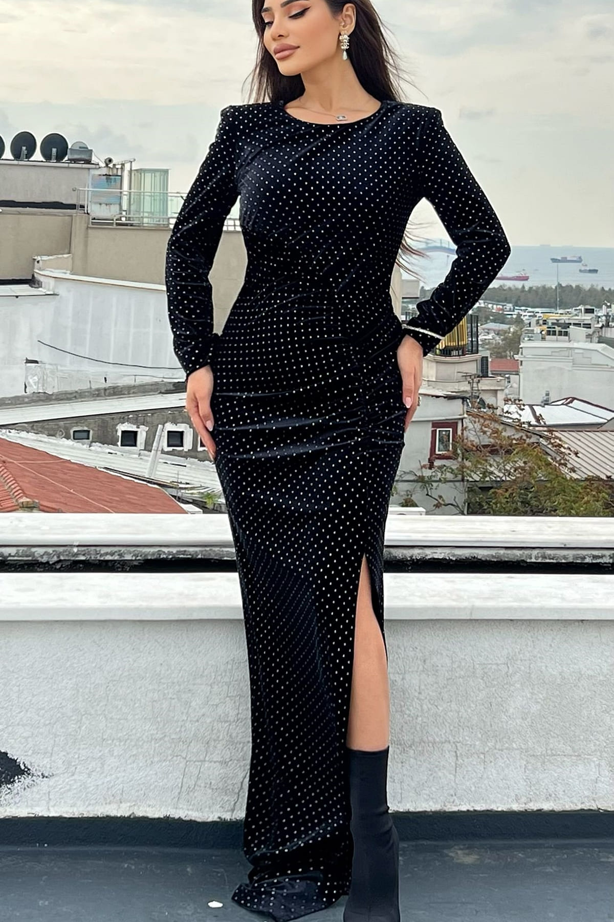 ÜRÜN BİLGİSİ:Üzeri küçük metalik taş yapıştırmalı,kadife yüzeyli,esnek dokulu kumaş,önü büzgü detaylı.yırtmaçlı,astarlı,uzun kollu şık elbise