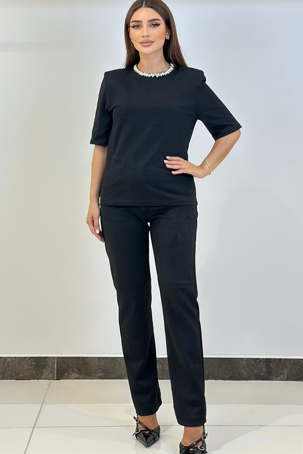 ÜRÜN BİLGİSİ:Likralı örme bluz,ribana yakalı,taş işlemeli,yarım kollu, düz form örme bluz.
