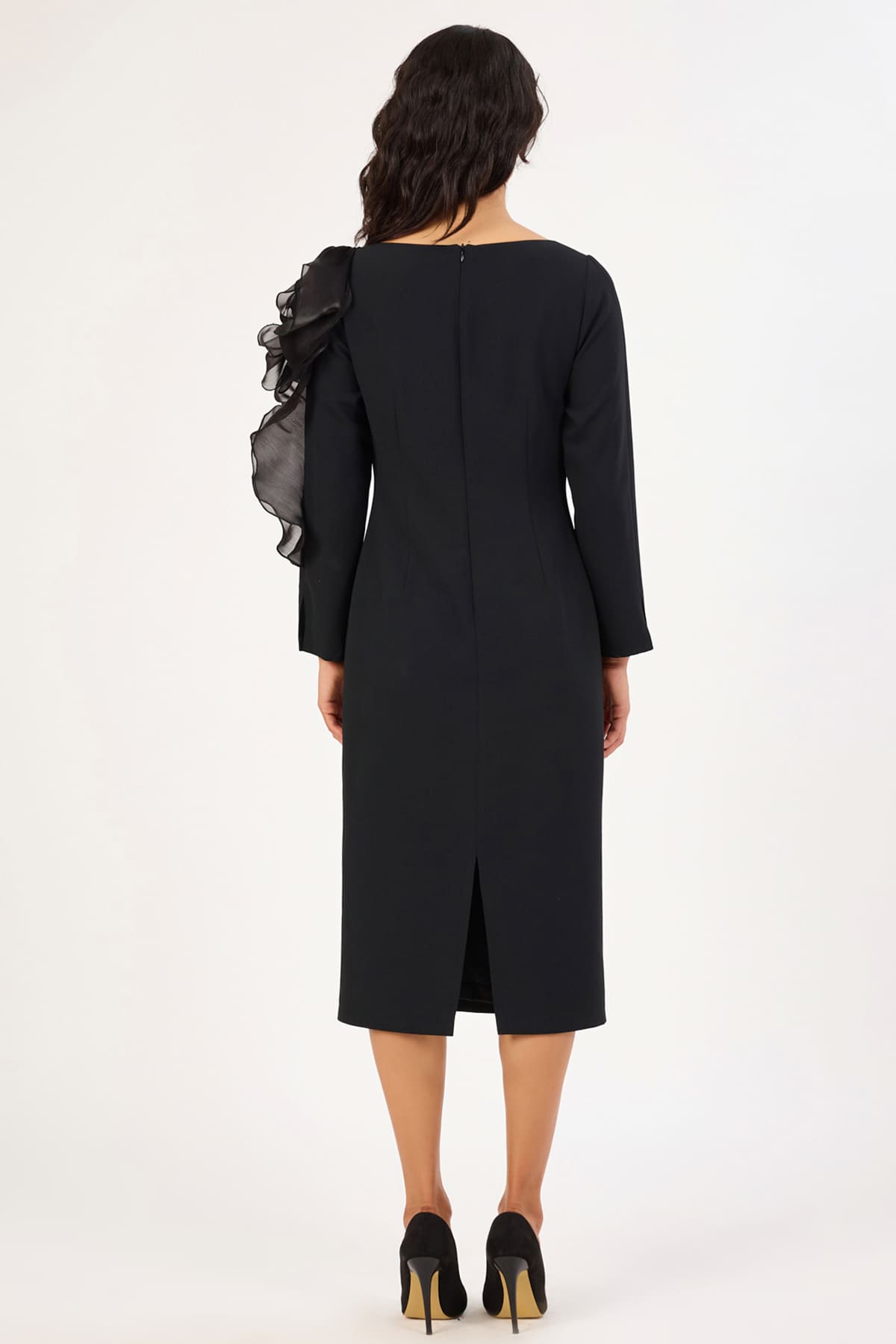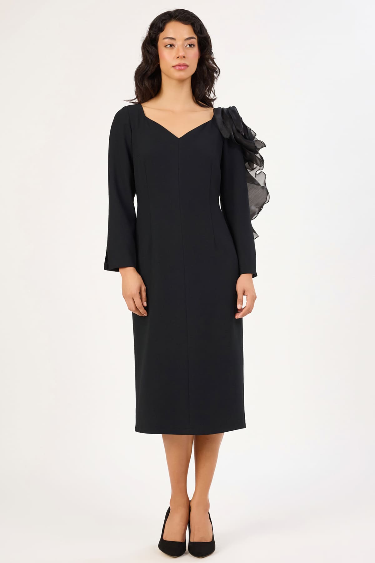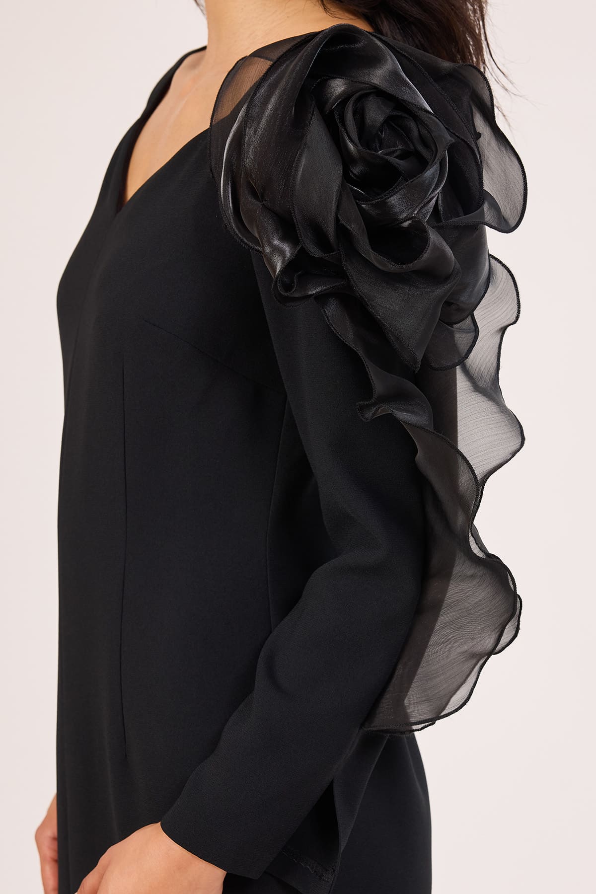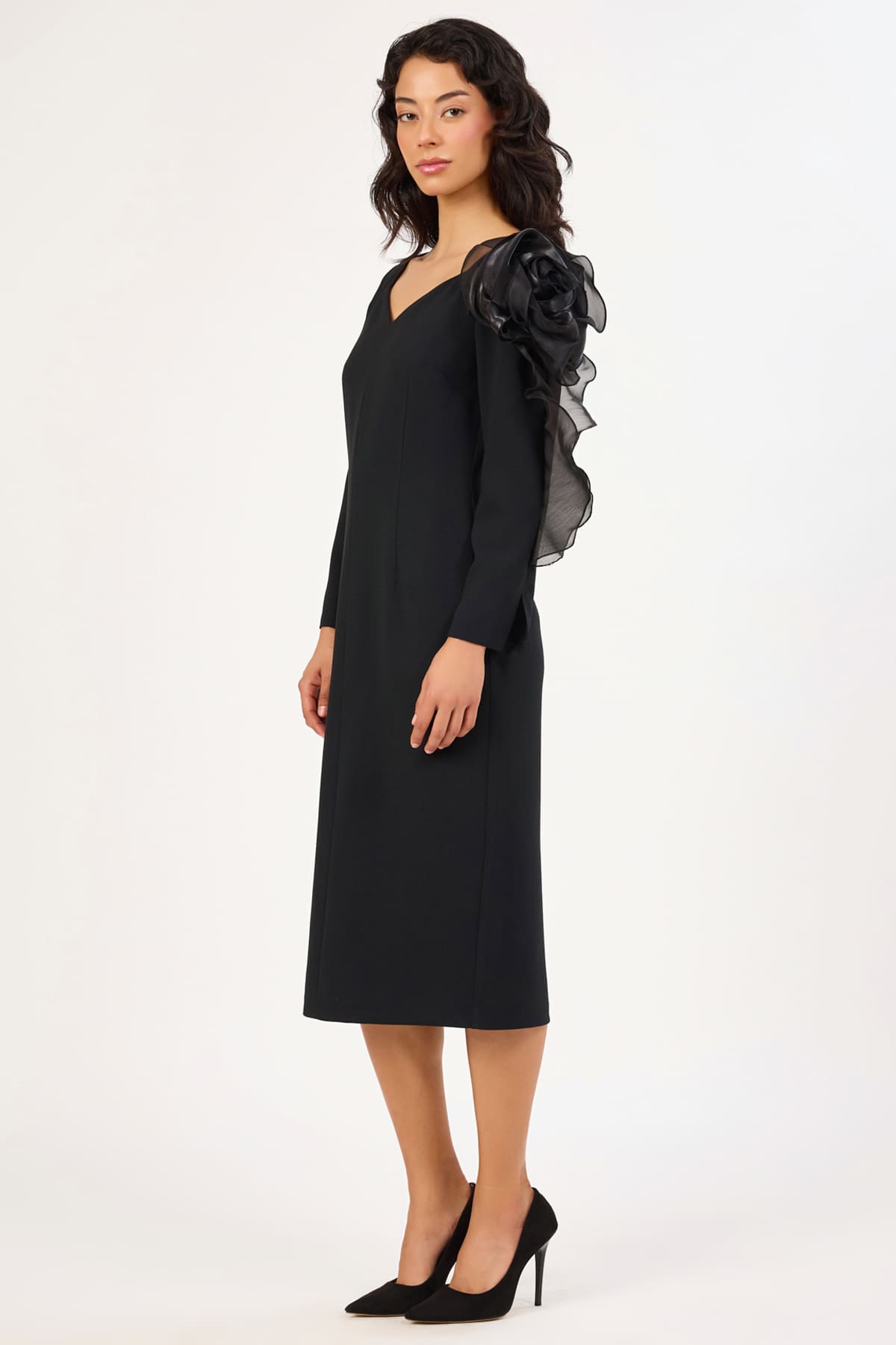 ÜRÜN BİLGİSİ:Dökümlü krep yüzeyli kumaş,açık yakalı,kol ucları yırtmaç detaylı,tasarım çicek dokunuşlu,astarlı,fit form şık elbise.