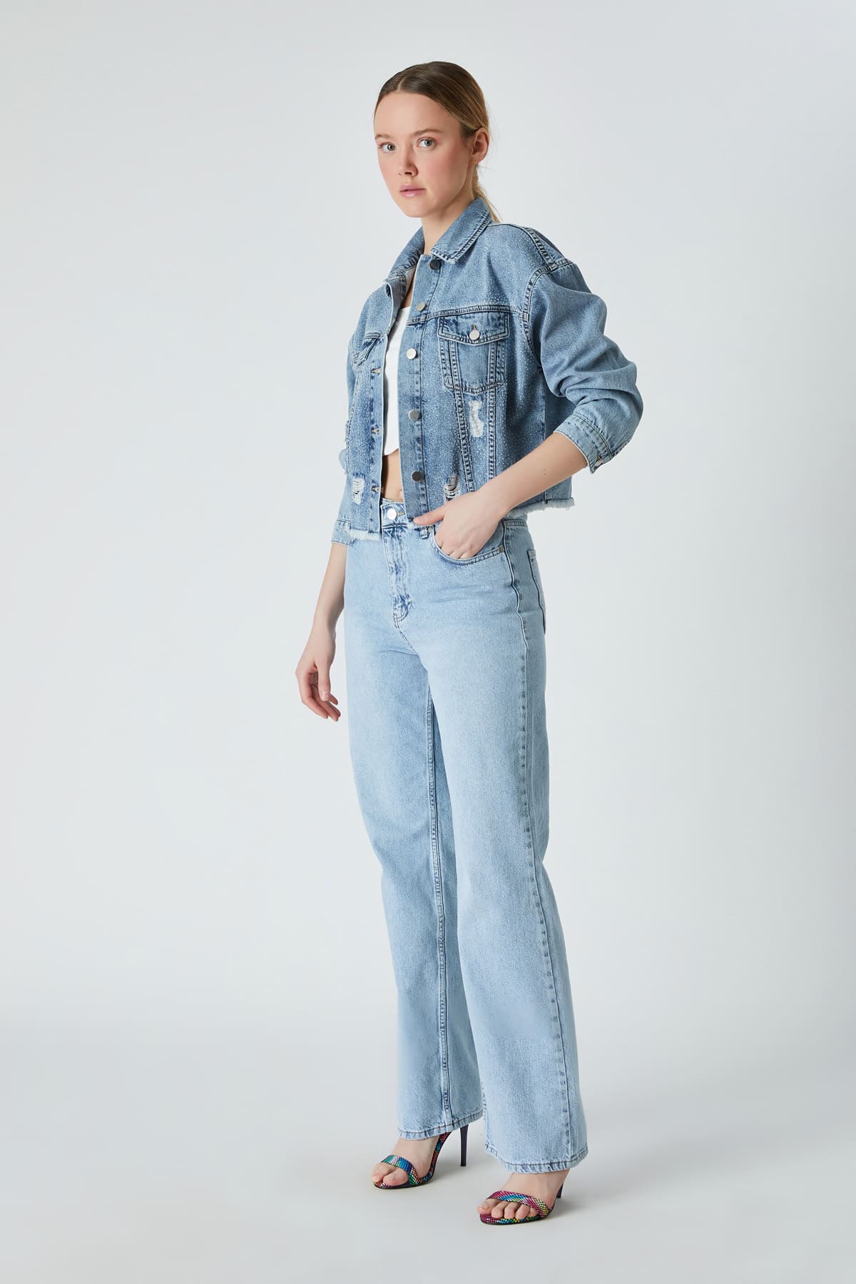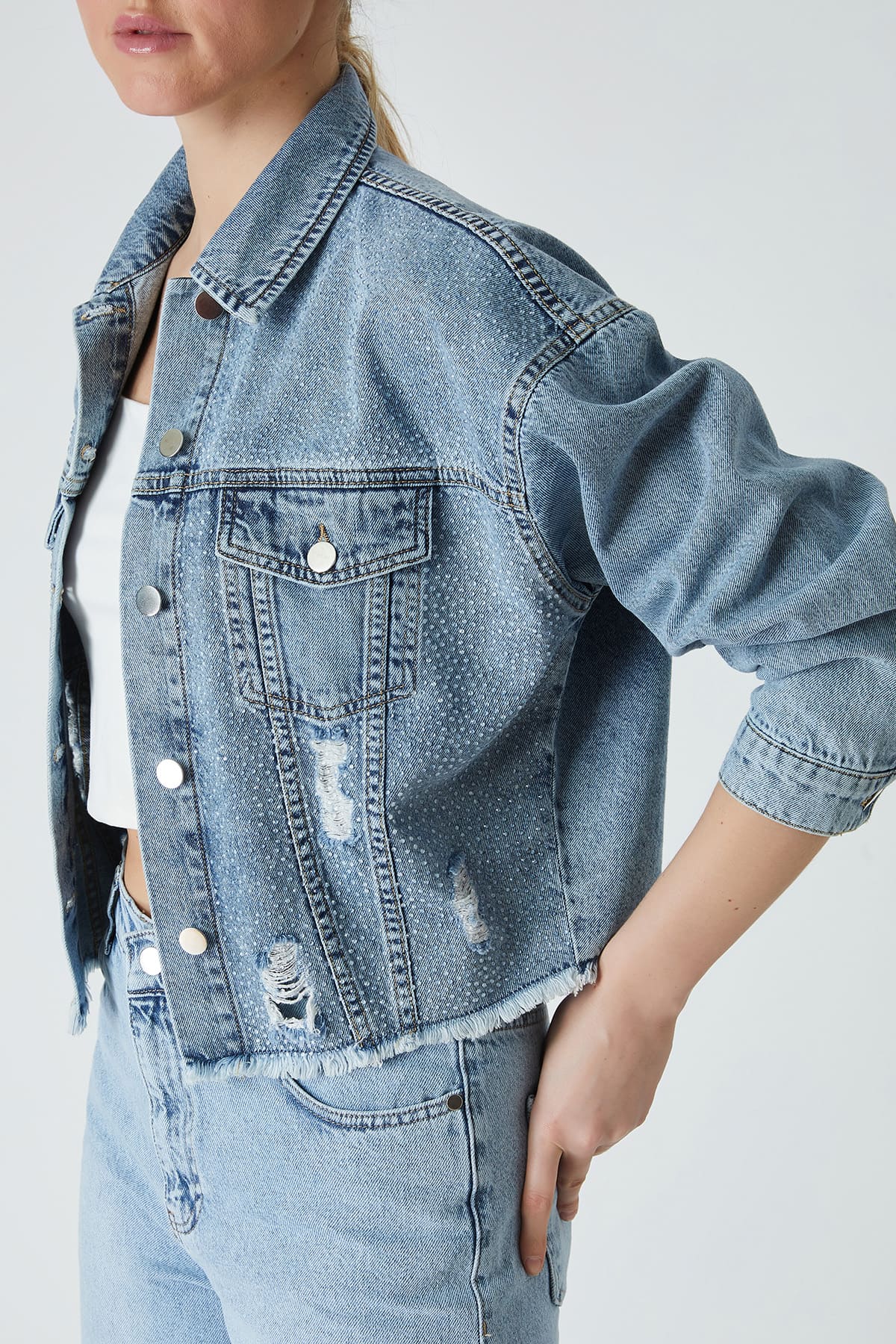 ÜRÜN BİLGİSİ:Yıkamalı denim kumaş,yakalı,cepli,ön bedeni şeffaf taş yapıştırmalı,metal düğmeli,etek ucu kesik detaylı denim ceket.