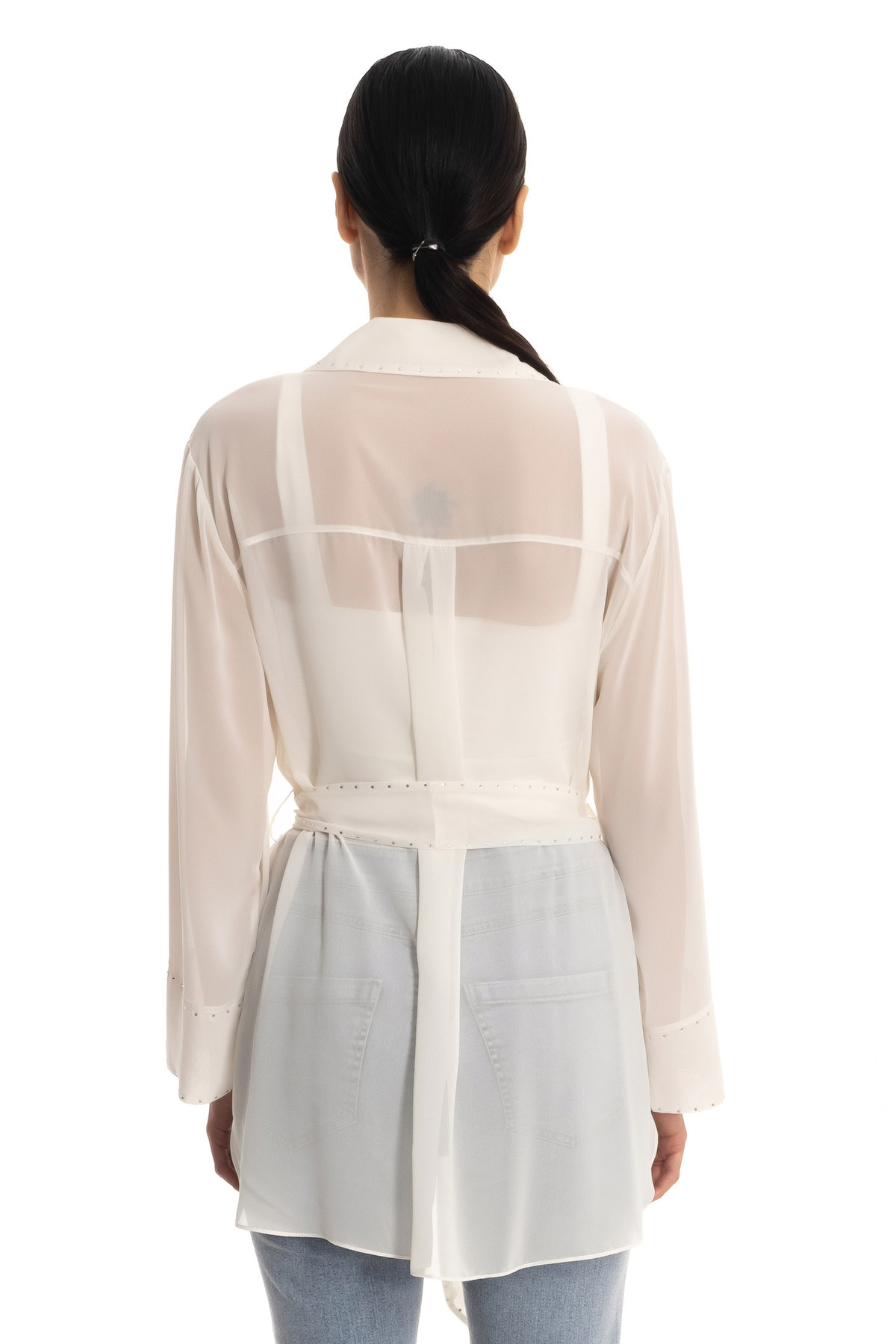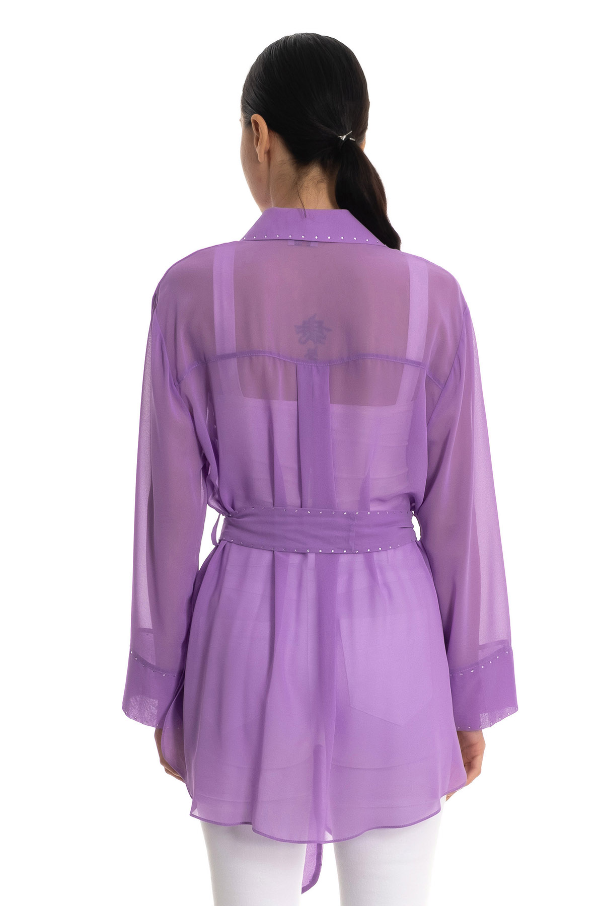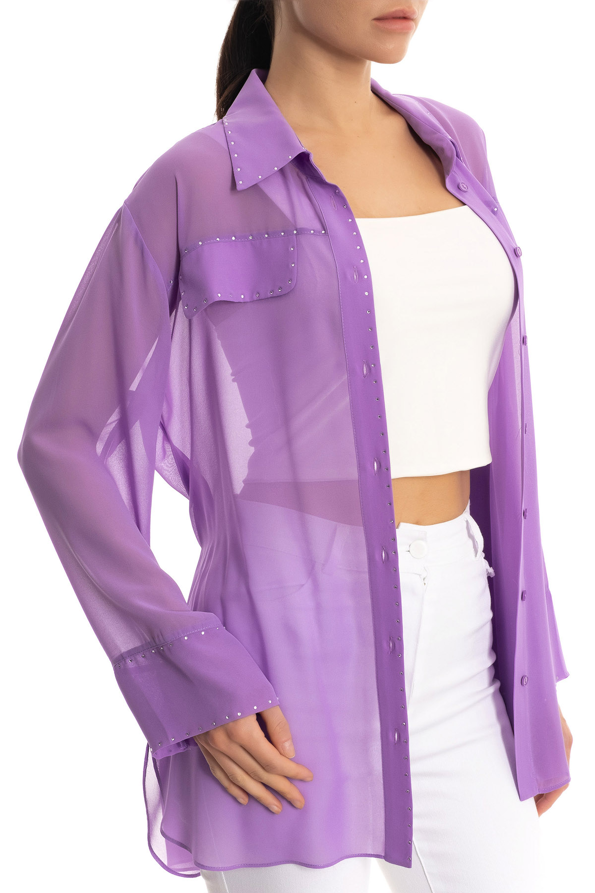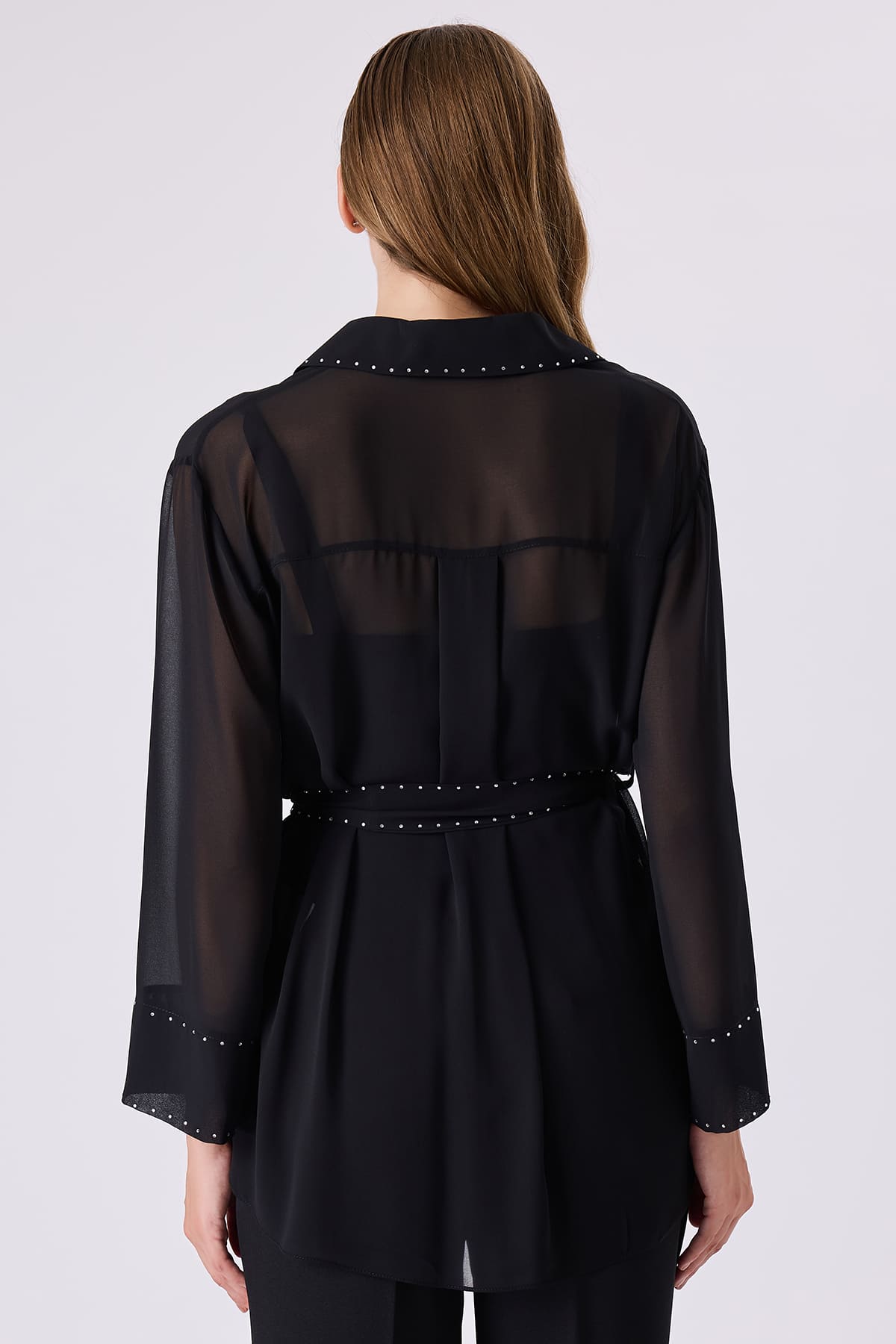 ÜRÜN BİLGİSİ:Dökümlü transparan kumaş,yakalı,uzun kollu,kol ucu katlamalı,taş detaylı,rahat kesim gömlek.