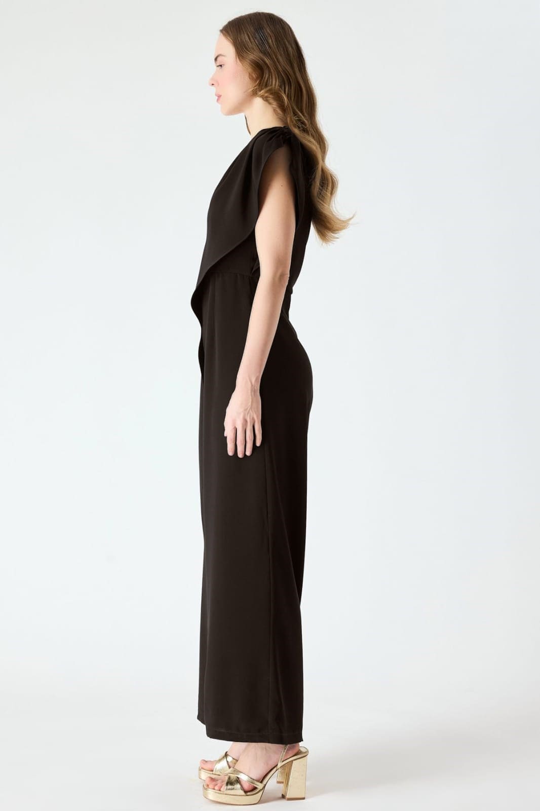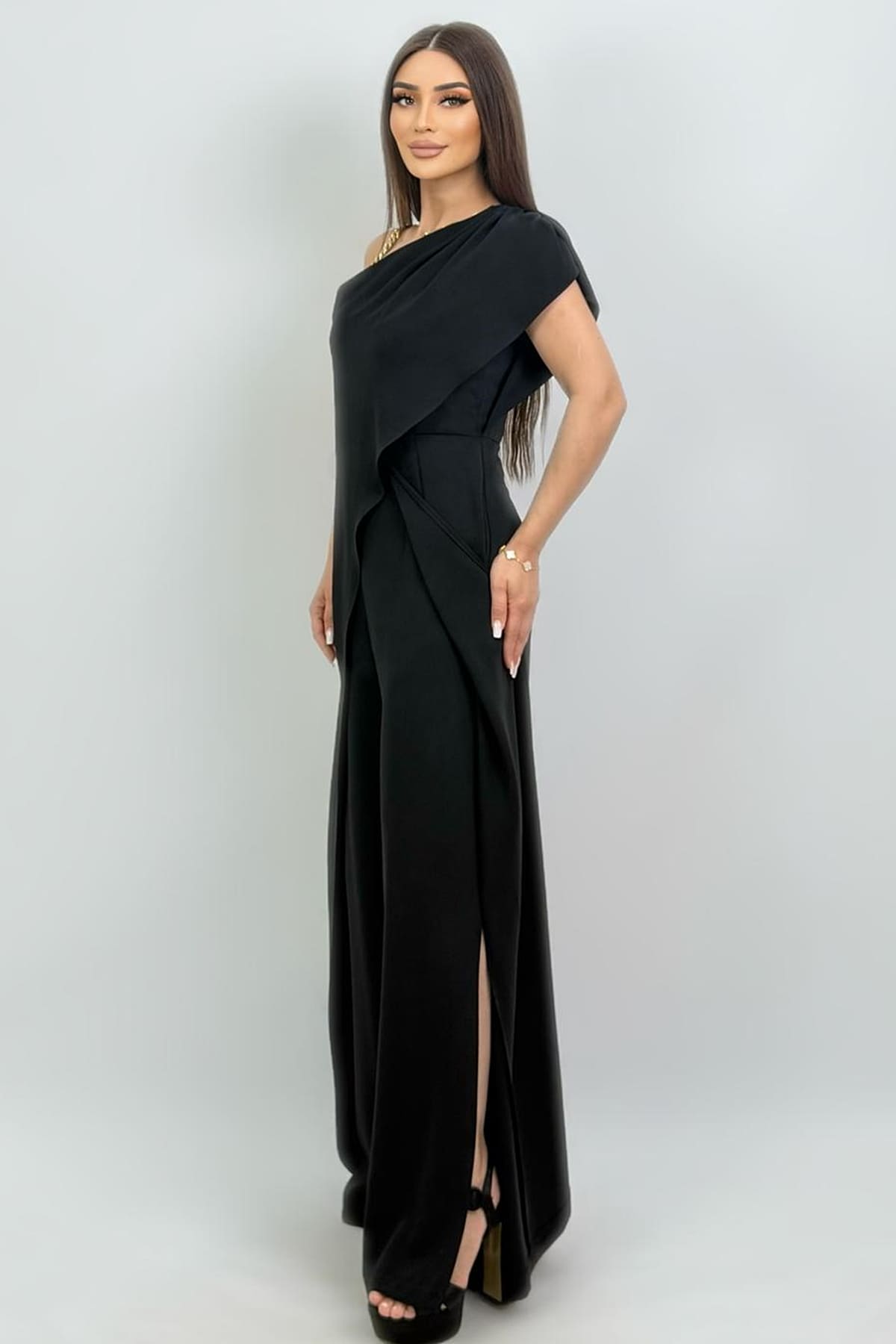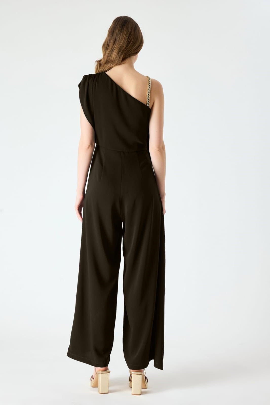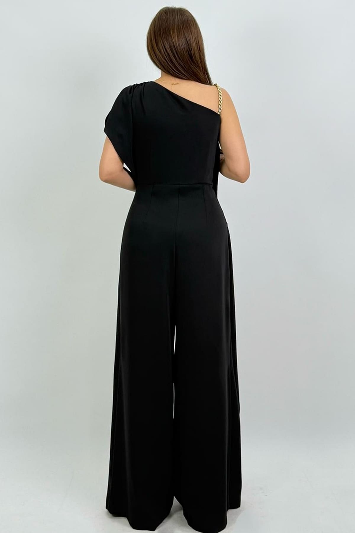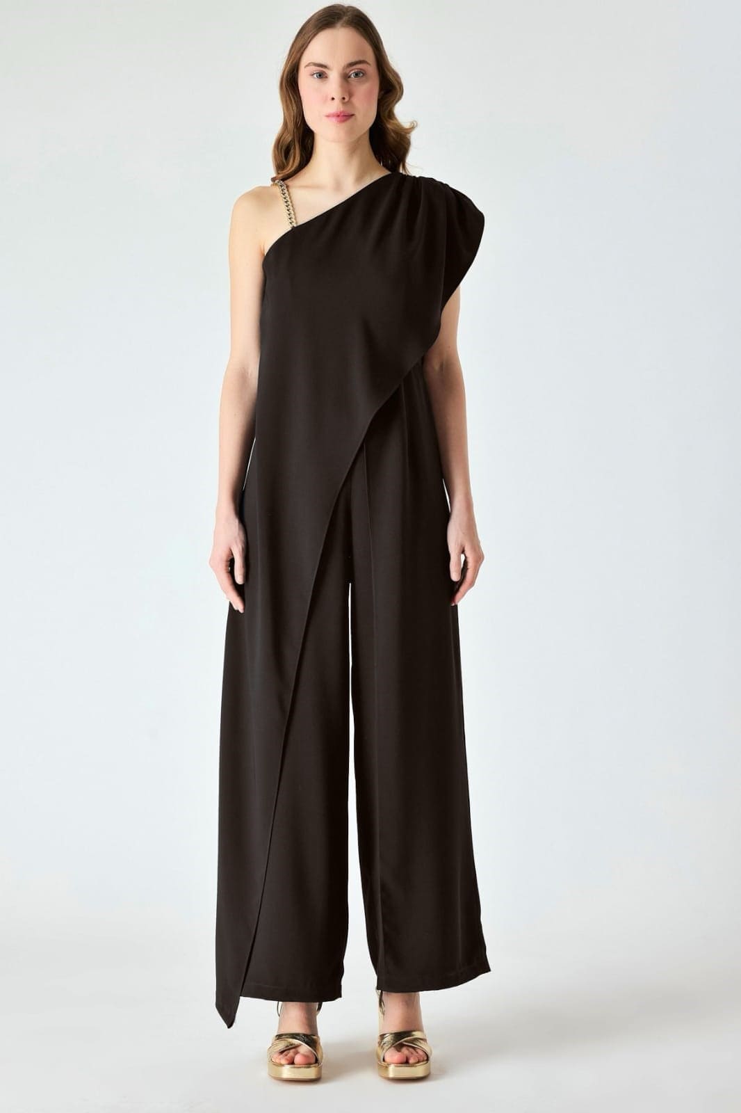 Tek omuzu zincir detaylı asimetrik tulum
