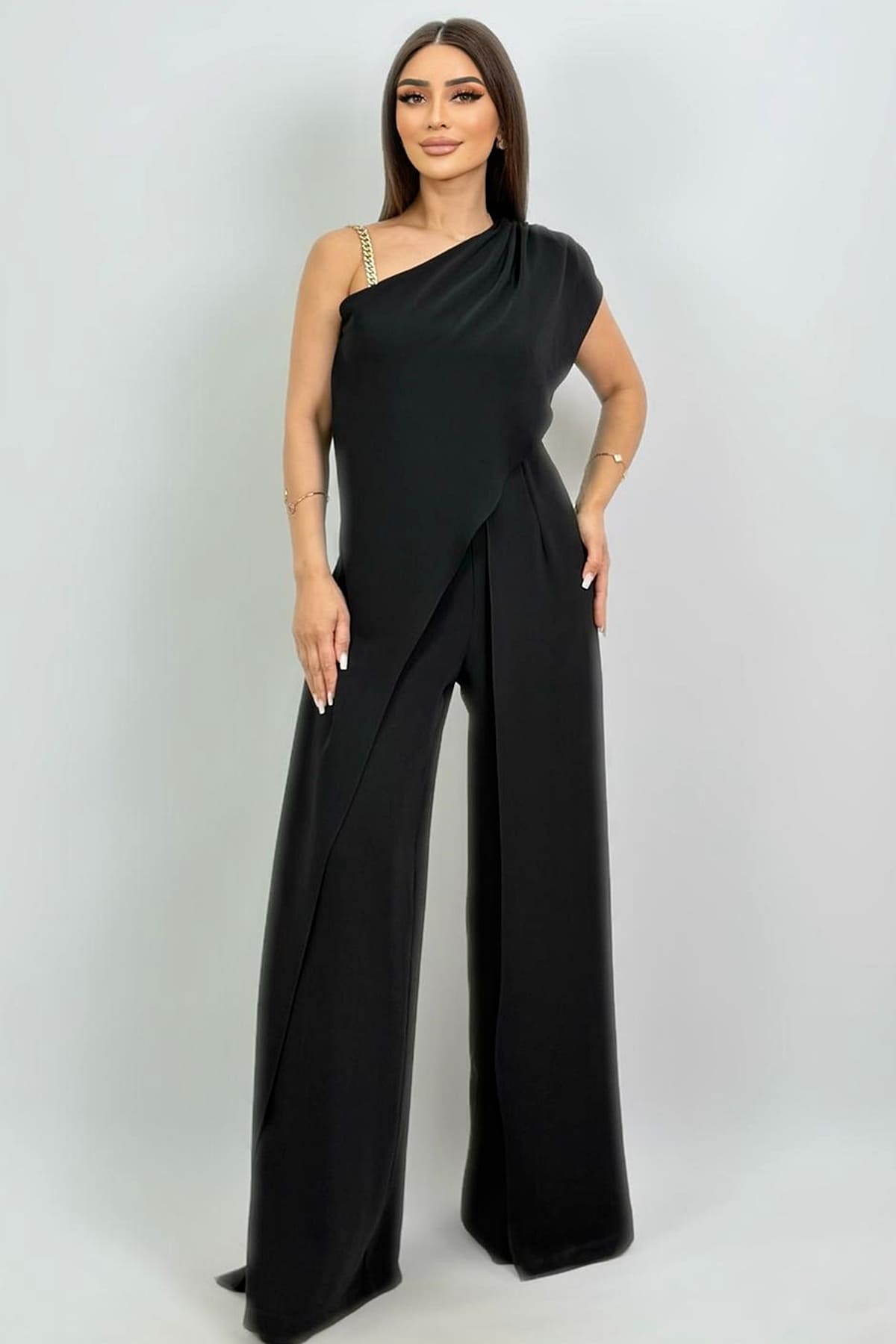 ÜRÜN BİLGİSİ:Dökümlü kumaş,tek omuzu zincir detaylı,asimetrik tulum.