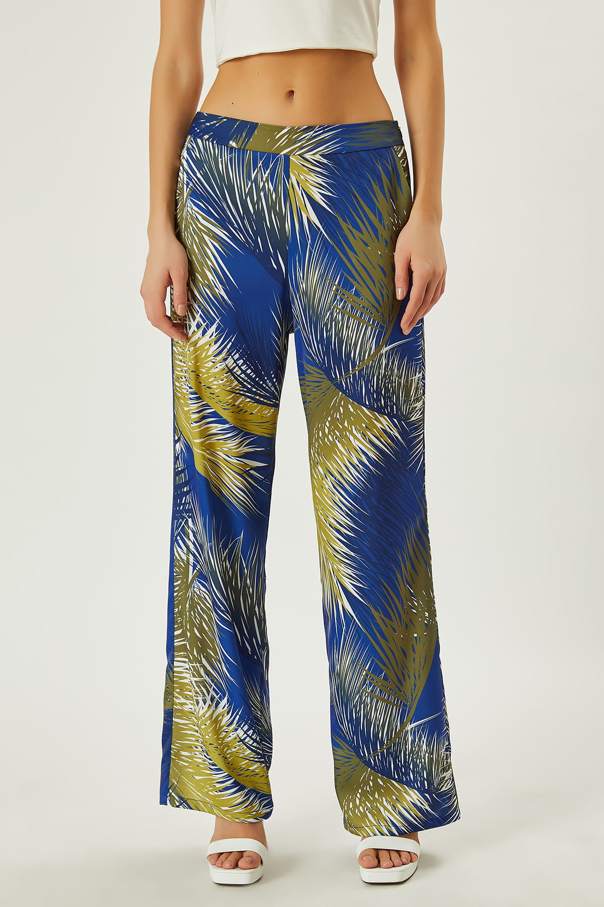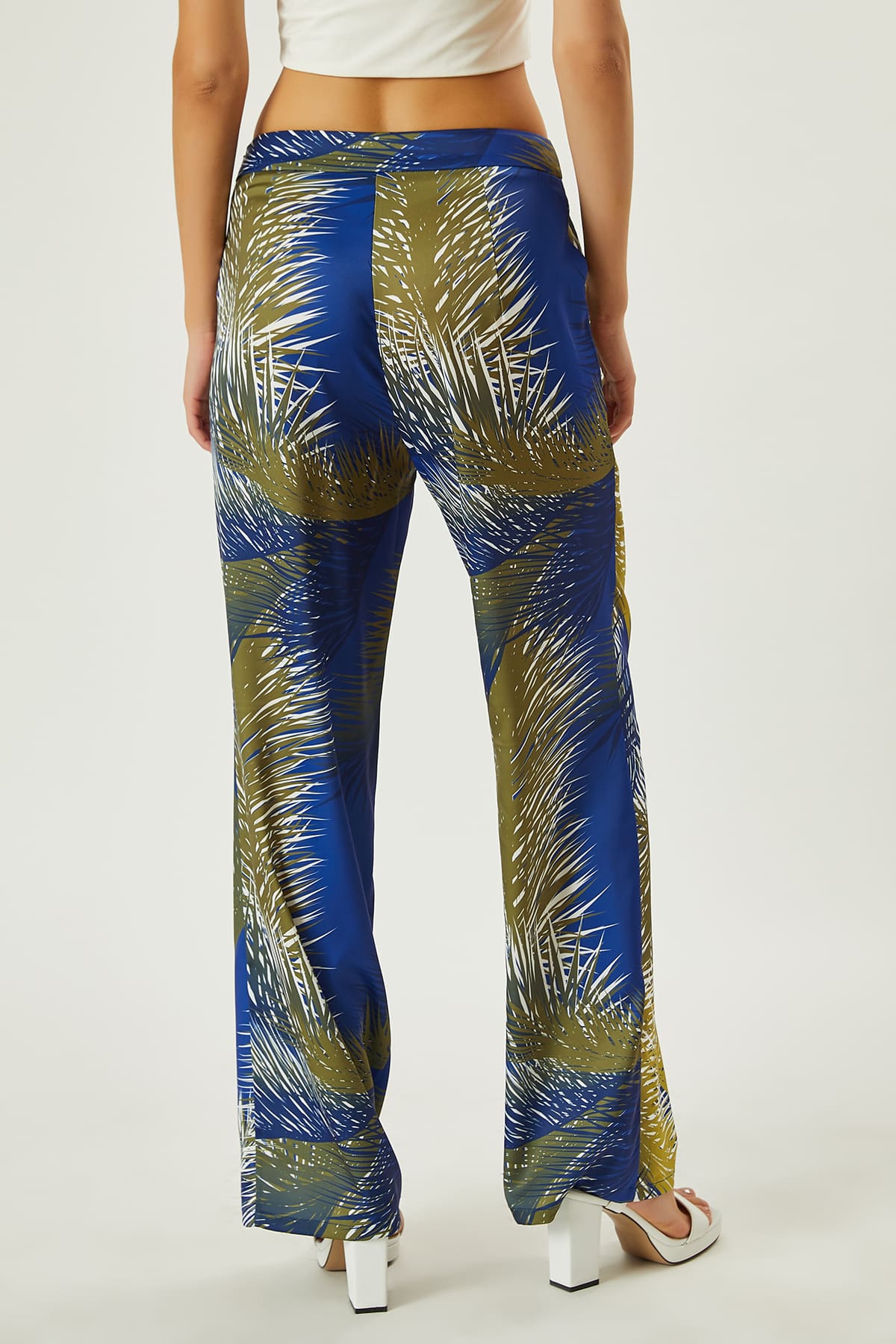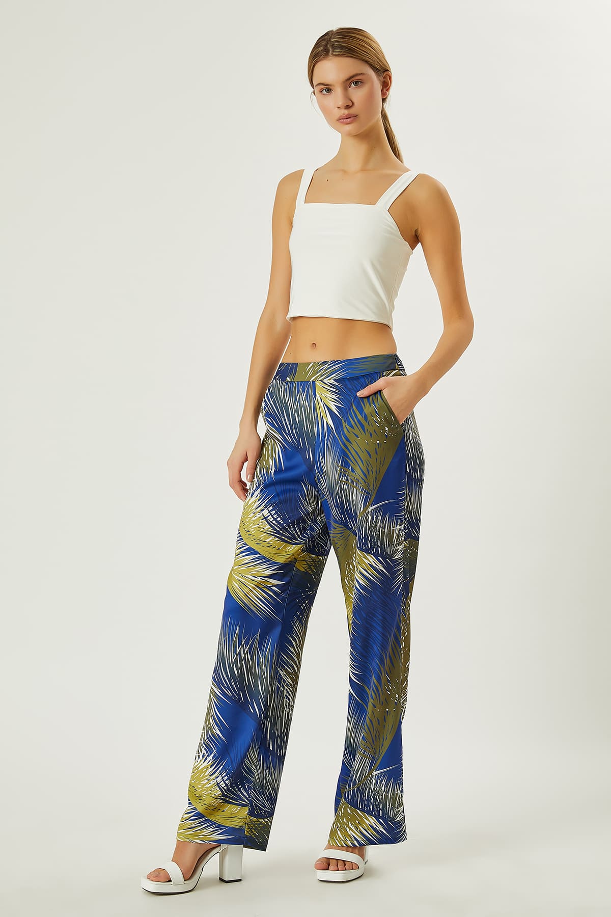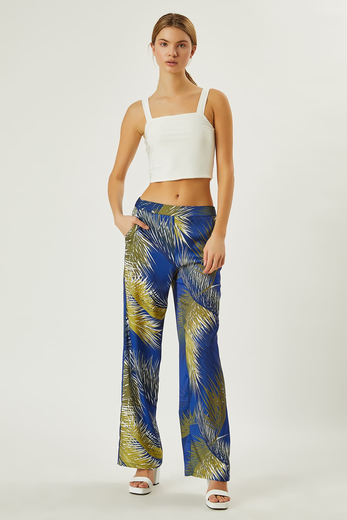 ÜRÜN BİLGİSİ:Mat saten yüzeyli,tropik desenli kumaş,yandan fermuarlı,hafif geniş paça pantolon