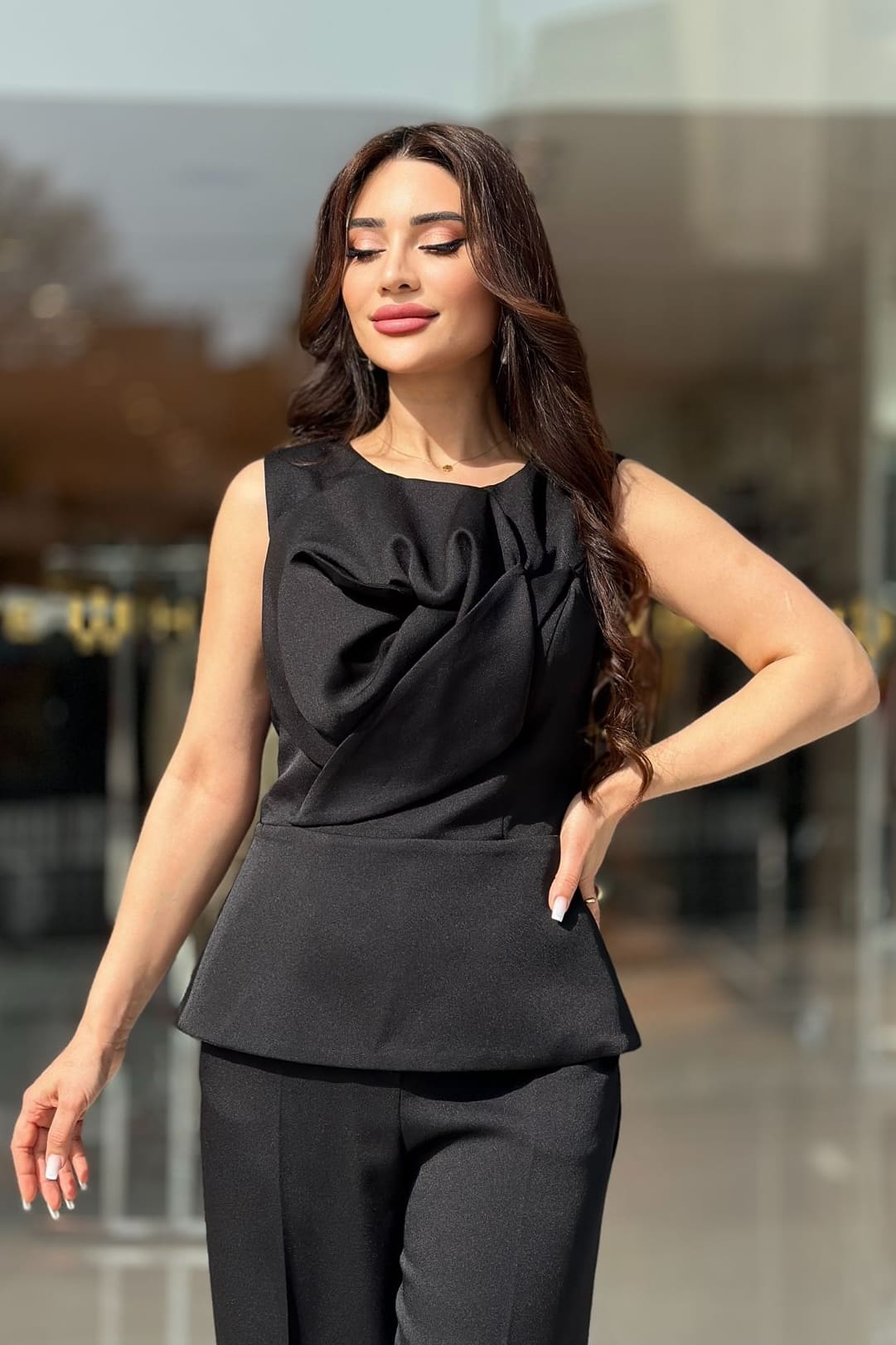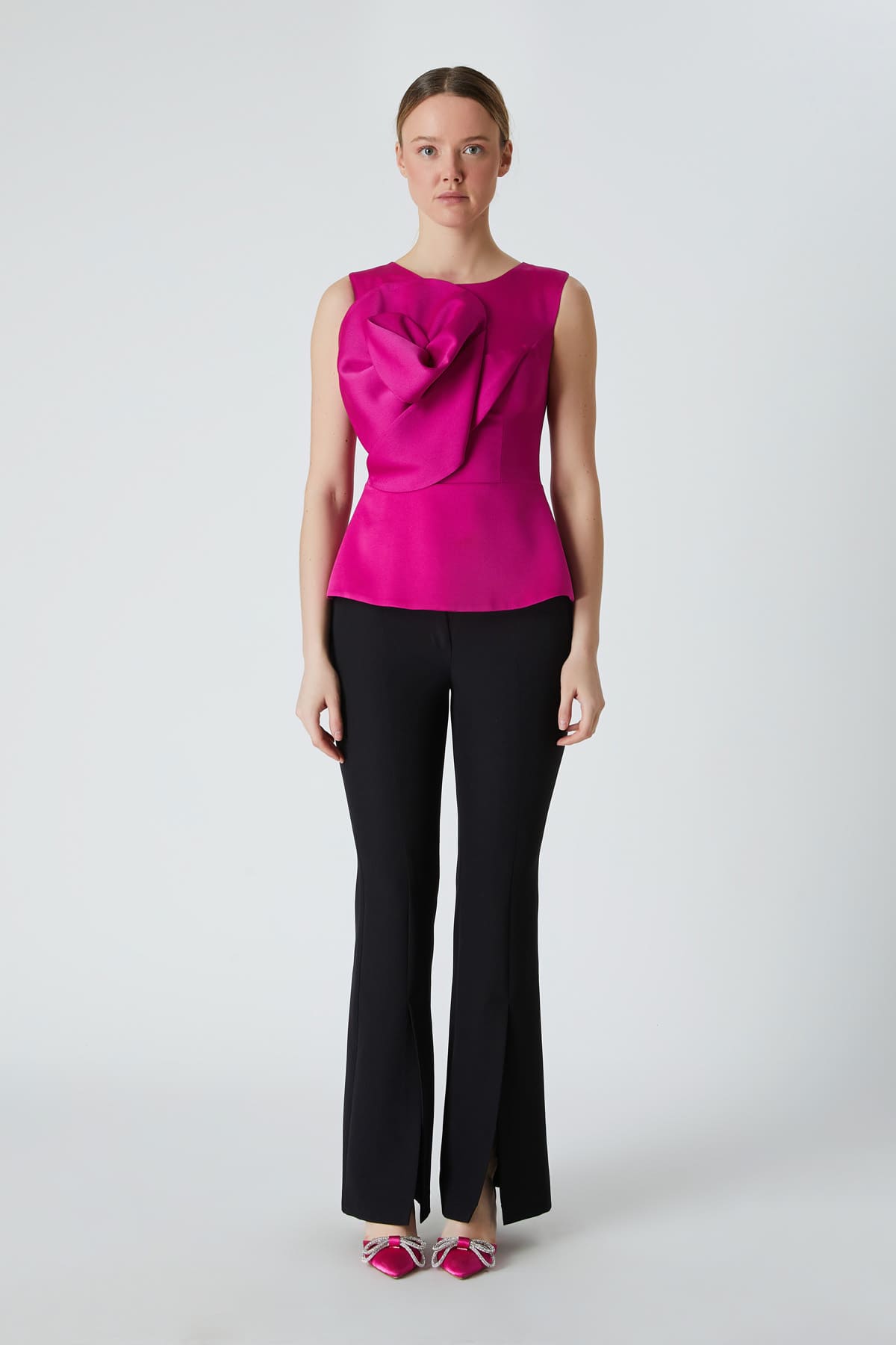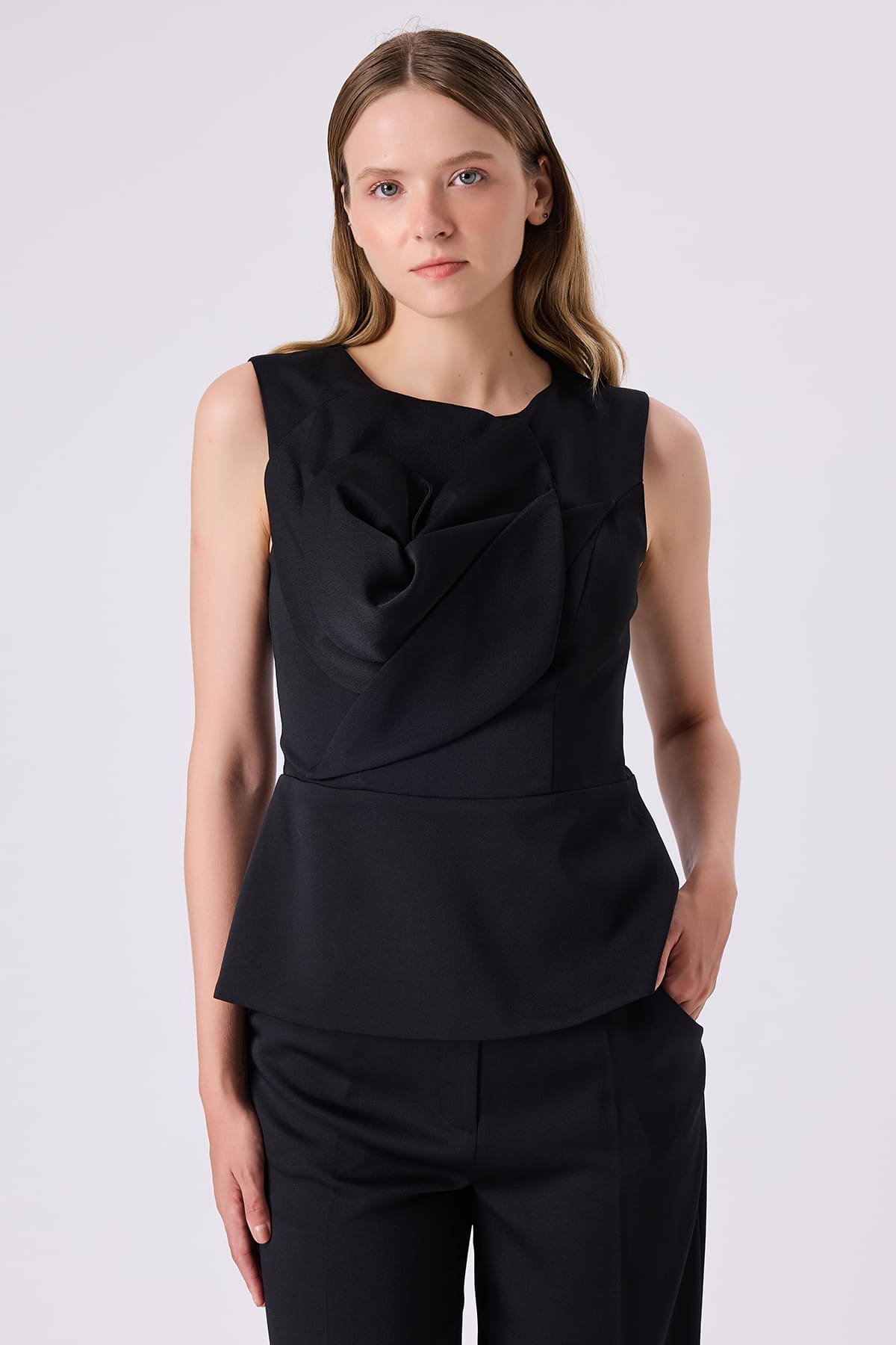 ÜRÜN BİLGİSİ:Parlak yüzeyli krep kumaş,bisiklet yakalı,kısa kollu,arka ortası metal fermuarlı,önü gül detaylı,fit form şık bluz.