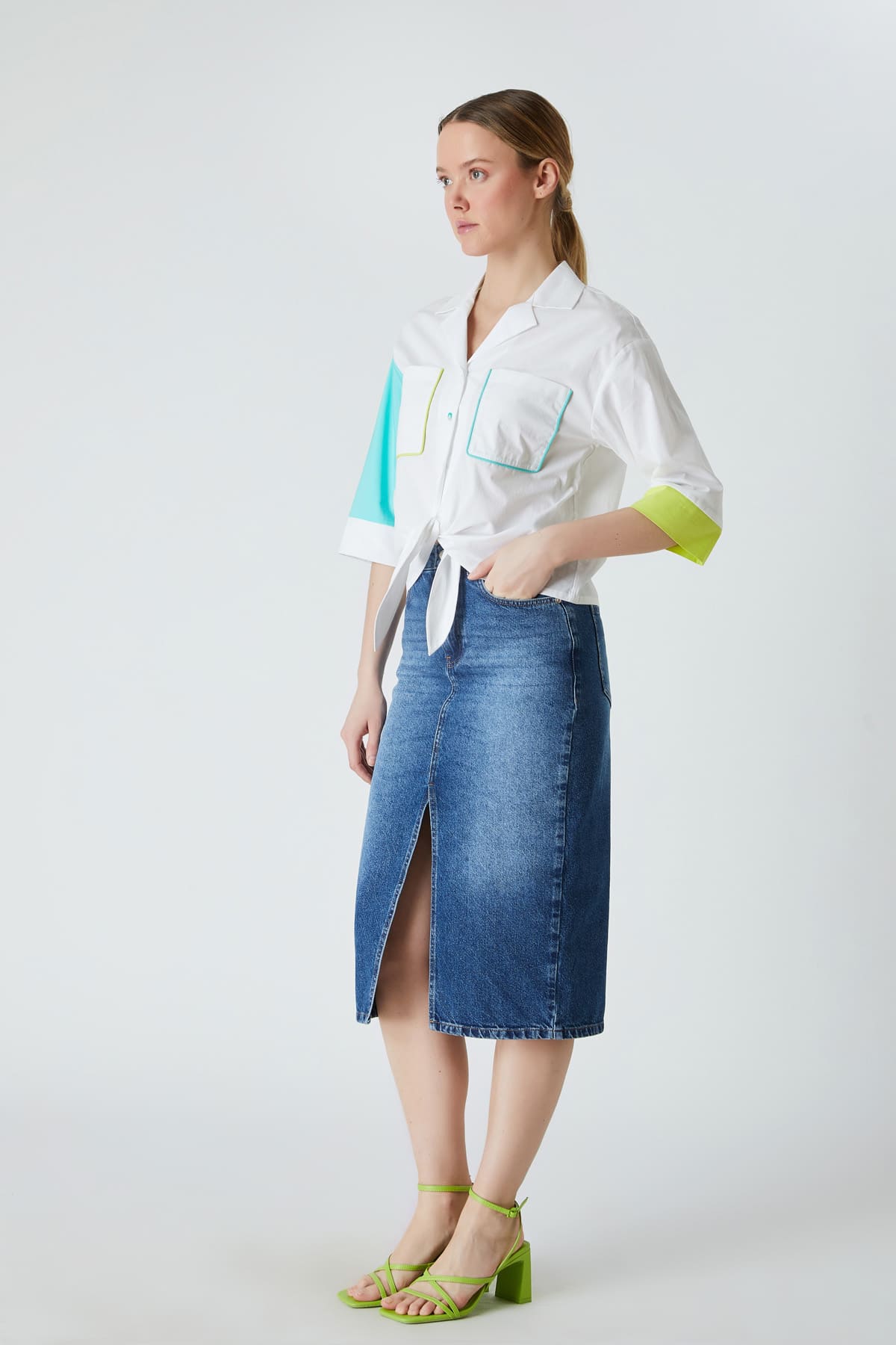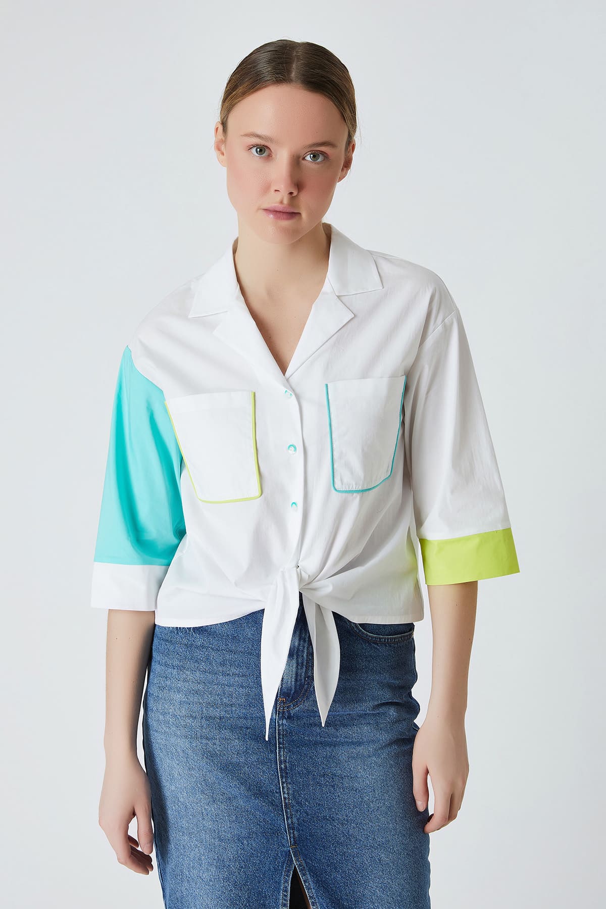 ÜRÜN BİLGİSİ:Pamuk karışımlı kumaş,açık yakalı,düğmeli,kol ucu bantlı,cepleri biye detaylı,etek ucu bağlamalı,çok renkli düz form gömlek.