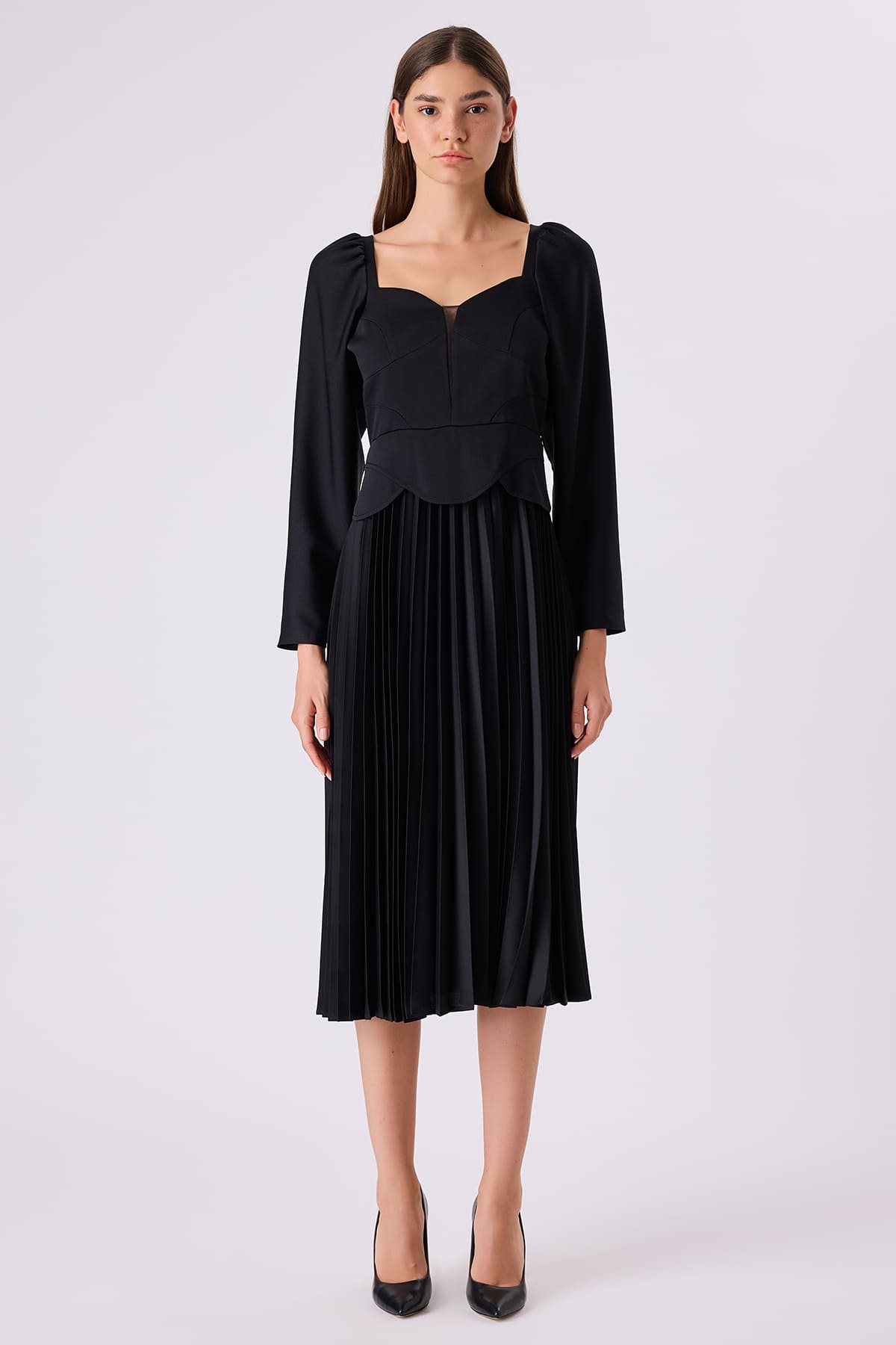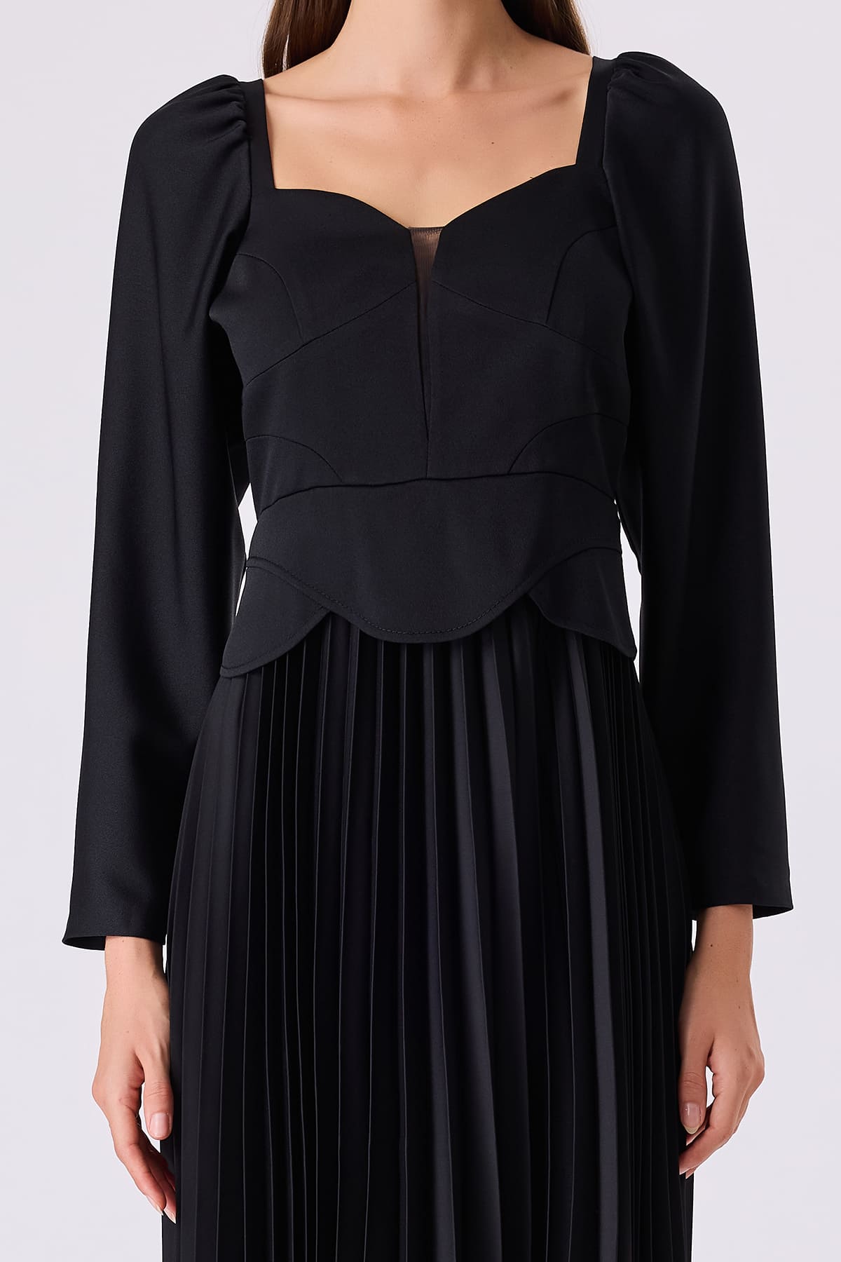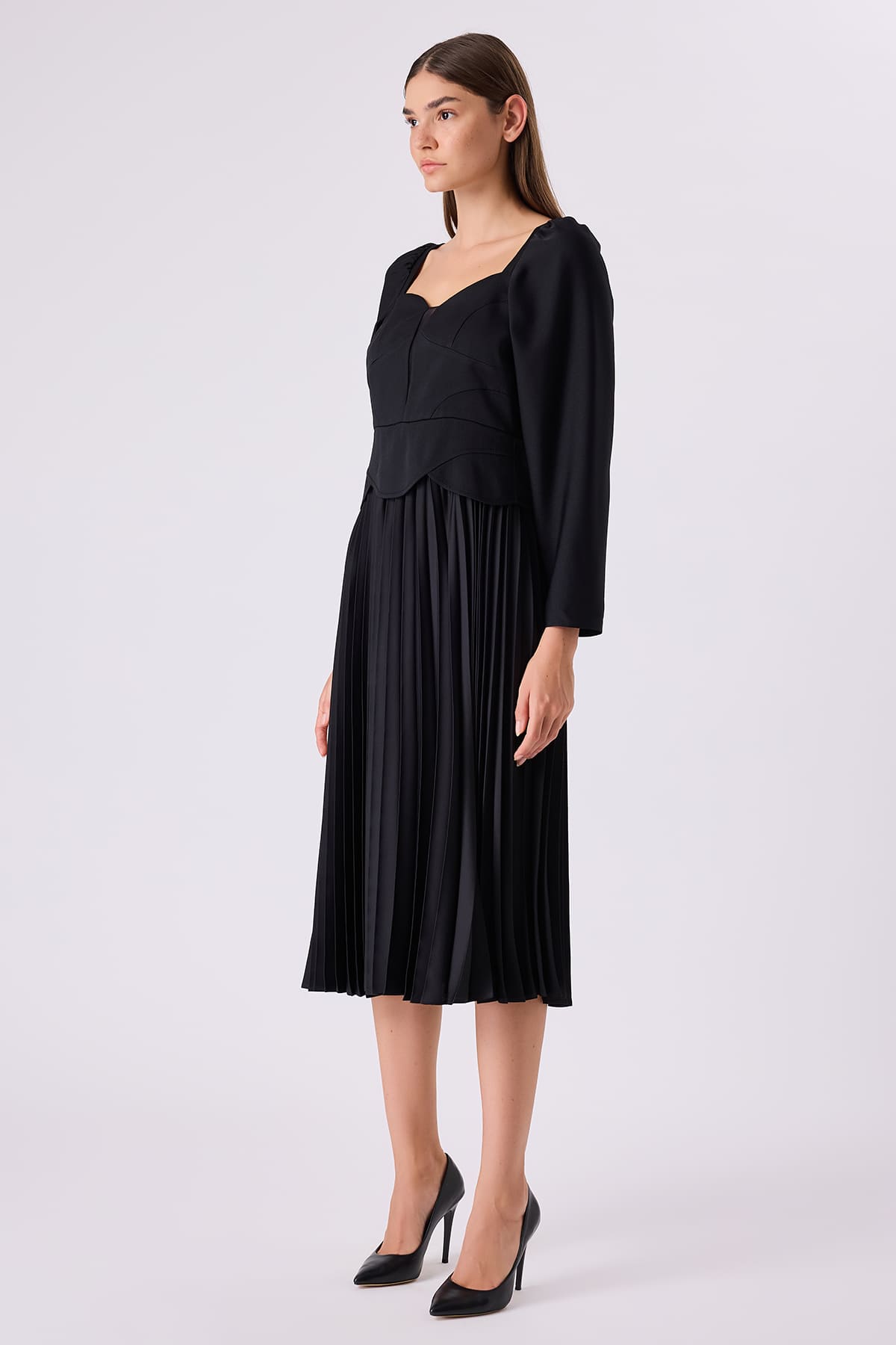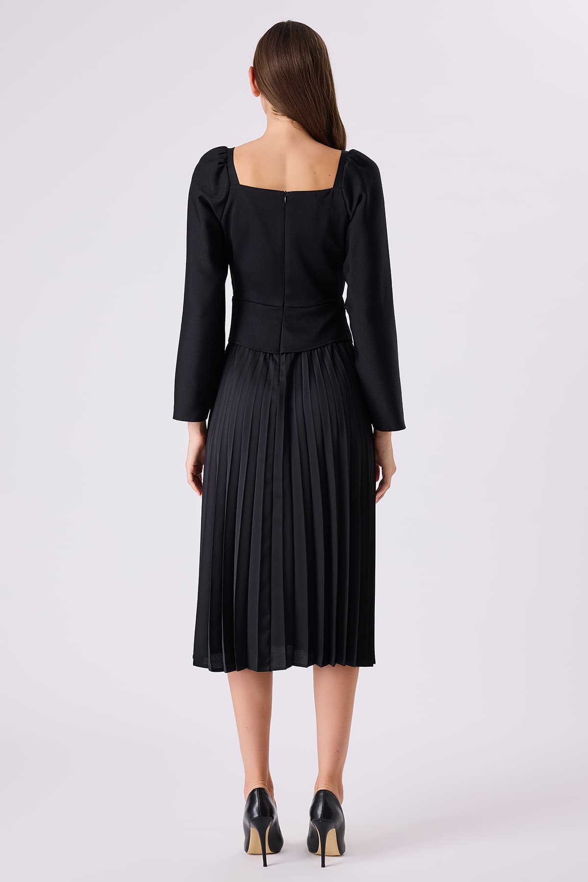 Uzun kollu pileli siyah elbise